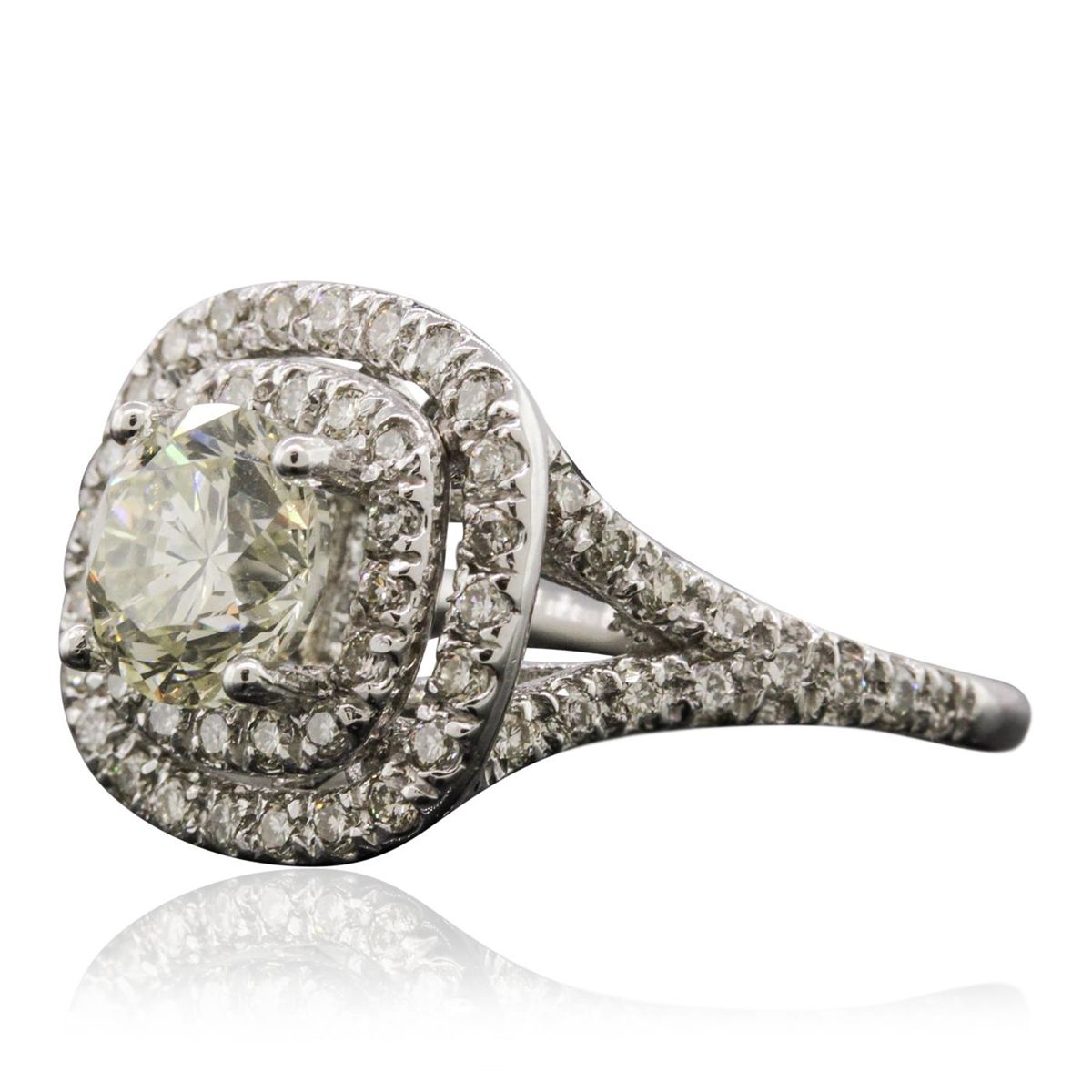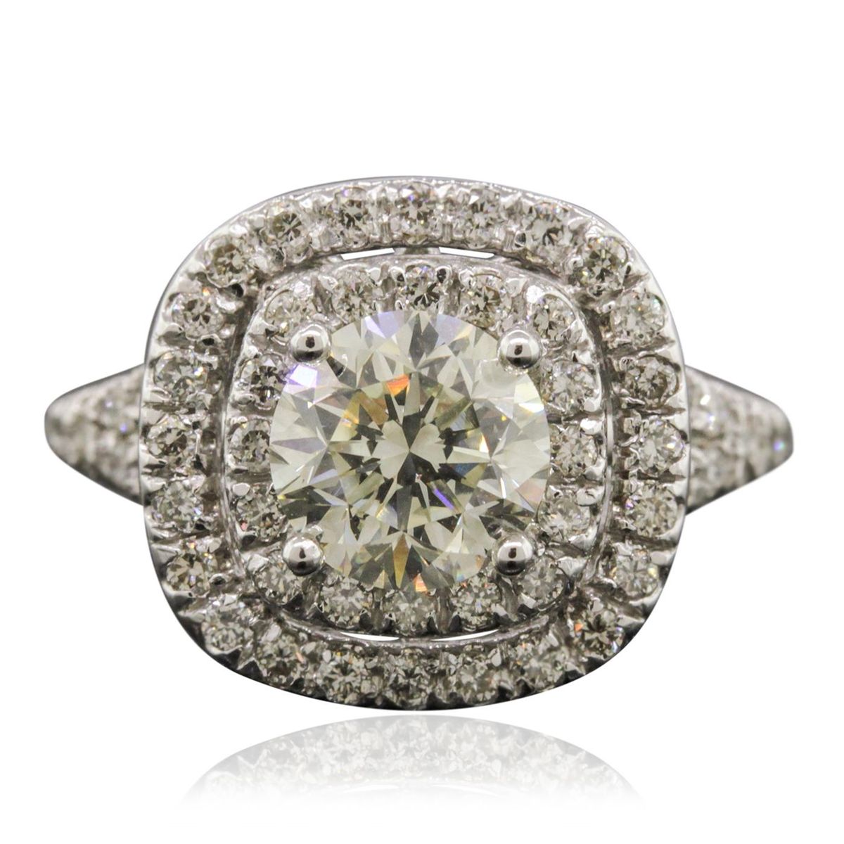 One electronically tested 14KT white gold ladies cast diamond unity ring with a bright polish finish. Condition is new, good workmanship. The featured diamond is set within two tiered diamond bezels supported by diamond set split shoulders, completed by a one and one-half millimeter wide band. Identified with markings of "14K". Containing: One prong set round brilliant cut diamond, measuring 7.14 - 7.12 x 4.92mm approximate weight of 1.71ct with a faint yellow fluorescence. EGL Report attached. Graded in the EGL Laboratory Report #US 911348434D. Clarity: SI-1. Color: J - Depth 69.0%. Table 57.0%. Sixty-Four prong set round brilliant cut diamonds, measuring 1.50 - 1.40 x 0.87mm (depth est.) approximate. Total Weight of 64 Stones = 0.74ct. EGL Report attached. Graded in the EGL Laboratory Report #US 911348434D. Clarity: SI-1 to SI-2. Color: H - I. Total Weight of Diamonds 2.45ct. Total Weight of Unity Ring 5.24 grams. AIG Appraised at $39,610.00.