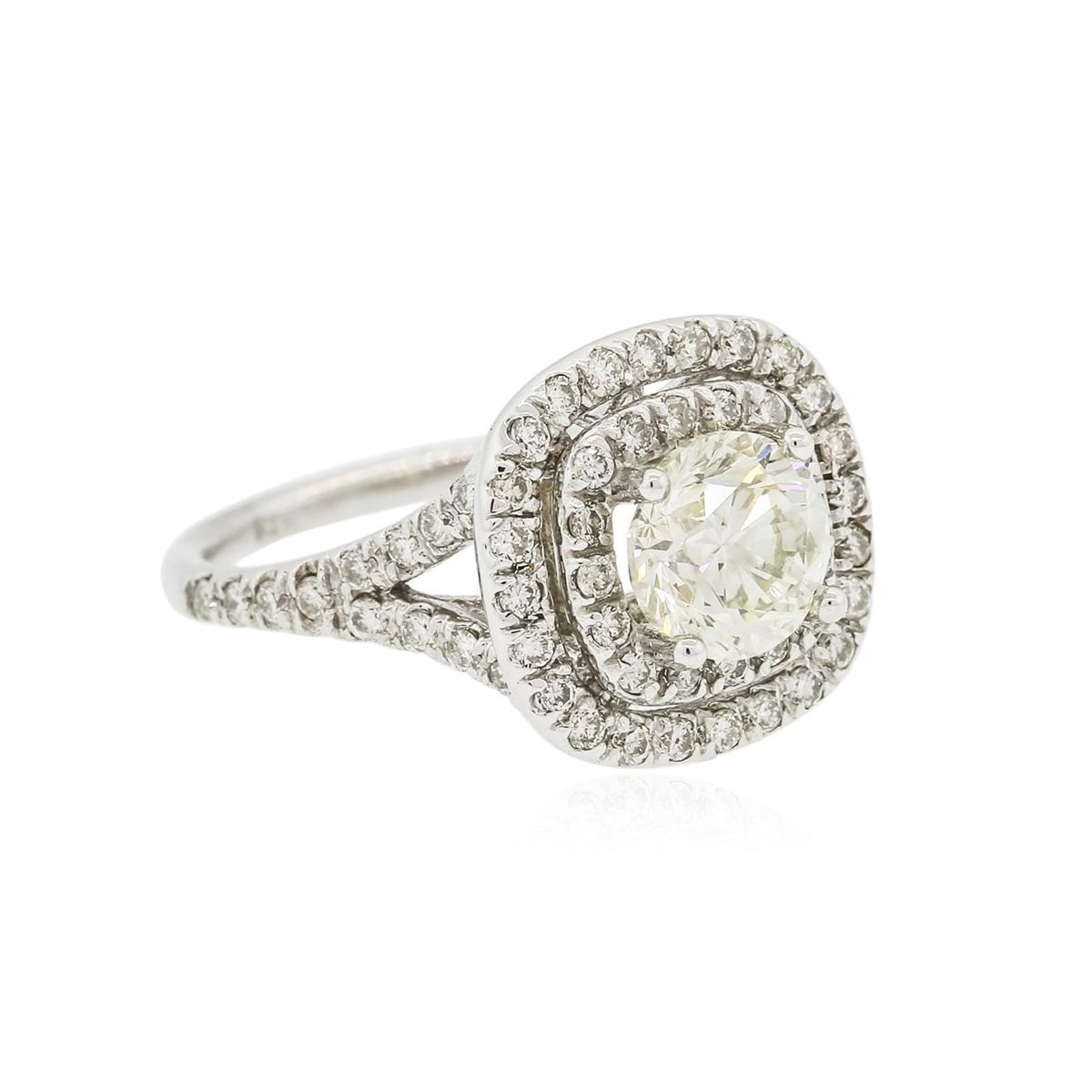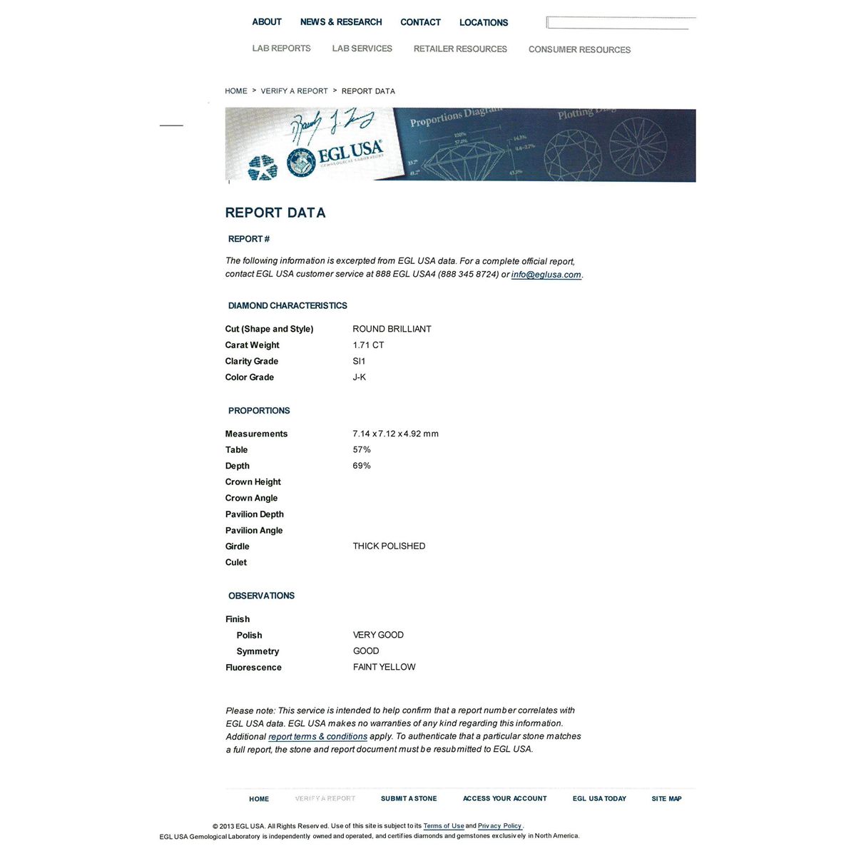 One electronically tested 14KT white gold ladies cast diamond unity ring with a bright polish finish. Condition is new, good workmanship. The featured diamond is set within two tiered diamond bezels supported by diamond set split shoulders, completed by a one and one-half millimeter wide band. Identified with markings of "14K". Containing: One prong set round brilliant cut diamond, measuring 7.14 - 7.12 x 4.92mm approximate weight of 1.71ct with a faint yellow fluorescence. EGL Report attached. Graded in the EGL Laboratory Report #US 911348434D. Clarity: SI-1. Color: J - Depth 69.0%. Table 57.0%. Sixty-Four prong set round brilliant cut diamonds, measuring 1.50 - 1.40 x 0.87mm (depth est.) approximate. Total Weight of 64 Stones = 0.74ct. EGL Report attached. Graded in the EGL Laboratory Report #US 911348434D. Clarity: SI-1 to SI-2. Color: H - I. Total Weight of Diamonds 2.45ct. Total Weight of Unity Ring 5.24 grams. AIG Appraised at $39,610.00.