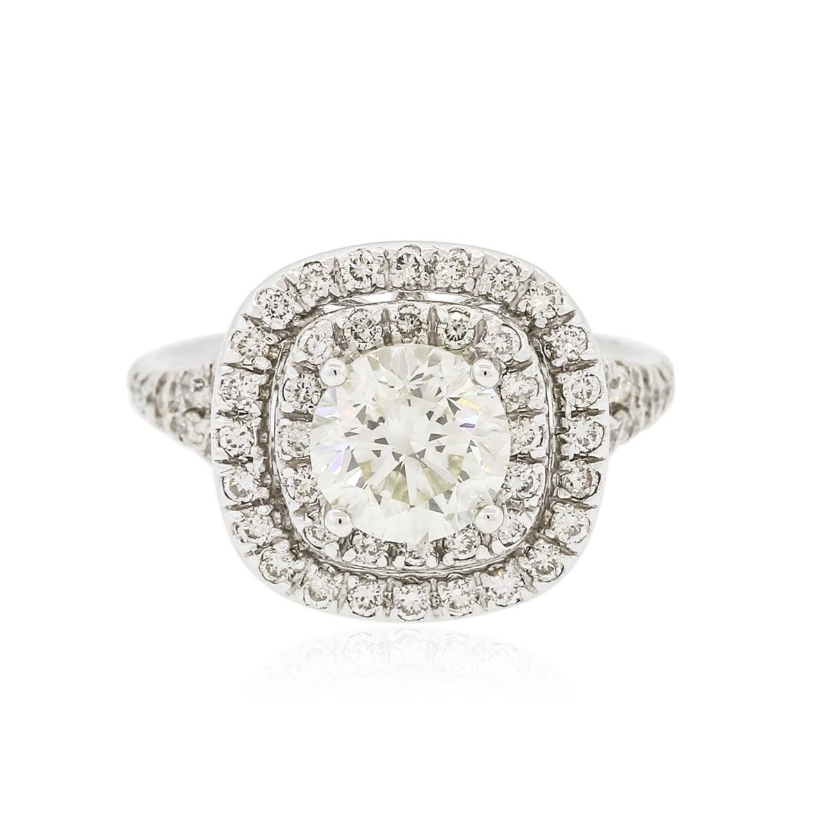 One electronically tested 14KT white gold ladies cast diamond unity ring with a bright polish finish. Condition is new, good workmanship. The featured diamond is set within two tiered diamond bezels supported by diamond set split shoulders, completed by a one and one-half millimeter wide band. Identified with markings of "14K". Containing: One prong set round brilliant cut diamond, measuring 7.14 - 7.12 x 4.92mm approximate weight of 1.71ct with a faint yellow fluorescence. EGL Report attached. Graded in the EGL Laboratory Report #US 911348434D. Clarity: SI-1. Color: J - Depth 69.0%. Table 57.0%. Sixty-Four prong set round brilliant cut diamonds, measuring 1.50 - 1.40 x 0.87mm (depth est.) approximate. Total Weight of 64 Stones = 0.74ct. EGL Report attached. Graded in the EGL Laboratory Report #US 911348434D. Clarity: SI-1 to SI-2. Color: H - I. Total Weight of Diamonds 2.45ct. Total Weight of Unity Ring 5.24 grams. AIG Appraised at $39,610.00.