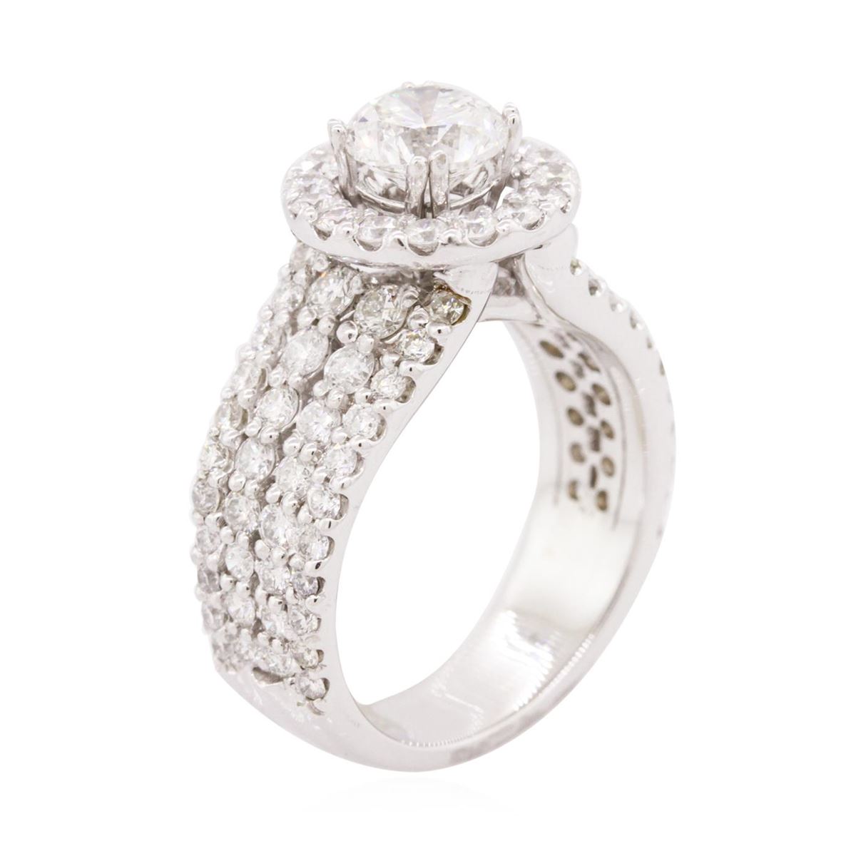One electronically tested 14KT white gold ladies cast diamond unity ring with a bright polish finish. The featured diamond is set within a diamond bezel supported by diamond set shoulders, completed by a five millimeter wide band. Identified with markings of "14K". Condition is new, good workmanship. Containing: One prong set round brilliant cut diamond, measuring 6.38 - 6.28 x 4.19mm exact weight 1.10ct. EGL Report attached. Graded loose prior to setting in the EGL Laboratory Report #US 72941002D. Clarity: SI-2. Color: D. Depth 66.2%. Table 64.0%. Pavil. Depth%. 45.0%. Ninety-Two prong set round brilliant cut diamonds, measuring 2.10 - 1.50 x 1.08mm (depth est.) approximate total weight of 92 Stones = 2.00ct. Graded in the setting. Clarity: SI-1 to I-1. Color: G - I. Total Weight of Diamonds 3.10ct. Total Weight of Ring 9.17 grams. AIG Appraised at $35,175.00.
