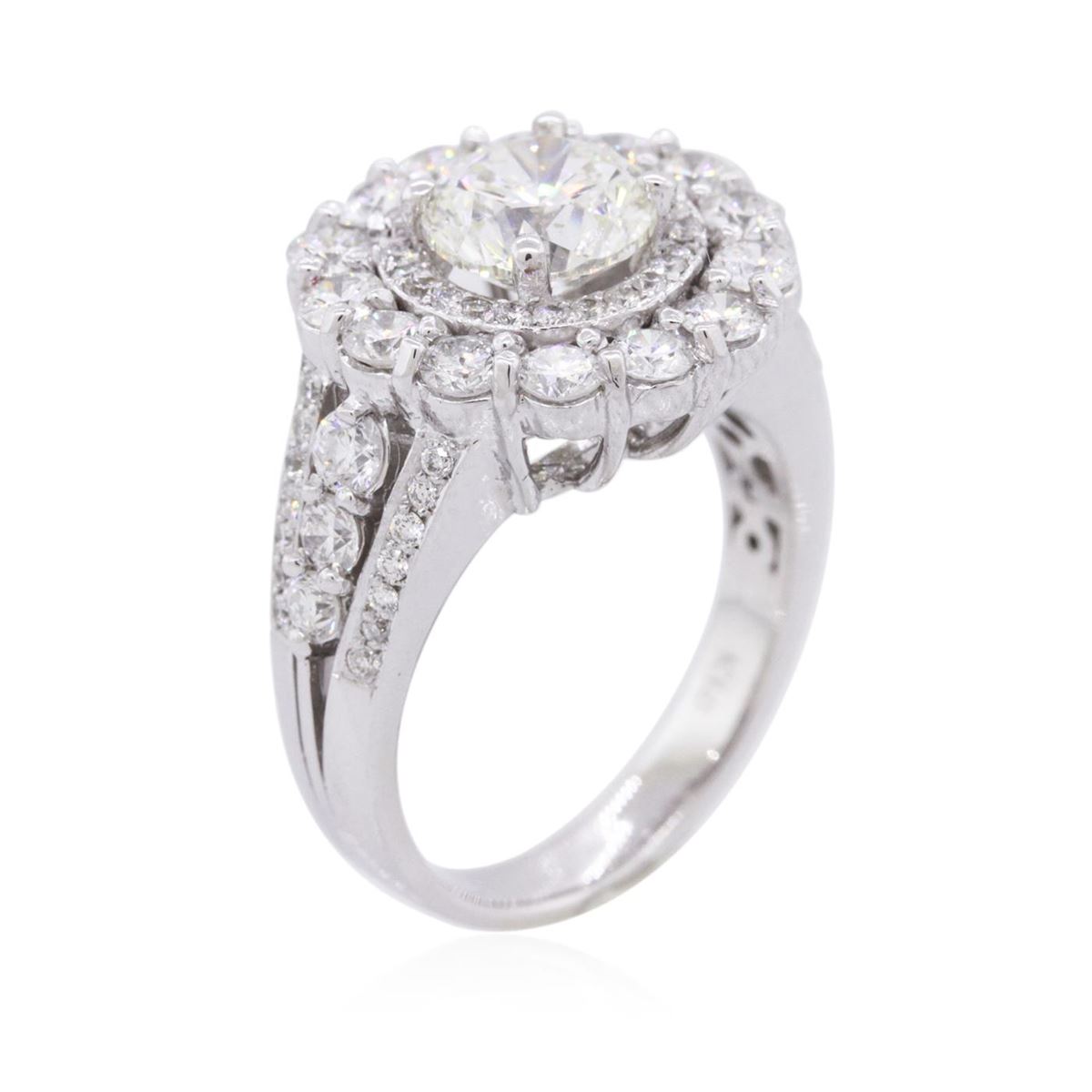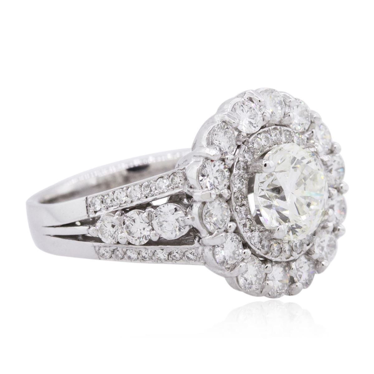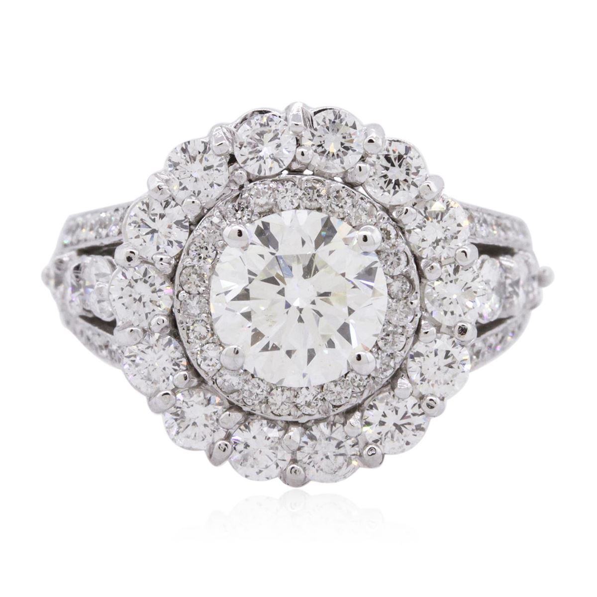One electronically tested 14KT white gold ladies cast diamond unity ring with a bright polish finish. The featured diamond is set within two diamond bezels supported by elaborate diamond set shoulders, completed by a three millimeter wide band. Identified with markings of "K14". Condition is new, good workmanship. Containing: One prong set round brilliant cut diamond, measuring 7.37 - 7.31 x 4.84mm exact weight 1.72ct. EGL Report attached. Graded loose prior to setting in the EGL Laboratory Report #US 77991104D. Clarity: SI-1. Color: I. Depth 65.9%. Table 59.0%. Pavil. Depth% 43.2%. Twenty prong set round brilliant cut diamonds, measuring 2.70 - 2.60 x 1.59mm (depth est.) approximate total weight of 20 Stones = 1.46ct. Graded in the setting. Clarity: SI-1 to SI-2. Color: G - H Fifty-Two prong set round brilliant cut diamonds, measuring 1.30 - 1.20 x 0.75mm (depth est.) approximate total weight of 52 Stones = 0.47ct. Graded in the setting. Clarity: SI-1 to SI-2. Color: G - H. Total Weight of Diamonds 3.65ct. Total Weight of Ring 8.90 grams. AIG Appraised at $35,045.00.