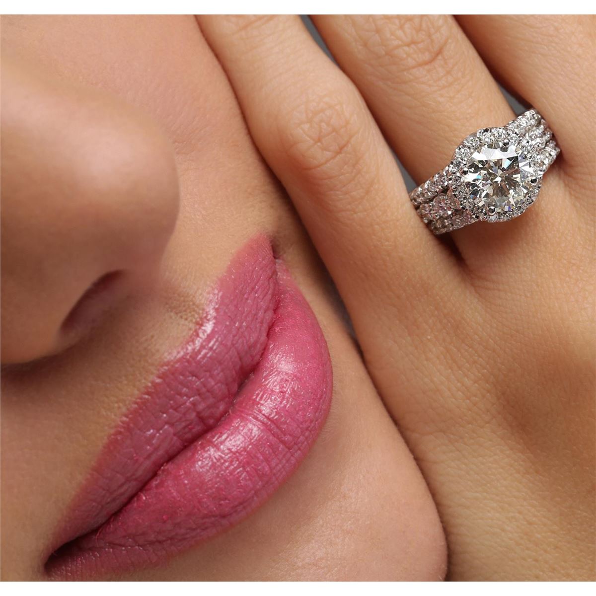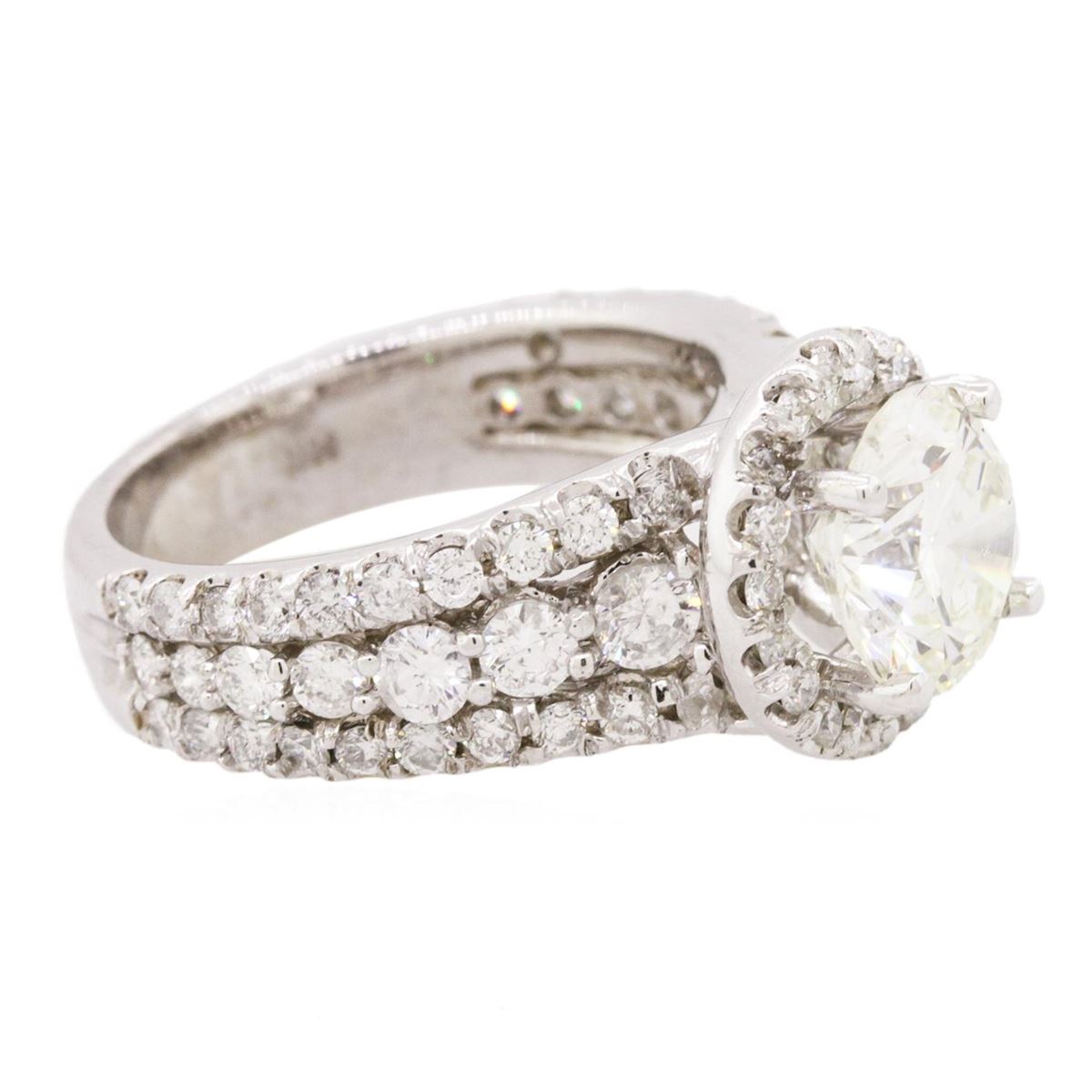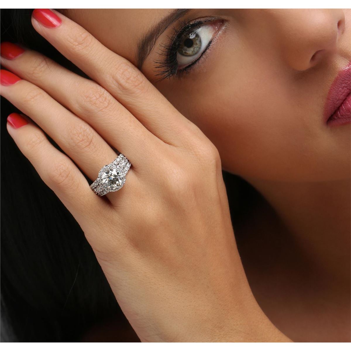 One electronically tested 14KT white gold ladies cast diamond unity ring with a bright polish finish. The featured diamond is set within a diamond bezel supported by diamond set shoulders, completed by a four and one-half millimeter wide band. Identified with markings of "14K". Condition is new, good workmanship. Containing: One prong set round brilliant cut diamond, measuring 8.40 - 8.33 x 5.05mm exact weight 2.18ct. EGL Report attached. Graded loose prior to setting in the EGL Laboratory Report #US 907098701D. Clarity: SI-1. Color: 60.4%. Table 62.0%. Pavil. Depth%. 42.8%. Ten prong set round brilliant cut diamonds, measuring 3.00 - 2.40 x 1.62mm (depth est.) approximate total weight of 10 Stones = 0.82ct. Graded in the setting. Clarity: SI-1 to I-1. Color: G - H Sixty-Two prong set round brilliant cut diamonds, measuring 1.70 - 1.50 x 0.96mm (depth est.) approximate total weight of 62 Stones = 1.02ct. Graded in the setting. Clarity: SI-1 to I-1. Color: G - H. Total Weight of Diamonds 4.02ct. Total Weight of Ring 7.82 grams. AIG Appraised at $53,385.00.