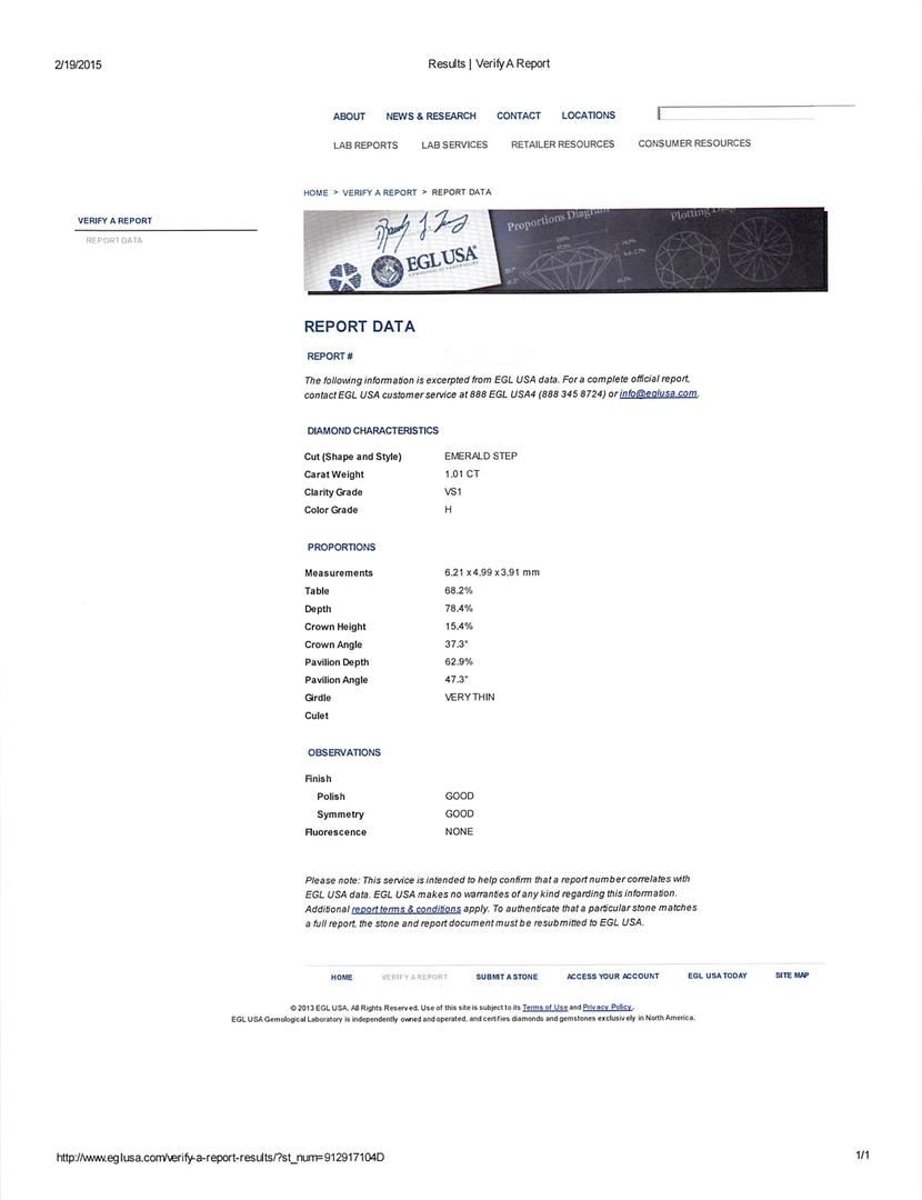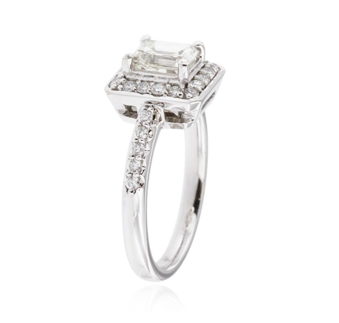 One electronically tested 14KT white gold ladies cast diamond unity ring with a bright polish finish. The featured diamond is set within a diamond bezel supported by diamond set shoulders, completed by a two millimeter wide band. Identified with markings of "14K". Condition is new, good workmanship. Containing: One prong set emerald shaped cut diamond, measuring 6.21 x 4.99 x 3.91mm exact weight 1.01ct. EGL Report attached. Graded loose prior to setting in the EGL Laboratory Report #US 912917104D. Clarity: VS-1. Color: H. Depth 78.4%. Table 68.2%. Pavil. Depth%. 62.9%. Twenty-Eight prong set round brilliant cut diamonds, measuring 1.60 - 1.50 x 0.93mm (depth est.) approximate total weight of 28 Stones = 0.35ct. Graded in the setting. Clarity: SI-1 to SI-2. Color: G - I. Total Weight of Diamonds 1.36ct. Total Weight of Ring 5.00 grams. AIG Appraised at $11,270.00.