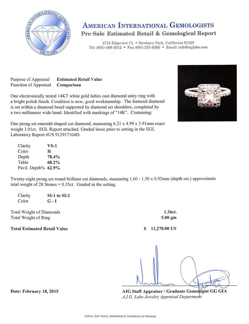 One electronically tested 14KT white gold ladies cast diamond unity ring with a bright polish finish. The featured diamond is set within a diamond bezel supported by diamond set shoulders, completed by a two millimeter wide band. Identified with markings of "14K". Condition is new, good workmanship. Containing: One prong set emerald shaped cut diamond, measuring 6.21 x 4.99 x 3.91mm exact weight 1.01ct. EGL Report attached. Graded loose prior to setting in the EGL Laboratory Report #US 912917104D. Clarity: VS-1. Color: H. Depth 78.4%. Table 68.2%. Pavil. Depth%. 62.9%. Twenty-Eight prong set round brilliant cut diamonds, measuring 1.60 - 1.50 x 0.93mm (depth est.) approximate total weight of 28 Stones = 0.35ct. Graded in the setting. Clarity: SI-1 to SI-2. Color: G - I. Total Weight of Diamonds 1.36ct. Total Weight of Ring 5.00 grams. AIG Appraised at $11,270.00.