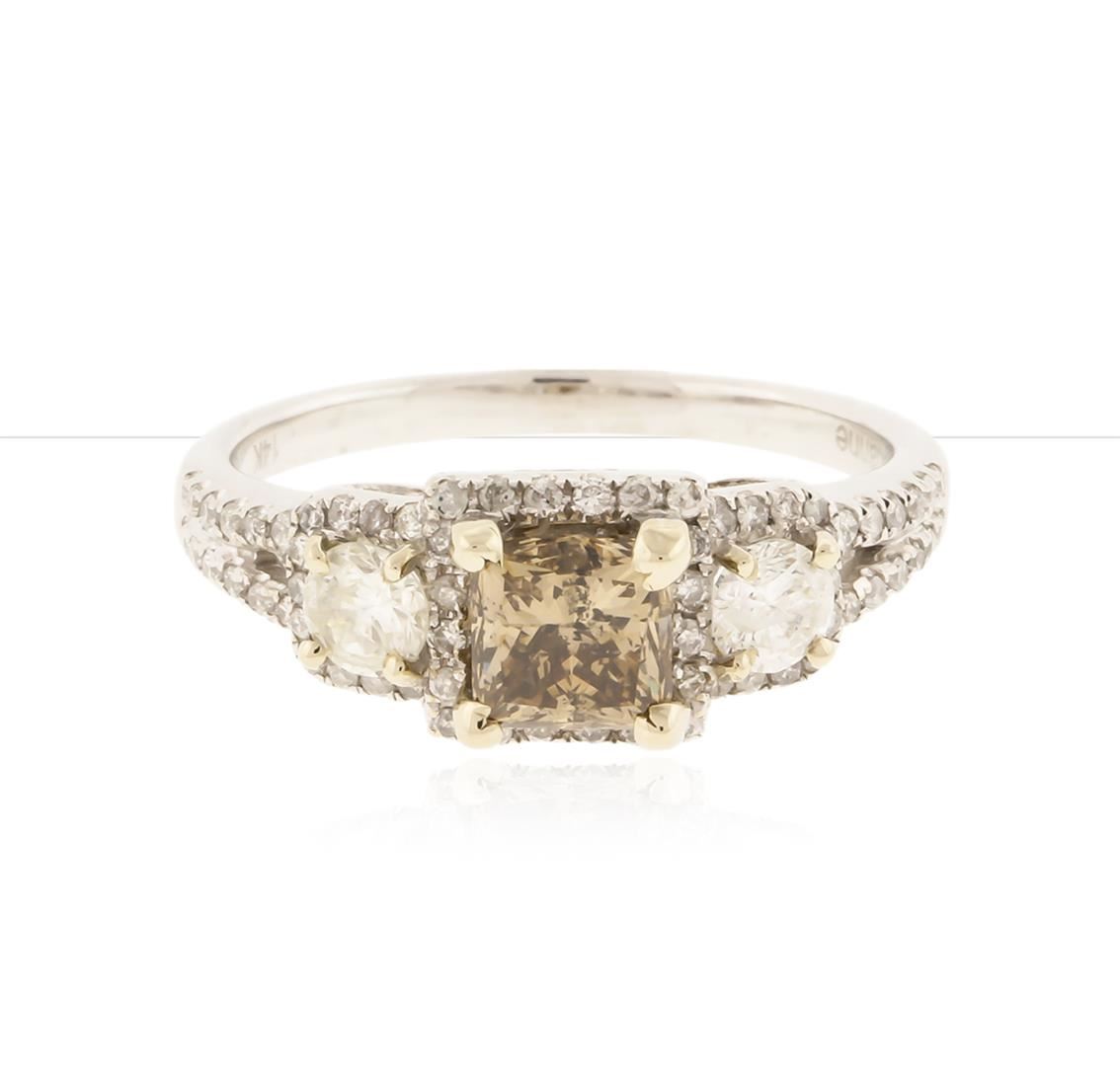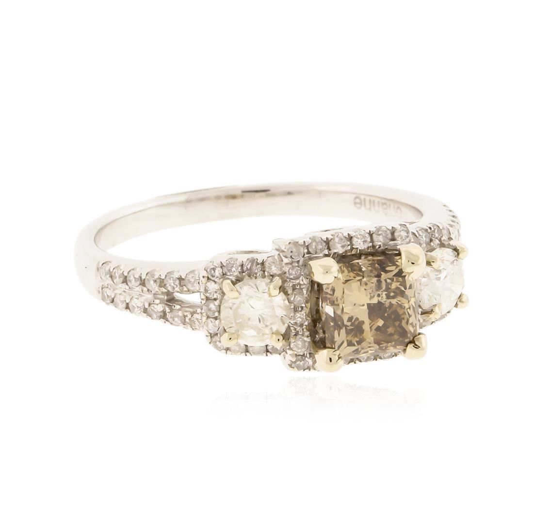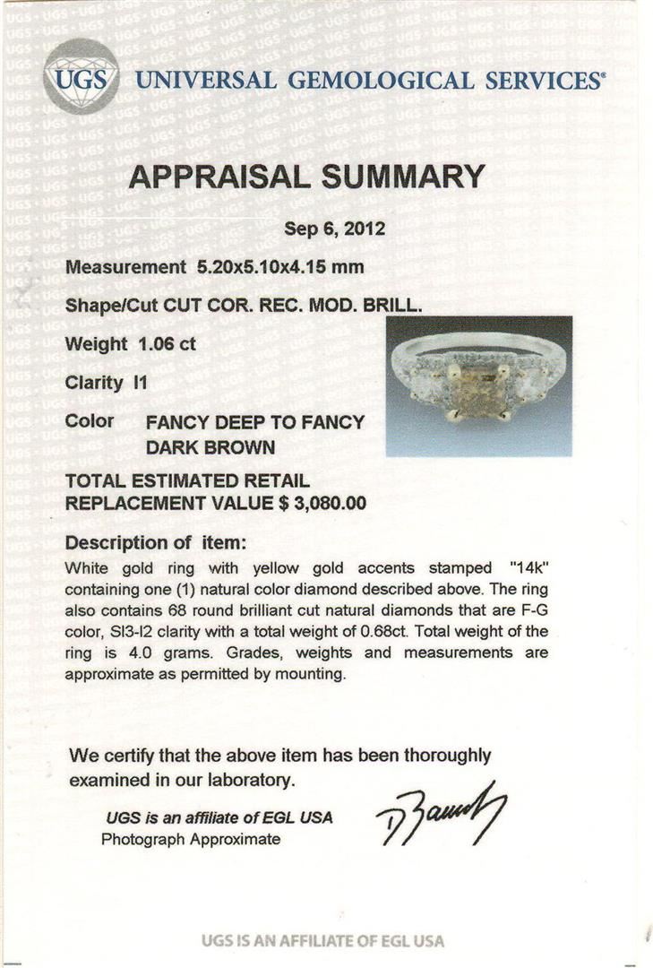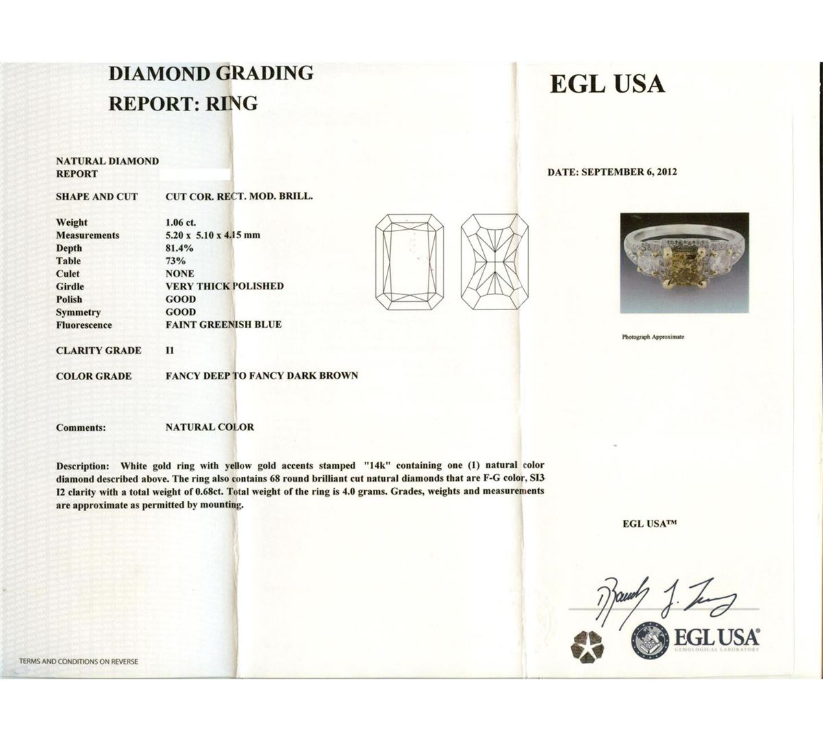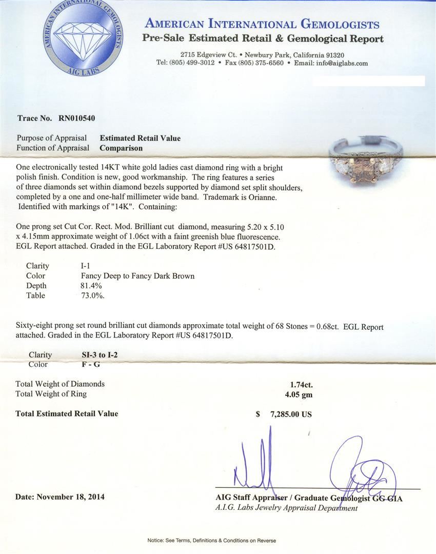 One electronically tested 14KT white gold ladies cast diamond ring with a bright polish finish. Condition is new, good workmanship. The ring features a series of three diamonds set within diamond bezels supported by diamond set split shoulders, completed by a one and one-half millimeter wide band. Trademark is Orianne. Identified with markings of "14K". Containing: One prong set Cut Cor. Rect. Mod. Brilliant cut diamond, measuring 5.20 x 5.10 x 4.15mm approximate weight of 1.06ct with a faint greenish blue fluorescence. EGL Report attached. Graded in the EGL Laboratory Report #US 64817501D. Clarity I-1, Color of Fancy Deep to Fancy Dark Brown. Sixty-eight prong set round brilliant cut diamonds approximate total weight of 68 stones = 0.68ct. Clarity SI-3 to I-2, Color F-G. AIG Appraised at $7,285.00.