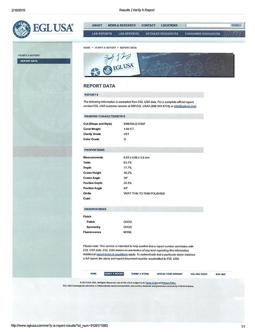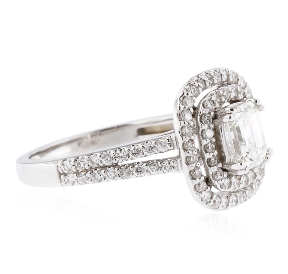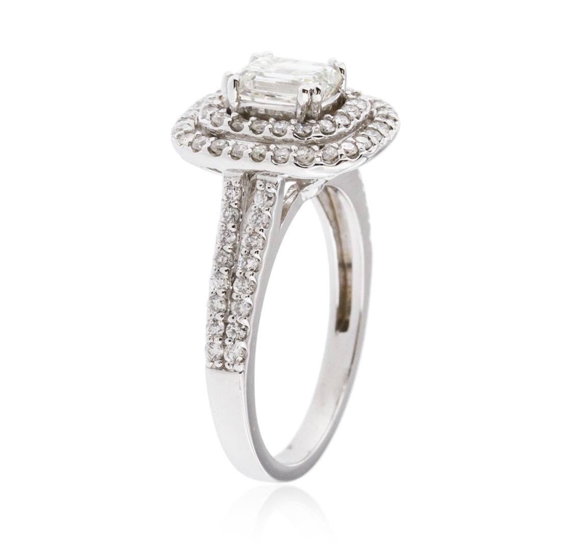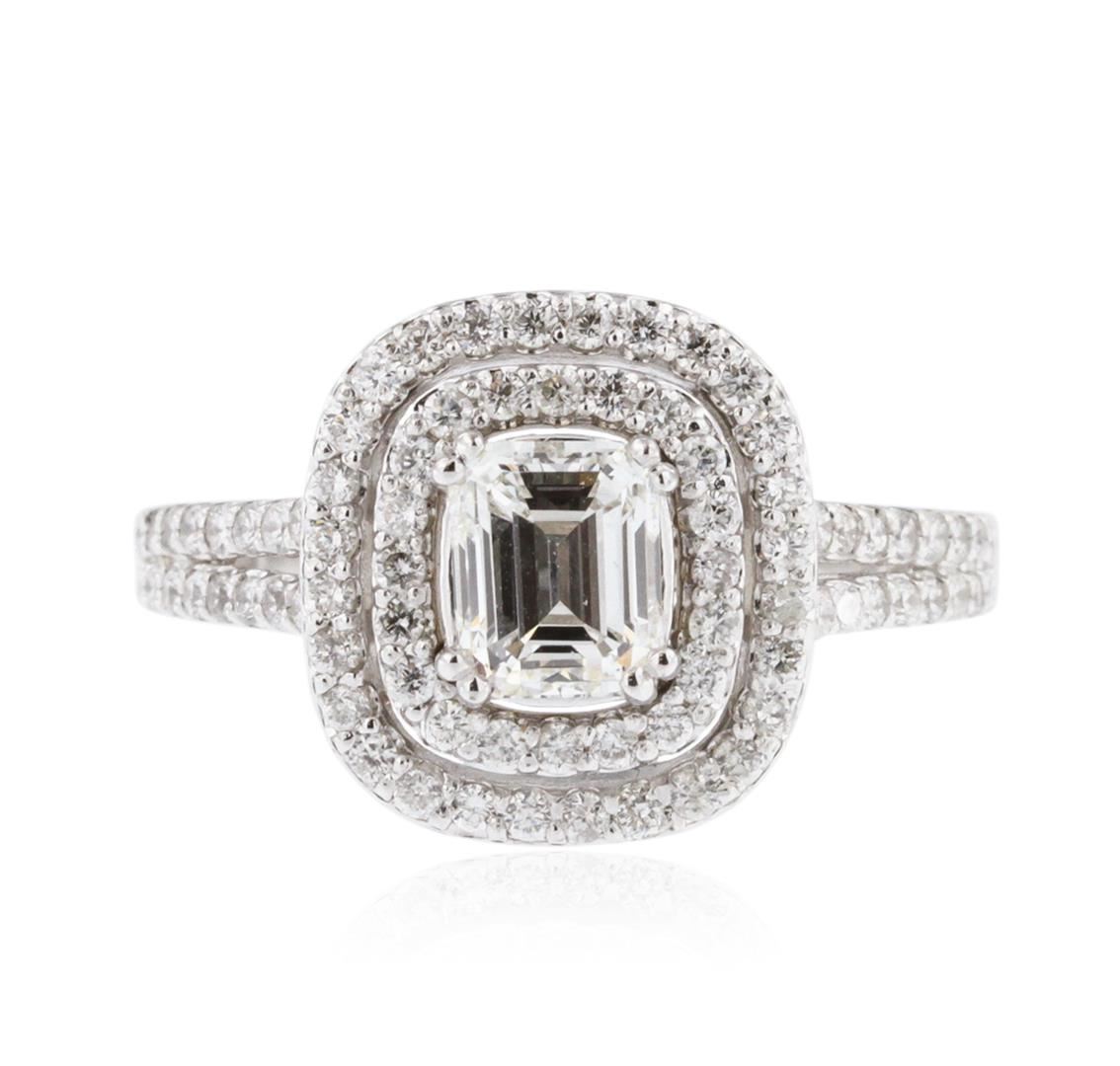 One electronically tested 14KT white gold ladies cast diamond unity ring with a bright polish finish. The featured diamond is set within two tiered diamond bezels supported by diamond set split shoulders, completed by a one and one-half millimeter wide band. Identified with markings of "K14". Condition is new, good workmanship. Containing: One prong set emerald shaped cut diamond, measuring 6.03 x 4.89 x 3.80mm exact weight 1.00ct. EGL Report attached. Graded loose prior to setting in the EGL Laboratory Report #US 912917109D. Clarity: VS-1. Color: G. Depth 77.7%. Table 63.1%. Pavil. Depth%. 30.3%. Eighty prong set round brilliant cut diamonds, measuring 1.40 - 1.30 x 0.81mm (depth est.) approximate total weight of 80 Stones = 0.82ct. Graded in the setting. Clarity: SI-1 to I-1. Color: G - I. Total Weight of Diamonds 1.82ct. Total Weight of Ring 4.66 grams. AIG Appraised at $13,615.00.