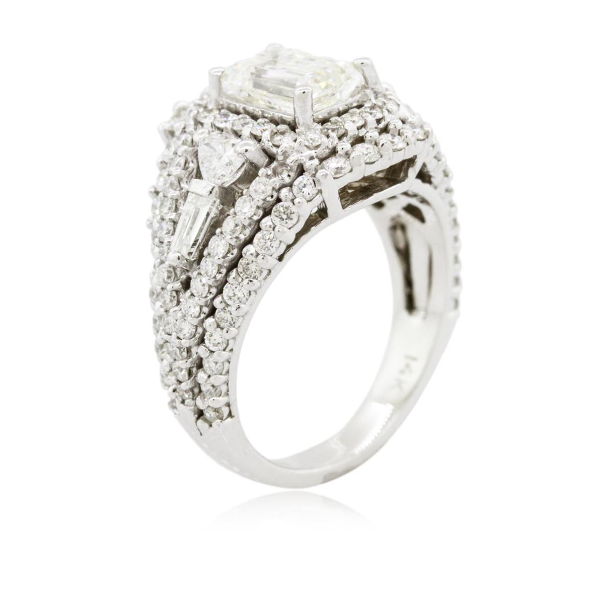 One electronically tested 14KT white gold ladies combination cast & assembled diamond engagement ring with a bright polish finish. Identified with markings of "14K". Condition is new. Containing: One prong set emerald cut diamond, measuring 7.56 x 5.11 x 3.65mm (depth est.) approximate weight of 1.34ct. Clarity: VS-1. Color: H, Cut is Good. Two prong set baguette cut diamonds, measuring 3.50 x 2.00 x 1.70mm (depth est.) approximate total weight of 2 Stones = 0.22ct. Clarity: VS-2. Color: G - H, Cut is Good. Two prong set heart shaped cut diamonds, measuring 3.00 x 2.80 x 1.76mm (depth est.) approximate total weight of 2 Stones = 0.17ct. Clarity: SI-1. Color: F - G, Cut is Good. One Hundred Seven prong set round brilliant cut diamonds, measuring 1.50 - 1.40 x 0.87mm (depth est.) approximate total weight of 107 Stones = 1.19ct. Clarity: SI-2 to I-1. Color: G - H, Cut is Good. All diamonds are graded in the mounting, unless otherwise stated. Total Weight of Diamonds 2.92ct. Total Weight of Engagement Ring 8.10 grams. GGL Appraised at $20,350.00.
