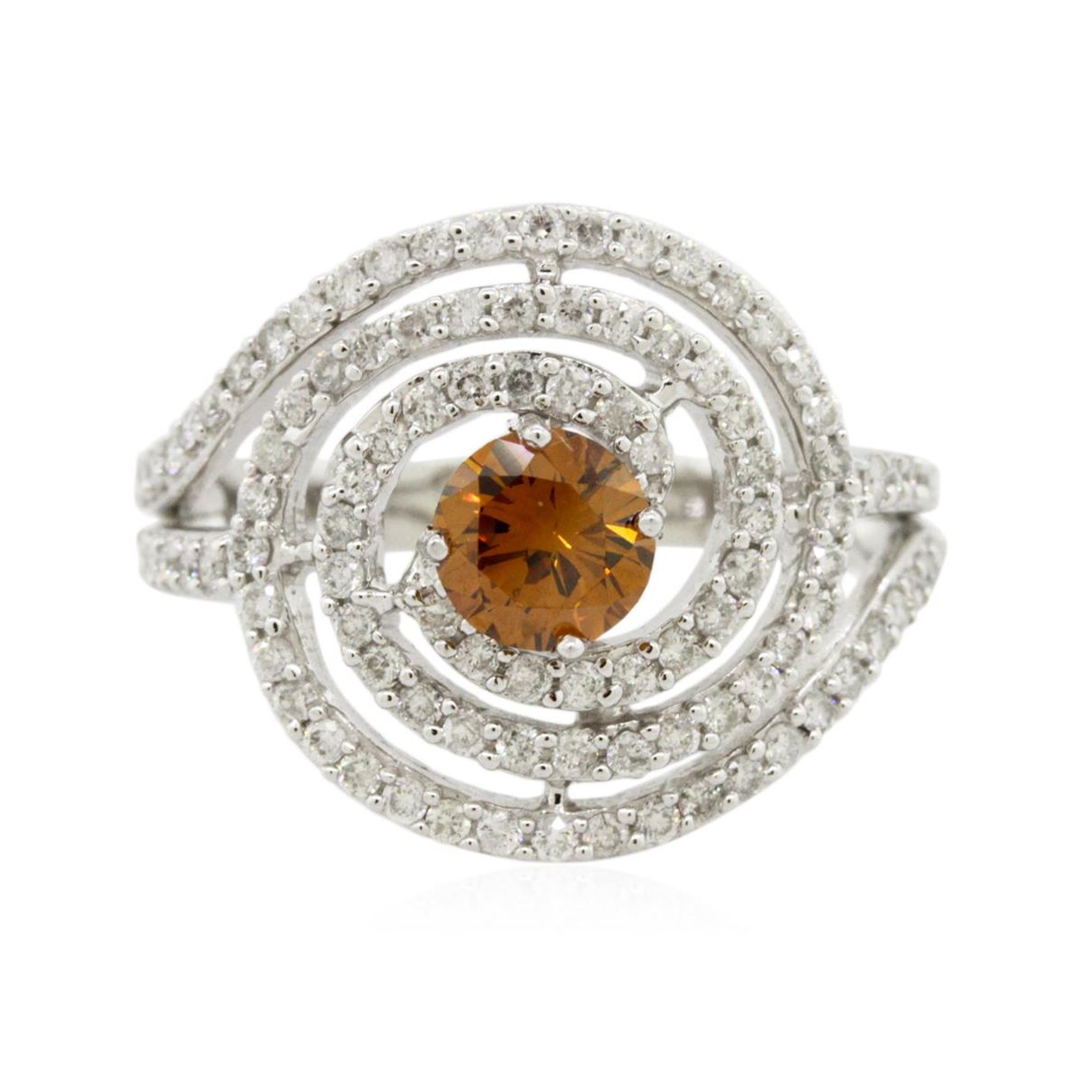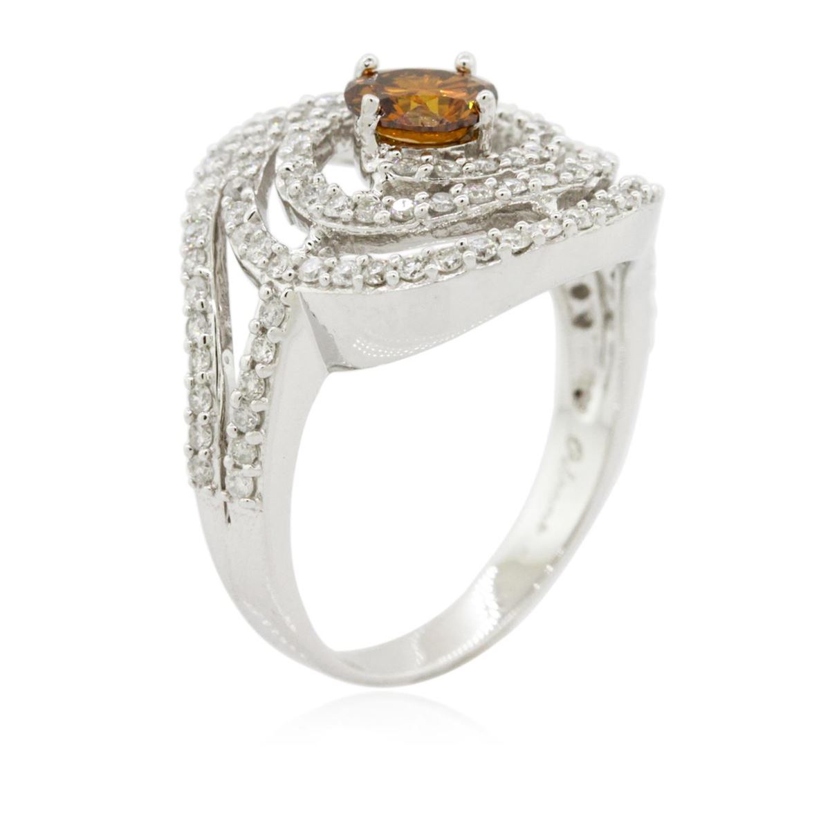 One electronically tested 14KT white gold ladies cast diamond ring with a bright polish finish. Condition is new, good workmanship. The featured diamond is set within swirling diamond bezels supported by diamond set split shoulders, completed by a two and one-half millimeter wide band. Trademark is Orianne. Identified with markings of "14K". Containing: One prong set round brilliant cut diamond, measuring 5.61 - 5.72 x 3.36mm exact weight 0.65ct. GIA Diamond Grading Report attached. Indications of laboratory irradiated enhanced color. Graded loose in the GIA Laboratory, Report #11105526. Clarity VS-2. Color: Fancy Deep Brown-Orange. Depth: 59.3%. Table: 62.0%. One Hundred Four prong set round brilliant cut diamonds, measuring 1.20 - 1.10 x 0.69mm (depth est.) approximate total weight of 104 Stones = 0.67ct. Graded in the setting. Clarity: I-1 to I-2. Color: G - I. Total Weight of Diamonds 1.32ct. Total Weight of Ring 5.34gm. AIG Appraised at $6,995.00.