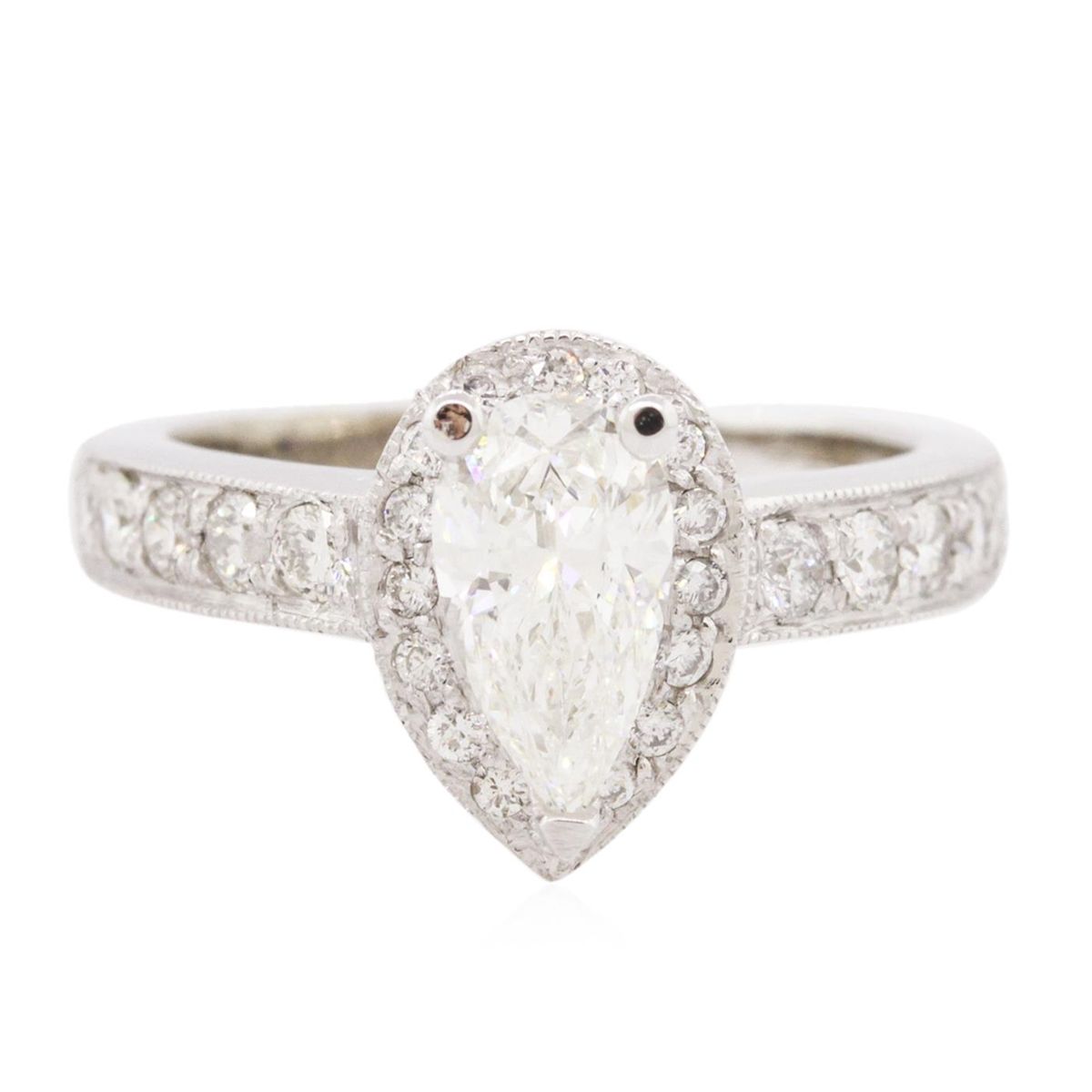 One electronically tested 14KT white gold ladies cast diamond unity ring. The featured diamond is set within a diamond bezel supported by a two and one-half millimeter wide band. Bright polish finish with milgrain detailing throughout. Identified with markings of "14K". Condition is new, good workmanship. Containing: One prong set pear shaped cut diamond, measuring 9.16 x 5.03 x 3.23mm exact weight 0.86ct with a medium blue fluorescence. GIA Diamond Dossier Grading Report attached. Graded loose prior to setting in the GIA Laboratory, Report#14019140. Clarity: VS-2. Color: 64.2%. Table 58.0%. Ten prong set round brilliant cut diamonds, measuring 2.20 - 2.10 x 1.29mm (depth est.) approximate total weight of 10 Stones = 0.46ct. Graded in the setting. Clarity: SI-1 to I-1. Color: G - I Sixteen prong set round brilliant cut diamonds, measuring 1.30 - 1.20 x 0.75mm (depth est.) approximate total weight of 16 Stones = 0.21ct. Graded in the setting. Clarity: SI-1 to I-1. Color: G - I. Total Weight of Diamonds 1.53ct. Total Weight of Ring 5.15 grams. AIG Appraised at $13,455.00.