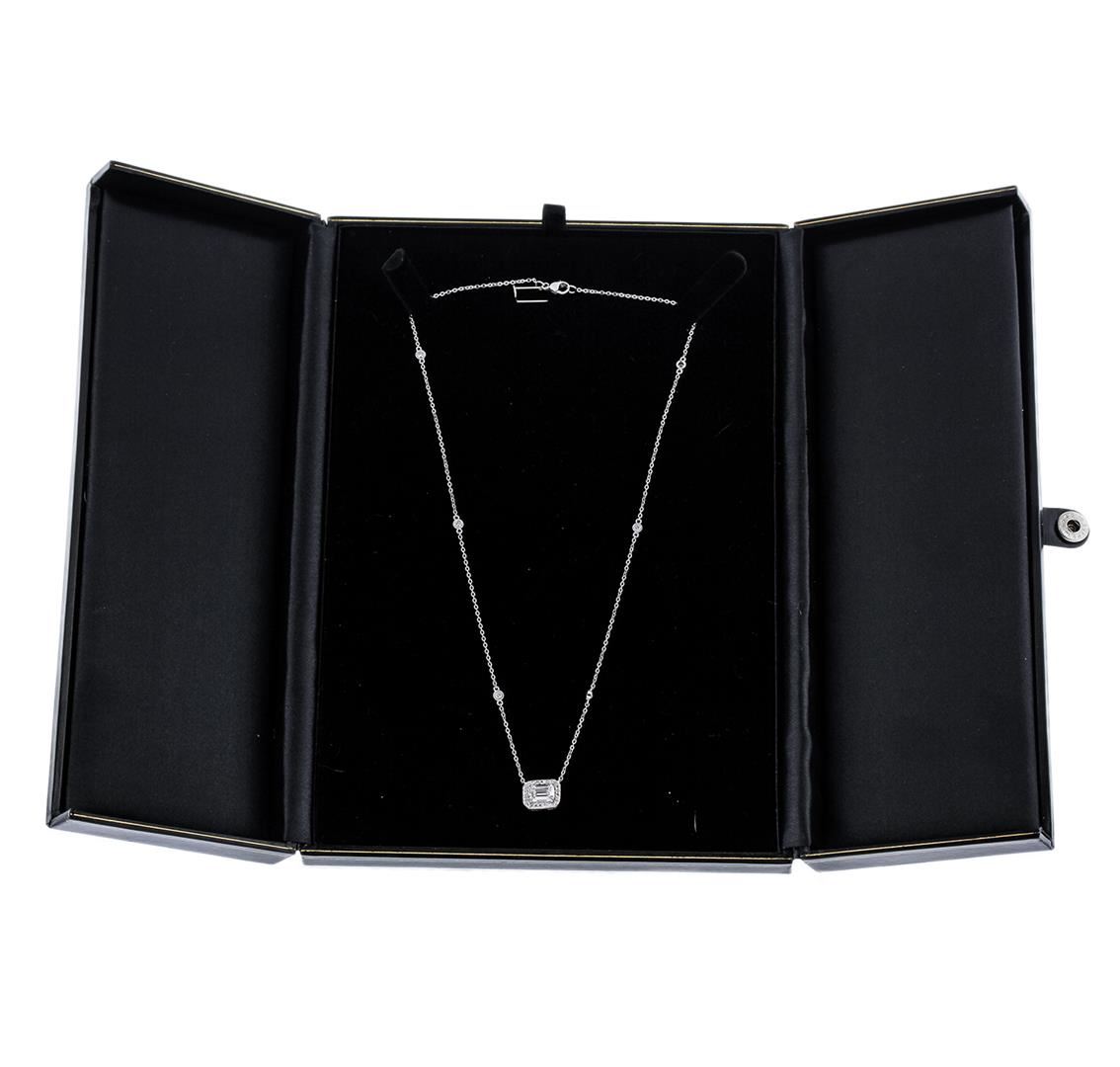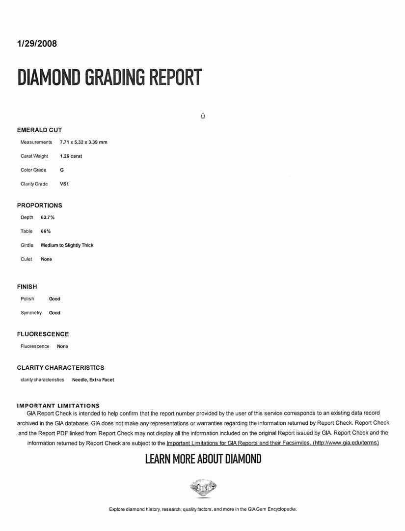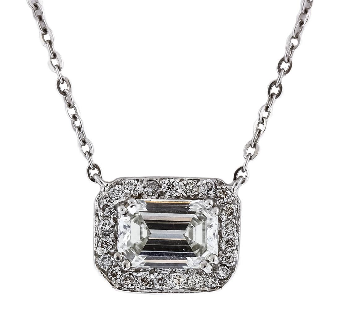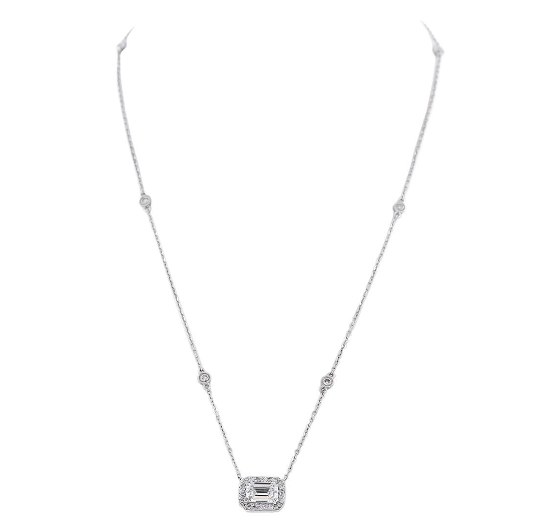 One electronically tested 14KT white gold ladies cast & assembled diamond necklace. Sixteen inch length necklace features a pendant composed of a diamond set within a diamond bezel supported by a diamond station chain, terminating in a lobster claw clasp. Bright polish finish with milgrain detailing. Identified with markings of "585". Condition is new, good workmanship. Containing: One prong set emerald shaped cut diamond, measuring 7.71 x 5.32 x 3.39mm exact weight 1.26ct. GIA Diamond Grading Report attached. Graded loose prior to setting in the GIA Laboratory, Report #16816692. Clarity: VS-1. Color: G. Depth 63.7%. Table 66.0%. Six bezel set round brilliant cut diamonds, measuring 2.20 - 2.10 x 1.29mm (depth est.) approximate total weight of 6 Stones = 0.24ct. Graded in the setting. Clarity: SI-2 to I-1. Color: H - I Twenty-Three prong set round brilliant cut diamonds, measuring 1.30 - 1.20 x 0.75mm (depth est.) approximate total weight of 23 Stones = 0.20ct. Graded in the setting. Clarity: SI-1 to SI-2. Color: G - I. Total Weight of Diamonds 1.70ct. Total Weight of Necklace 4.16 grams. AIG Appraised at $19,195.00.
