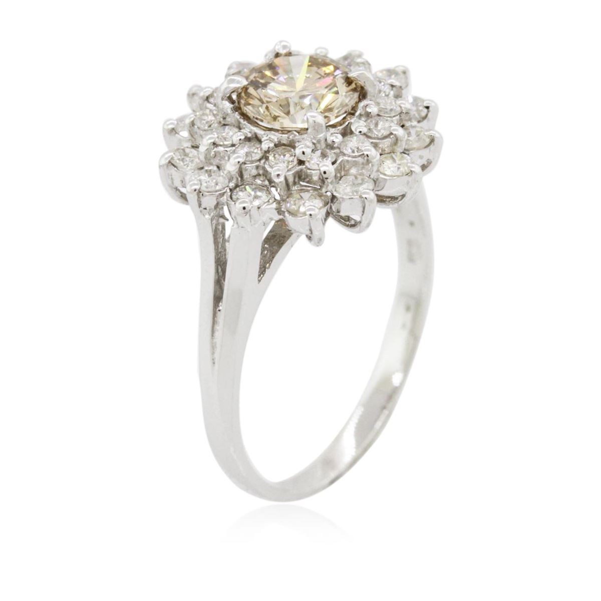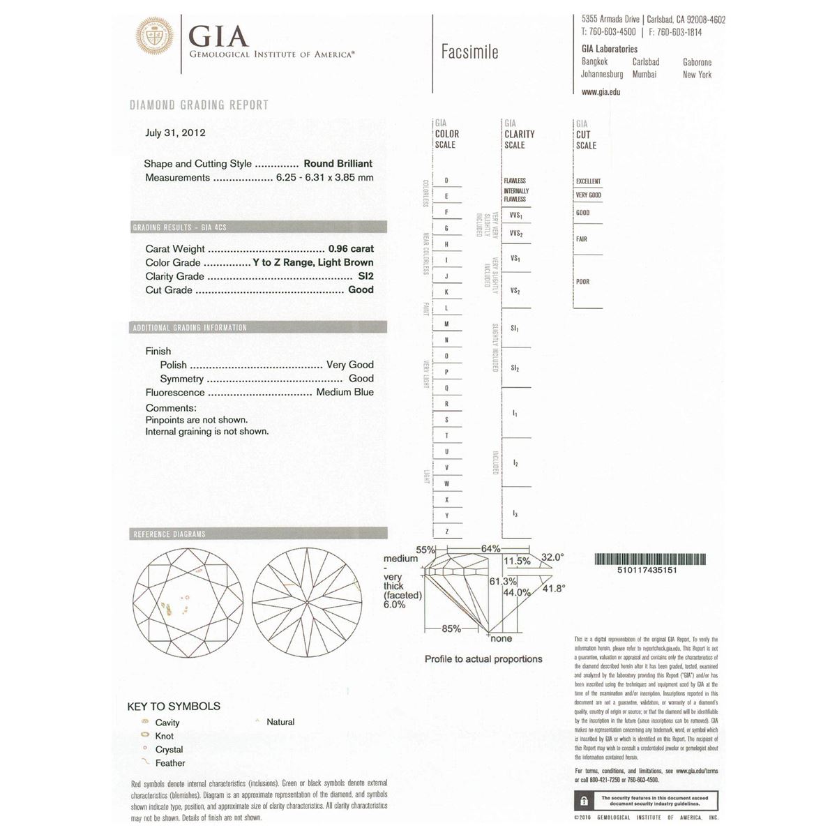 One electronically tested 14KT white gold ladies cast diamond ring with a bright polish finish. Condition is new, good workmanship. The featured diamond is set within a two tiered diamond bezel supported by split shoulders, completed by a one and one-half millimeter wide band. Identified with markings of "K14". Containing: One prong set round brilliant cut diamond, measuring 6.25 - 6.31 x 3.85mm exact weight 0.96ct with a medium blue fluorescence. GIA Diamond Grading Report attached. Graded loose prior to setting in the GIA Laboratory, Report #1142771193. Clarity: SI-2. Depth: 61.3%. Table 64.0%. Pavli. Depth%. 44.0%. Crown Angle 32.0 Degrees Fourteen prong set round brilliant cut diamonds, measuring 2.10 - 2.00. x 1.23mm (depth est.) approximate total weight of 14 Stones = 0.54ct. Graded in the setting. Clarity: I-1 to I-2. Color: G - I Fourteen prong set round brilliant cut diamonds, measuring 1.60 - 1.50 x 0.93mm (depth est.) approximate total weight of 14 Stones = 0.29ct. Graded in the setting. Clarity: I-1 to I-2. Color: G - I. Total Weight of Diamonds 1.79ct. Total Weight of Ring 3.56 grams. AIG Appraised at $10,430.00.