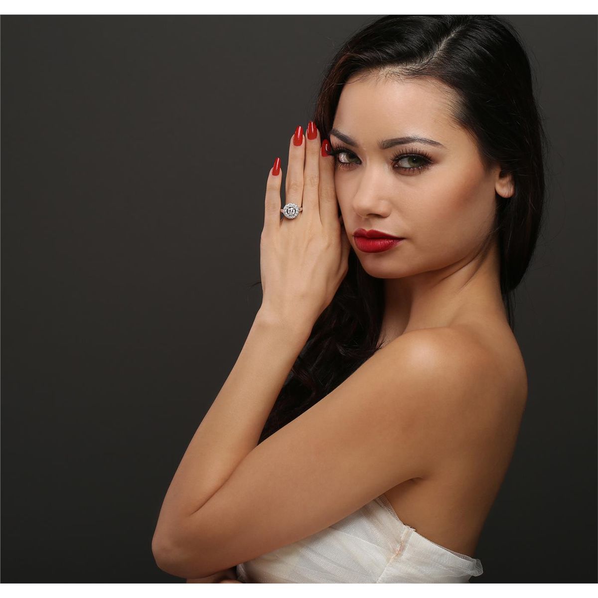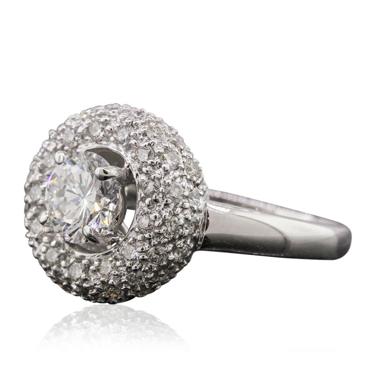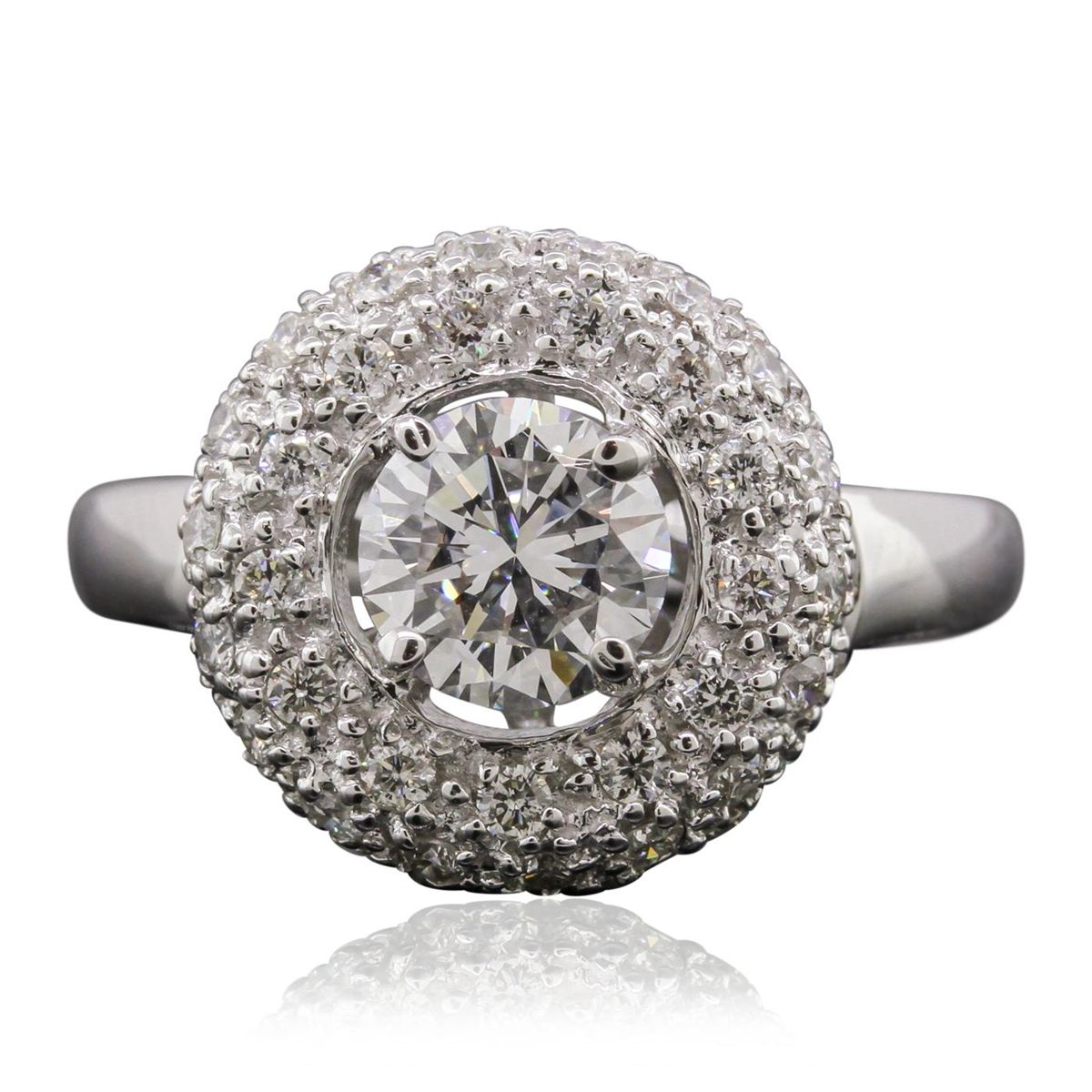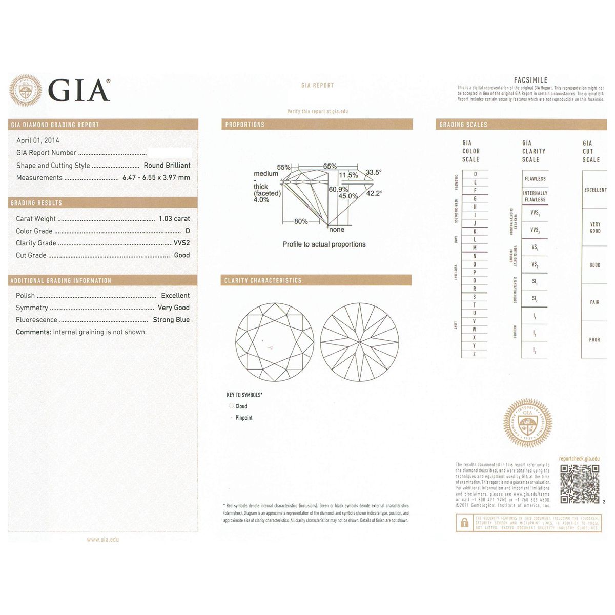 One electronically tested 14KT white gold ladies cast diamond ring with a bright polish finish. Condition is new, good workmanship. The featured diamond is set within a stylized tiered pave‚ set diamond bezel supported by tapering shoulders, completed by a two millimeter wide band. Trademark is ORIANNE. Identified with markings of "14K". Containing: One prong set round brilliant cut diamond, measuring 6.47 - 6.55 x 3.97mm exact weight 1.03ct with a strong blue fluorescence. GIA Diamond Grading Report attached. Graded loose prior to setting in the GIA Laboratory, Report #6167008661. Clarity: VVS-2. Color: Depth 60.9%. Table 65.0%. Pavli. Depth%. 45.0%. Crown Angle 33.5 Degrees Sixty-Three pave‚ set round brilliant cut diamonds, measuring 1.60 - 1.50 x 0.93mm (depth est.) approximate total weight of 63 Stones = 0.93ct. Graded in the setting. Clarity: VS-2 to SI-1. Color: G - I. Total Weight of Diamonds 1.96ct. Total Weight of Ring 5.95 grams. AIG Appraised at $56,110.00.