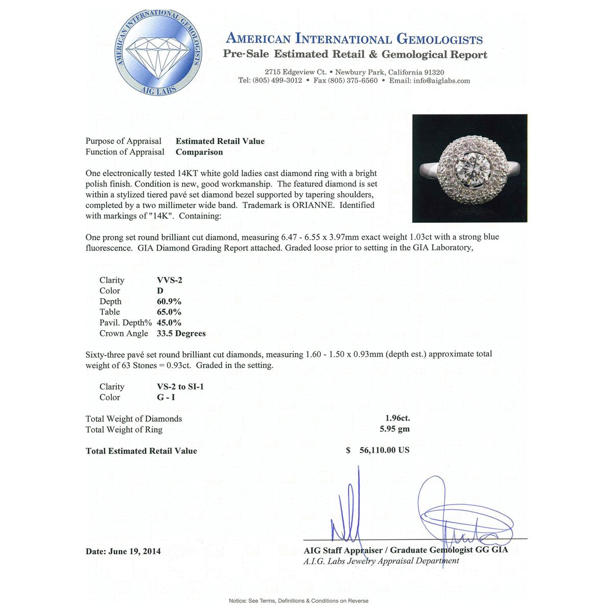 One electronically tested 14KT white gold ladies cast diamond ring with a bright polish finish. Condition is new, good workmanship. The featured diamond is set within a stylized tiered pave‚ set diamond bezel supported by tapering shoulders, completed by a two millimeter wide band. Trademark is ORIANNE. Identified with markings of "14K". Containing: One prong set round brilliant cut diamond, measuring 6.47 - 6.55 x 3.97mm exact weight 1.03ct with a strong blue fluorescence. GIA Diamond Grading Report attached. Graded loose prior to setting in the GIA Laboratory, Report #6167008661. Clarity: VVS-2. Color: Depth 60.9%. Table 65.0%. Pavli. Depth%. 45.0%. Crown Angle 33.5 Degrees Sixty-Three pave‚ set round brilliant cut diamonds, measuring 1.60 - 1.50 x 0.93mm (depth est.) approximate total weight of 63 Stones = 0.93ct. Graded in the setting. Clarity: VS-2 to SI-1. Color: G - I. Total Weight of Diamonds 1.96ct. Total Weight of Ring 5.95 grams. AIG Appraised at $56,110.00.