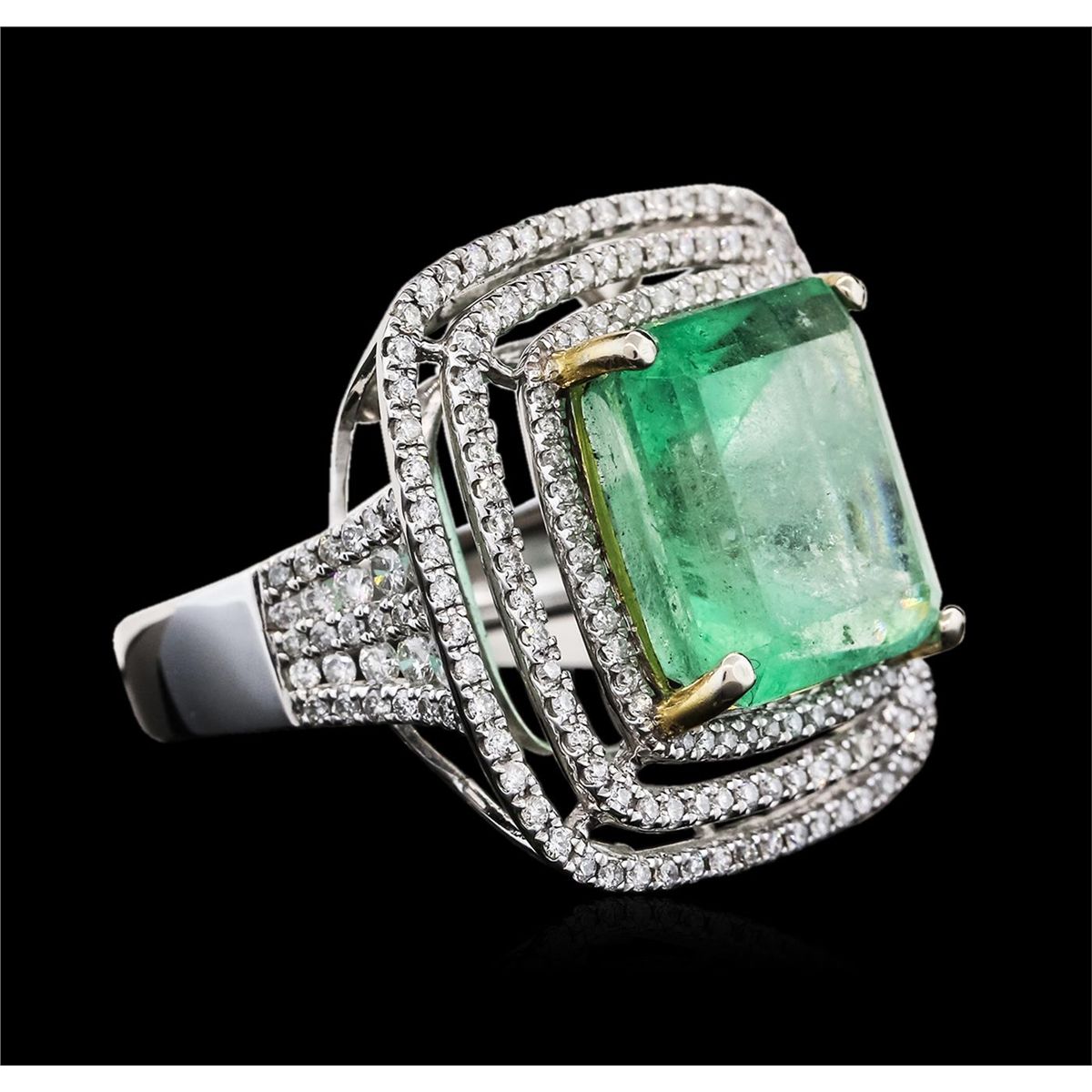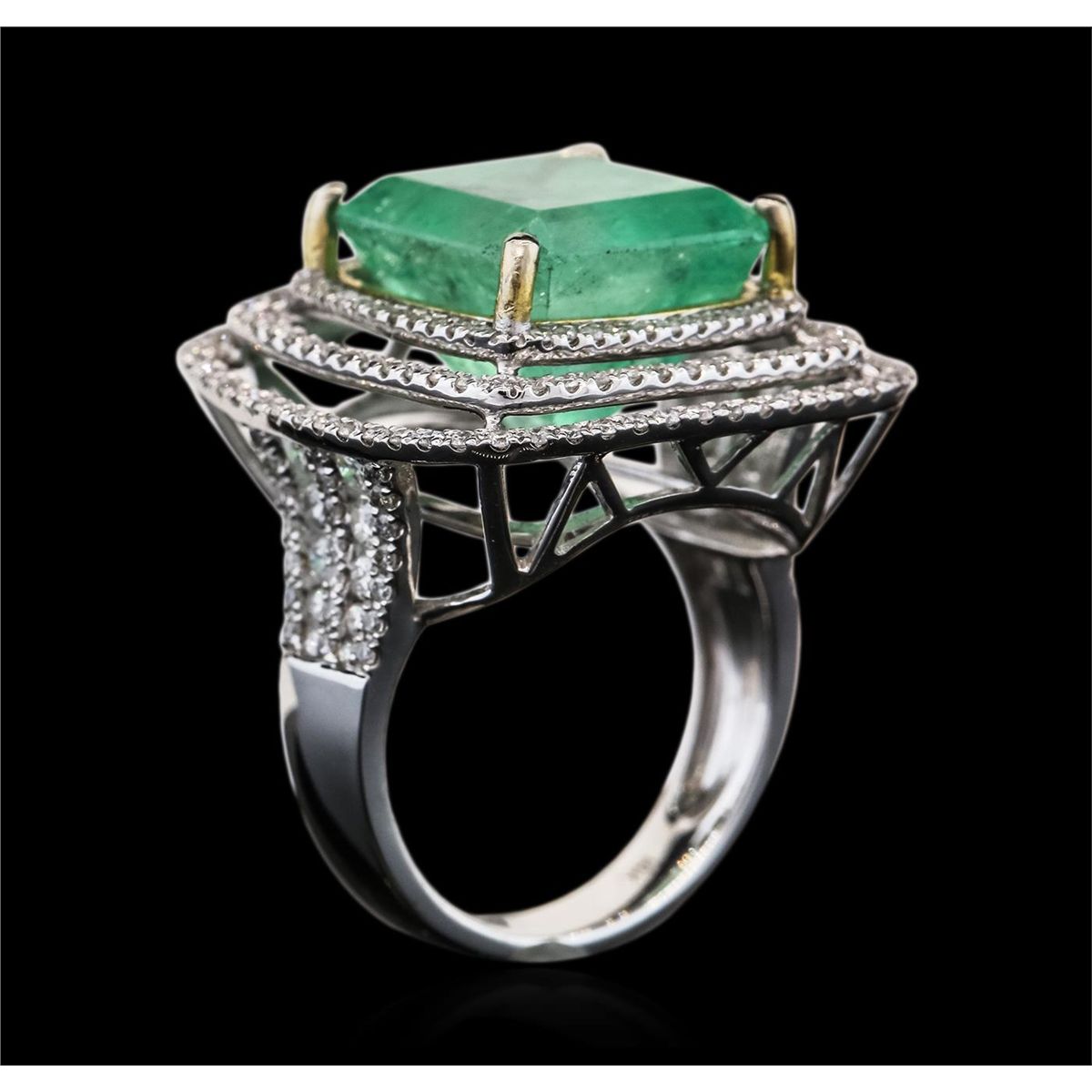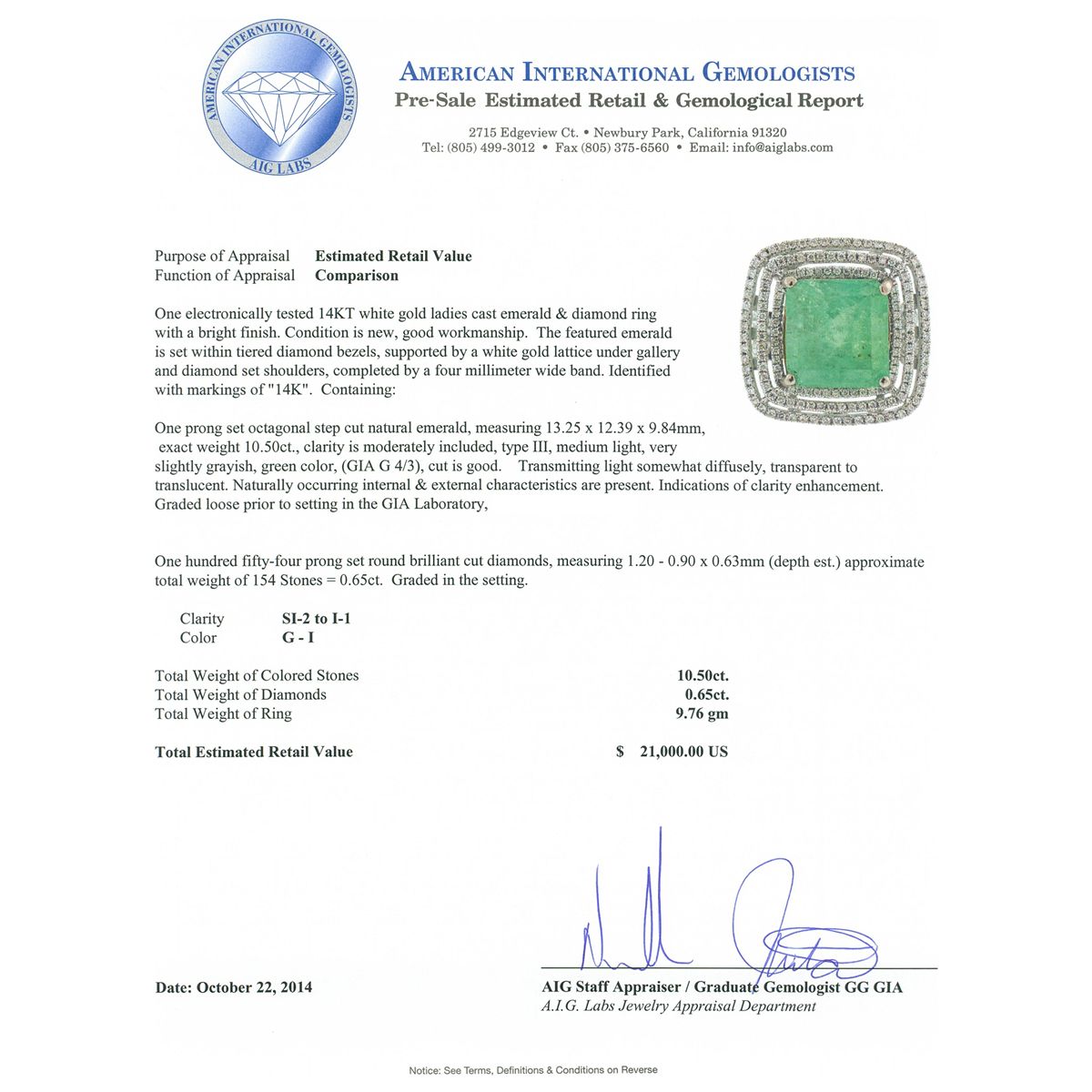One electronically tested 14KT white gold ladies cast emerald & diamond ring with a bright finish. The featured emerald is set within tiered diamond bezels, supported by a white gold lattice under gallery and diamond set shoulders, completed by a four millimeter wide band. Identified with markings of 14K. Condition is new, good workmanship. Containing: One prong set octagonal step cut natural emerald, measuring 13.25 x 12.39 x 9.84mm, exact weight 10.50ct., clarity is moderately included, type III, medium light, very slightly grayish, green color, (GIA G 4/3), cut is good. Transmitting light somewhat diffusely, transparent to translucent. Naturally occurring internal & external characteristics are present. Indications of clarity enhancement. Graded loose prior to setting in the GIA Laboratory, Report # 1166542631.One Hundred Fifty-Four prong set round brilliant cut diamonds, measuring 1.20 - 0.90 x 0.63mm (depth est.) approximate total weight of 154 Stones = 0.65ct. Graded in the setting. Clarity: SI-2 to I-1. Color: G - I. Total Weight of Colored Stones 10.50ct. Total Weight of Diamonds 0.65ct. Total Weight of Ring 9.76 grams. AIG Appraised at $21,000.00.