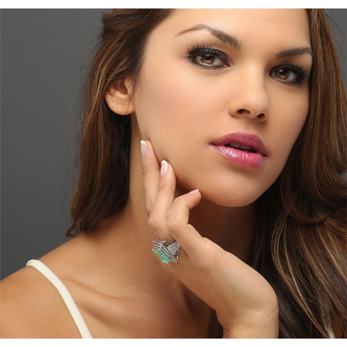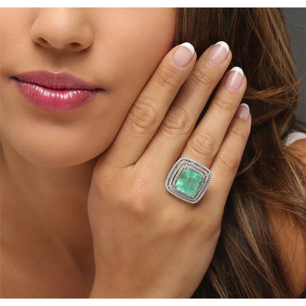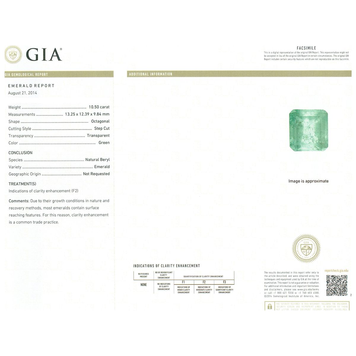 One electronically tested 14KT white gold ladies cast emerald & diamond ring with a bright finish. The featured emerald is set within tiered diamond bezels, supported by a white gold lattice under gallery and diamond set shoulders, completed by a four millimeter wide band. Identified with markings of 14K. Condition is new, good workmanship. Containing: One prong set octagonal step cut natural emerald, measuring 13.25 x 12.39 x 9.84mm, exact weight 10.50ct., clarity is moderately included, type III, medium light, very slightly grayish, green color, (GIA G 4/3), cut is good. Transmitting light somewhat diffusely, transparent to translucent. Naturally occurring internal & external characteristics are present. Indications of clarity enhancement. Graded loose prior to setting in the GIA Laboratory, Report # 1166542631.One Hundred Fifty-Four prong set round brilliant cut diamonds, measuring 1.20 - 0.90 x 0.63mm (depth est.) approximate total weight of 154 Stones = 0.65ct. Graded in the setting. Clarity: SI-2 to I-1. Color: G - I. Total Weight of Colored Stones 10.50ct. Total Weight of Diamonds 0.65ct. Total Weight of Ring 9.76 grams. AIG Appraised at $21,000.00.