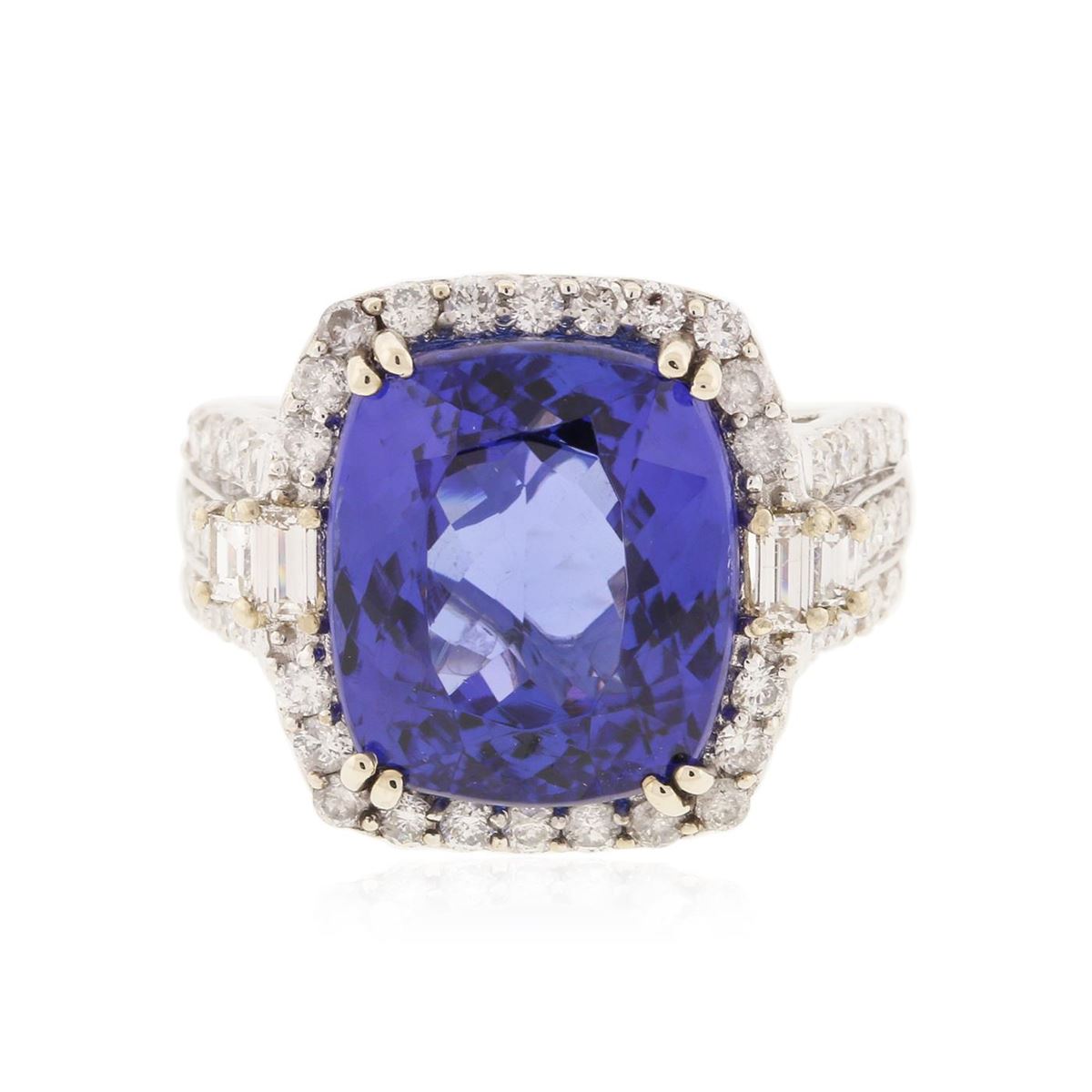 One electronically tested 14KT white gold ladies cast tanzanite and diamond ring. Condition is new, good workmanship. The featured tanzanite is set within a diamond bezel supported by diamond set shoulders, completed by a two and one-half millimeter wide band. Bright polish finish with milgrain detailing. Trademark is ORIANNE. Identified with markings of "14K". Containing: One prong set cushion modified brilliant cut natural tanzanite, measuring 13.55 x 11.80 x 8.27mm, exact weight 11.73ct., clarity is eye clean, type I, medium dark, moderately strong, violet color, (GIA V 6/4), cut is good. Transmitting light with no distortion, transparent. GIA Gemological Report attached. Graded loose prior to setting in the GIA Laboratory, Report #2151964711.Tanzanite is a very rare gemstone that is only found in the country of Tanzania. Originally discovered in 1967. Tiffany & Company, named the stone Tanzanite. It is found in the Usumburu Mountains that border the Umba Valley of northern Tanzania. Tanzanite occurs in gray, brown, violet, blue, reddish-purple, & green. The gem is interesting because of its exceptional pleochroism. Rotated in different directions a tanzanite will exhibit multiple changes of color. Tanzanite has a low tolerance to ultrasonic cleaning, and should not be cleaned using this method Fifty-Two prong set round brilliant cut diamonds, measuring 1.70 - 1.60 x 0.99mm (depth est.) approximate total weight of 52 Stones = 0.80ct. Graded in the setting. Clarity: SI-1 to I-1. Color: G - I Four prong set baguette cut diamonds, measuring from 2.50 x 1.60 x 1.12mm (depth est.) to 3.50 x 1.80 x 1.26mm (depth est.) approximate total weight of 4 Stones = 0.22ct. Graded in the setting. Clarity: VVS-2 to VS-1. Color: G - I. Total Weight of Colored Stones 11.73ct. Total Weight of Diamonds 1.02ct. Total Weight of Ring 8.03 grams. AIG Appraised at $33,935.00.