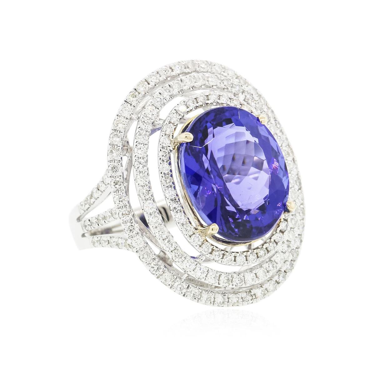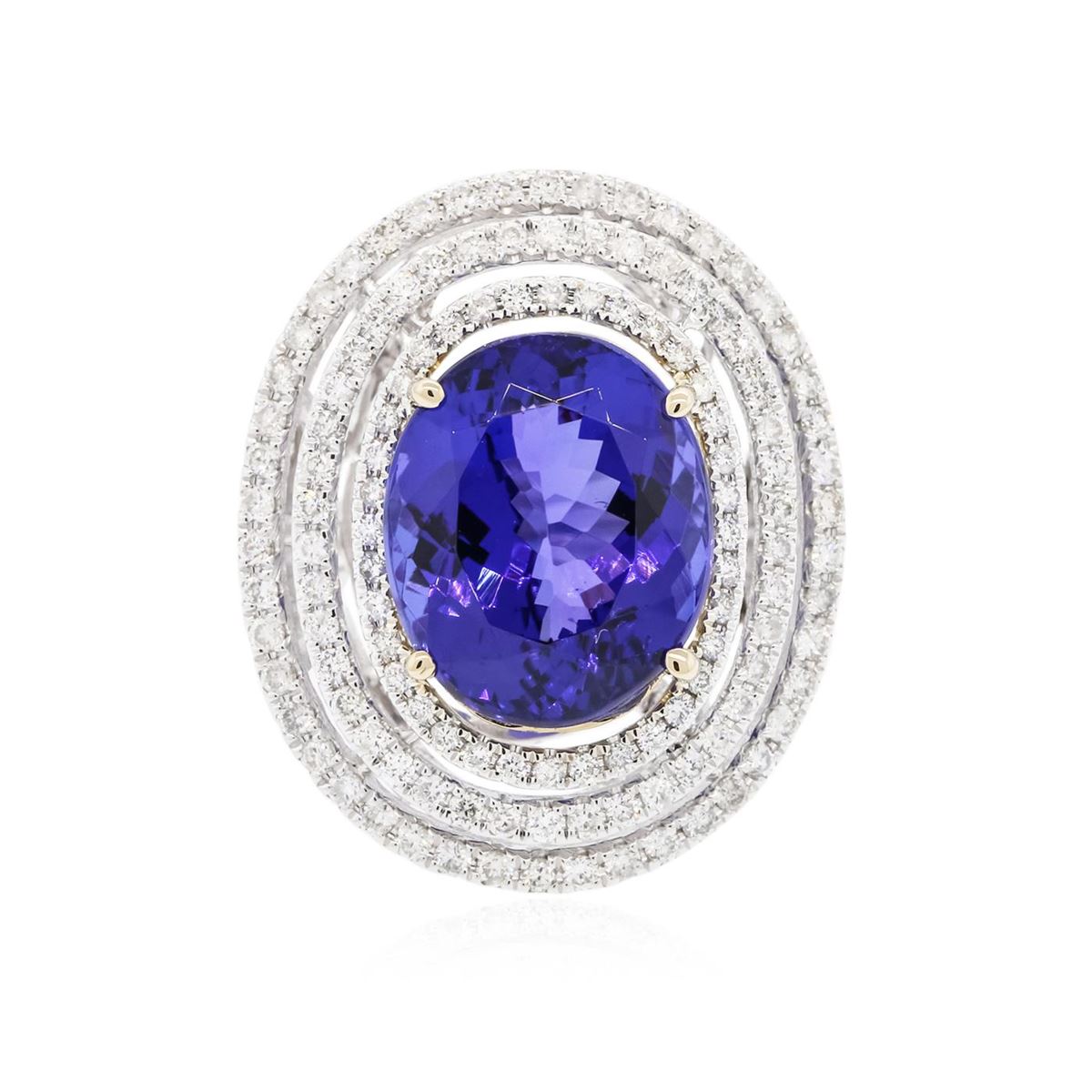 One electronically tested 14KT white gold ladies cast tanzanite and diamond ring with a bright polish finish. Condition is new, good workmanship. The featured tanzanite is set within tiered diamond bezels supported by diamond set three-way split shoulders, completed by a three millimeter wide band. Identified with markings of "14K". Containing: One prong set oval modified brilliant cut natural tanzanite, measuring 15.30 x 12.23 x 9.39mm, exact weight 12.54ct., type I Clarity is eye clean, medium dark, moderately strong, violet-blue color, (GIA VB), cut is good. Transmitting light with no distortion, transparent. GIA Gemological Report attached. Graded loose prior to setting in the GIA Laboratory, Report #2151964558.Tanzanite is a very rare gemstone that is only found in the country of Tanzania. Originally discovered in 1967. Tiffany & Company, named the stone Tanzanite. It is found in the Usumburu Mountains that border the Umba Valley of northern Tanzania. Tanzanite occurs in gray, brown, violet, blue, reddish-purple, & green. The gem is interesting because of its exceptional pleochroism. Rotated in different directions a tanzanite will exhibit multiple changes of color. Tanzanite has a low tolerance to ultrasonic cleaning, and should not be cleaned using this method. One Hundred Sixty-Six prong set round brilliant cut diamonds, measuring 1.50 - 1.40 x 0.87mm (depth est.) approximate. Total Weight of 166 Stones = 2.02ct. Graded in the setting. Clarity: SI-1 to I-1. Color: G - I. Total Weight of Colored Stones 12.54ct. Total Weight of Diamonds 2.02ct. Total Weight of Ring 9.54 grams. AIG Appraised at $39,280.00.