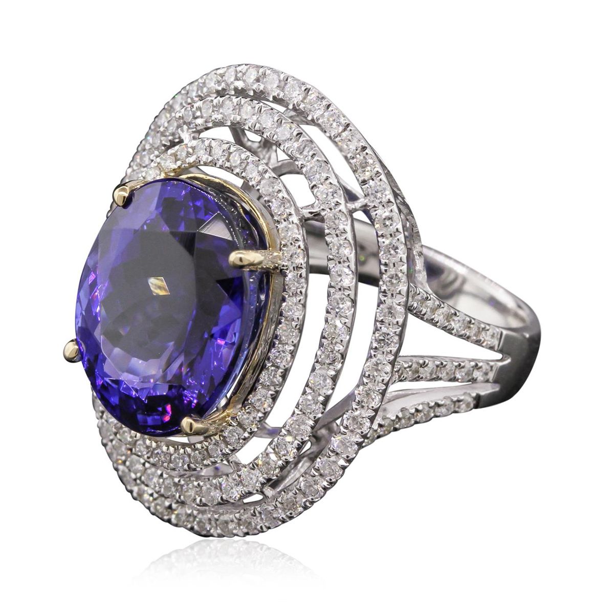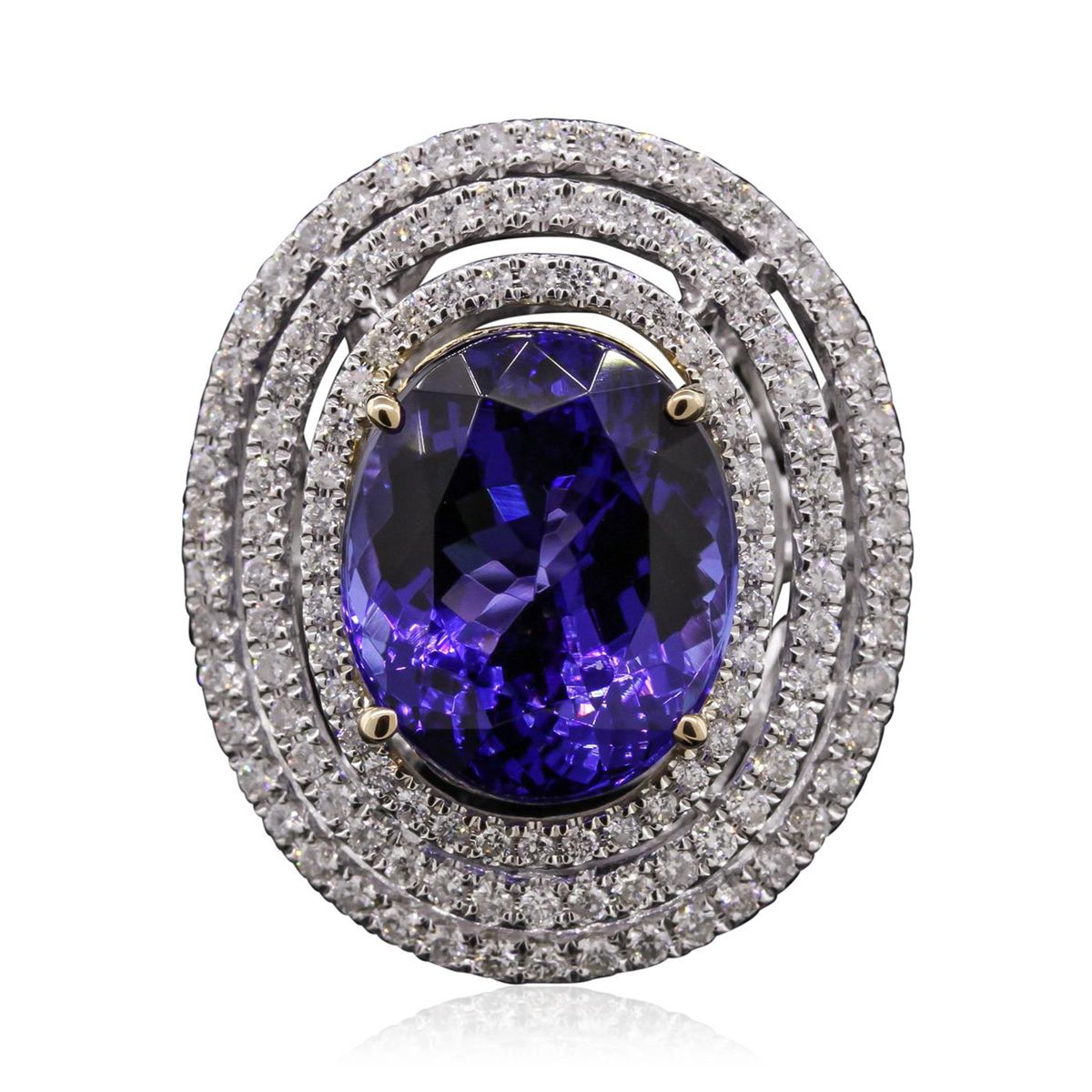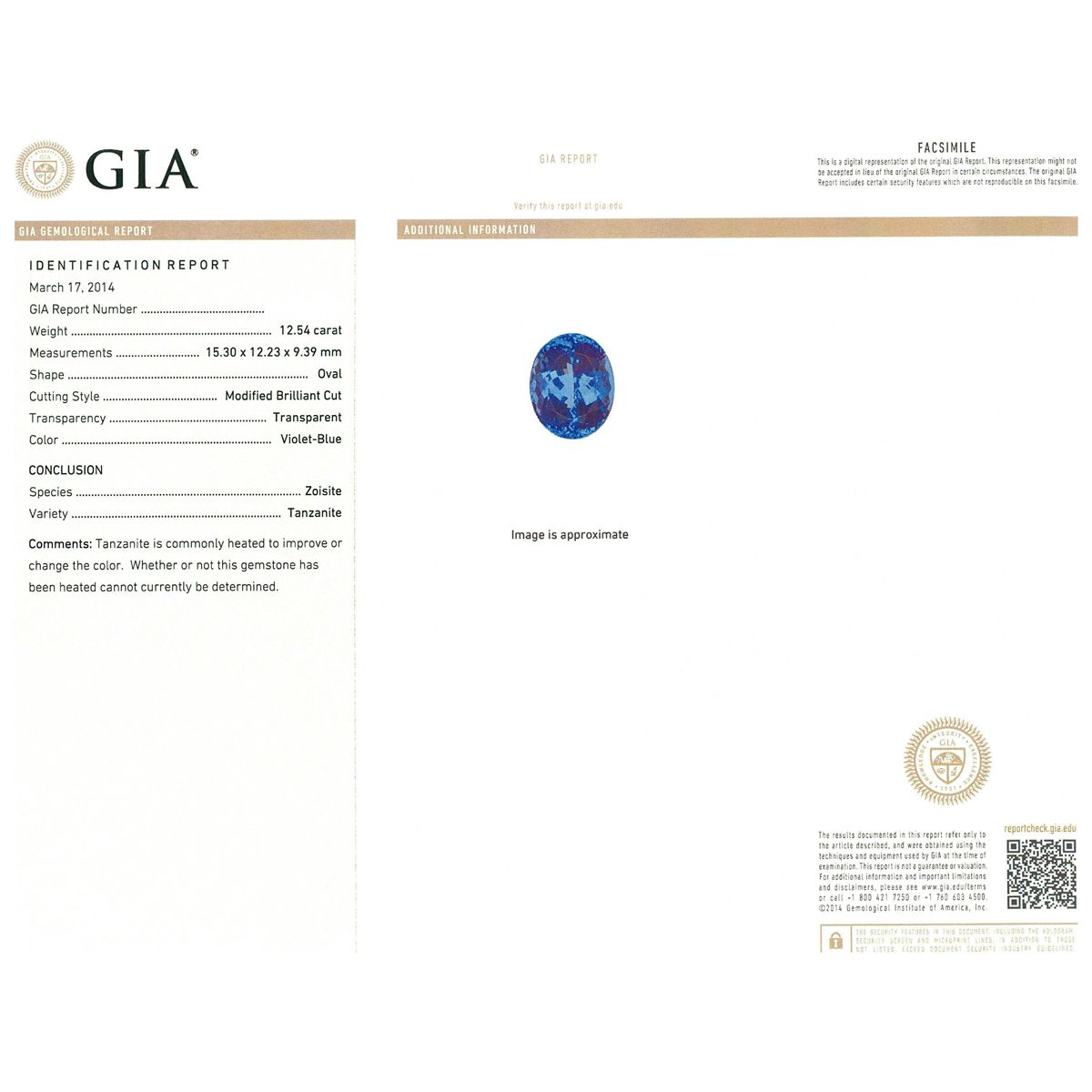One electronically tested 14KT white gold ladies cast tanzanite and diamond ring with a bright polish finish. Condition is new, good workmanship. The featured tanzanite is set within tiered diamond bezels supported by diamond set three-way split shoulders, completed by a three millimeter wide band. Identified with markings of "14K". Containing: One prong set oval modified brilliant cut natural tanzanite, measuring 15.30 x 12.23 x 9.39mm, exact weight 12.54ct., type I Clarity is eye clean, medium dark, moderately strong, violet-blue color, (GIA VB), cut is good. Transmitting light with no distortion, transparent. GIA Gemological Report attached. Graded loose prior to setting in the GIA Laboratory, Report #2151964558.Tanzanite is a very rare gemstone that is only found in the country of Tanzania. Originally discovered in 1967. Tiffany & Company, named the stone Tanzanite. It is found in the Usumburu Mountains that border the Umba Valley of northern Tanzania. Tanzanite occurs in gray, brown, violet, blue, reddish-purple, & green. The gem is interesting because of its exceptional pleochroism. Rotated in different directions a tanzanite will exhibit multiple changes of color. Tanzanite has a low tolerance to ultrasonic cleaning, and should not be cleaned using this method. One Hundred Sixty-Six prong set round brilliant cut diamonds, measuring 1.50 - 1.40 x 0.87mm (depth est.) approximate. Total Weight of 166 Stones = 2.02ct. Graded in the setting. Clarity: SI-1 to I-1. Color: G - I. Total Weight of Colored Stones 12.54ct. Total Weight of Diamonds 2.02ct. Total Weight of Ring 9.54 grams. AIG Appraised at $39,280.00.