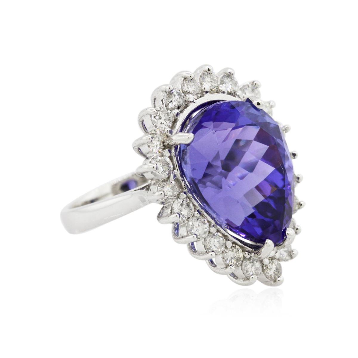 One electronically tested 14KT white gold ladies cast tanzanite and diamond ring with a bright polish finish. Condition is new, good workmanship. The featured tanzanite is set within a diamond bezel supported by tapering shoulders, completed by a two and one-half millimeter wide band. Identified with markings of "K14". Containing: One prong set pear modified brilliant cut natural tanzanite, measuring 15.71 x 12.60 x 10.49mm, exact weight 13.39ct., clarity is eye clean, type I, medium dark, moderately strong, violetish blue color, (GIA vB 6/4), cut is good. Transmitting light with no distortion, transparent. GIA Gemological Report attached. Graded loose prior to setting in the GIA Laboratory, Report #2151735574.Tanzanite is a very rare gemstone that is only found in the country of Tanzania. Originally discovered in 1967. Tiffany & Company, named the stone Tanzanite. It is found in the Usumburu Mountains that border the Umba Valley of northern Tanzania. Tanzanite occurs in gray, brown, violet, blue, reddish-purple, & green. The gem is interesting because of its exceptional pleochroism. Rotated in different directions a tanzanite will exhibit multiple changes of color. Tanzanite has a low tolerance to ultrasonic cleaning, and should not be cleaned using this method. Twenty-Two prong set round brilliant cut diamonds, measuring 2.40 - 2.30 x 1.41mm (depth est.) approximate. Total Weight of 22 Stones = 1.15ct. Graded in the setting. Clarity: SI-1 to I-1. Color: G - I. Total Weight of Colored Stones 13.39ct. Total Weight of Diamonds 1.15ct. Total Weight of Ring 9.59 grams. AIG Appraised at $38,350.00.