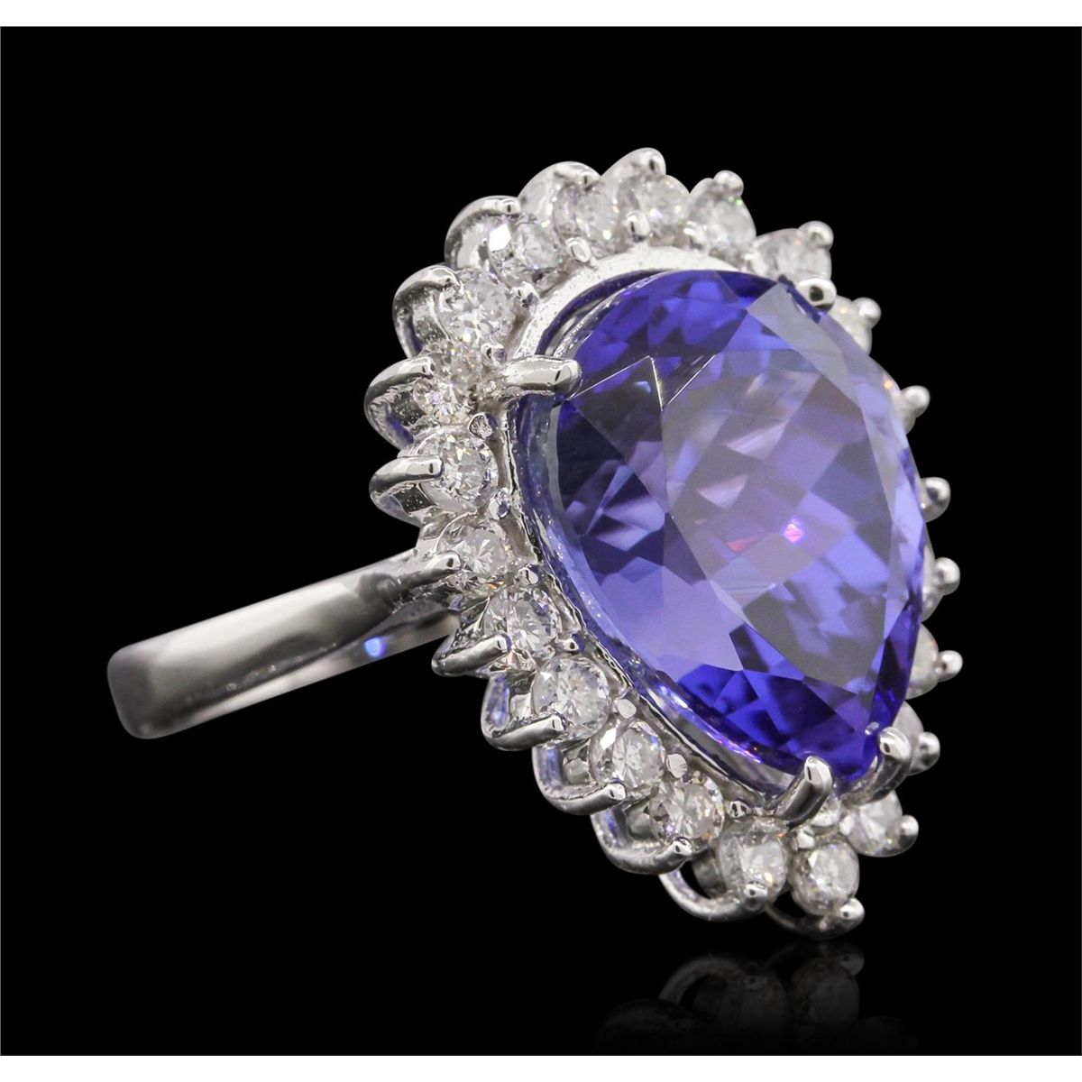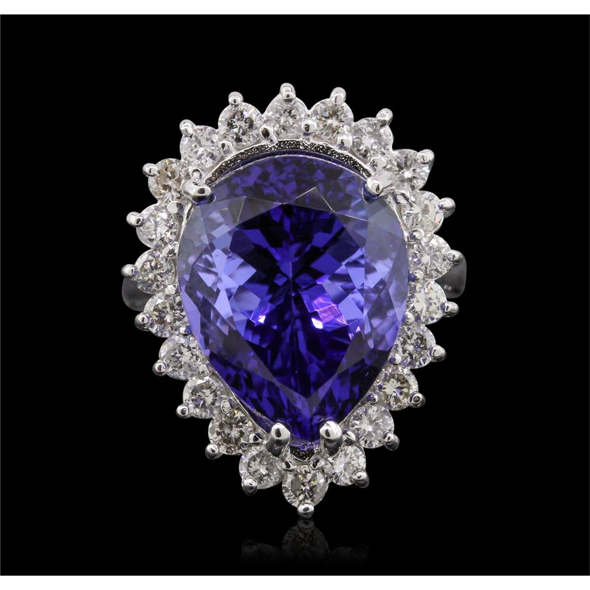 One electronically tested 14KT white gold ladies cast tanzanite and diamond ring with a bright polish finish. Condition is new, good workmanship. The featured tanzanite is set within a diamond bezel supported by tapering shoulders, completed by a two and one-half millimeter wide band. Identified with markings of "K14". Containing: One prong set pear modified brilliant cut natural tanzanite, measuring 15.71 x 12.60 x 10.49mm, exact weight 13.39ct., clarity is eye clean, type I, medium dark, moderately strong, violetish blue color, (GIA vB 6/4), cut is good. Transmitting light with no distortion, transparent. GIA Gemological Report attached. Graded loose prior to setting in the GIA Laboratory, Report #2151735574.Tanzanite is a very rare gemstone that is only found in the country of Tanzania. Originally discovered in 1967. Tiffany & Company, named the stone Tanzanite. It is found in the Usumburu Mountains that border the Umba Valley of northern Tanzania. Tanzanite occurs in gray, brown, violet, blue, reddish-purple, & green. The gem is interesting because of its exceptional pleochroism. Rotated in different directions a tanzanite will exhibit multiple changes of color. Tanzanite has a low tolerance to ultrasonic cleaning, and should not be cleaned using this method. Twenty-Two prong set round brilliant cut diamonds, measuring 2.40 - 2.30 x 1.41mm (depth est.) approximate. Total Weight of 22 Stones = 1.15ct. Graded in the setting. Clarity: SI-1 to I-1. Color: G - I. Total Weight of Colored Stones 13.39ct. Total Weight of Diamonds 1.15ct. Total Weight of Ring 9.59 grams. AIGAppraised at $38,350.00.