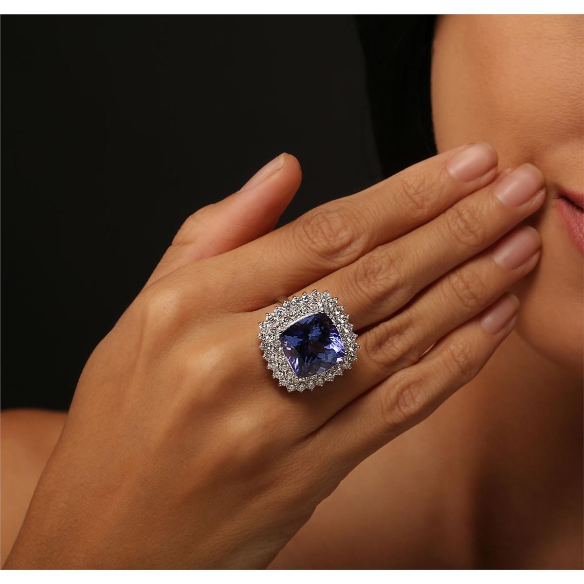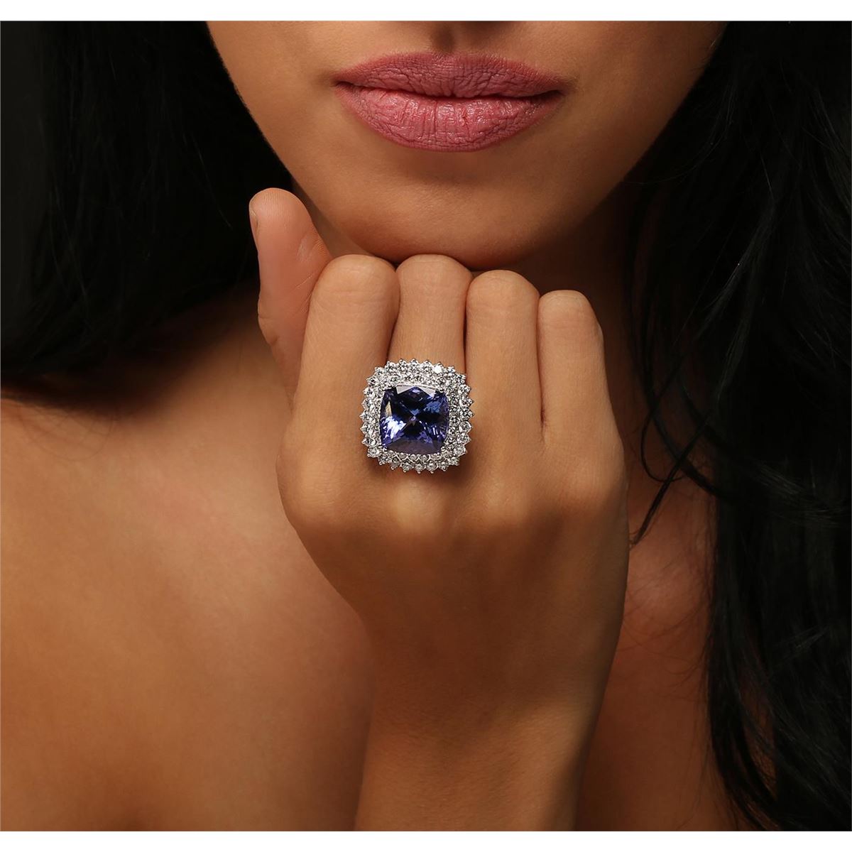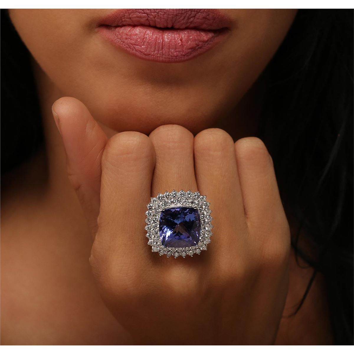 One electronically tested 14KT white gold ladies cast tanzanite and diamond ring with a bright polish finish. Condition is new, good workmanship. The featured tanzanite is set within a diamond lattice gallery, completed by a three millimeter wide band. Identified with markings of "K14". Containing: One prong set square cushion modified brilliant cut natural tanzanite, measuring 14.40 x 14.40 x 9.79mm, exact weight 14.80ct., clarity is eye clean, type I, medium dark, very slightly grayish, bluish violet color, (GIA bV 6/3), cut is good. Transmitting light with no distortion, transparent. GIA Gemological Report attached. Graded loose prior to setting in the GIA Laboratory, Report # 2161097870.Tanzanite is a very rare gemstone that is only found in the country of Tanzania. Originally discovered in 1967. Tiffany & Company, named the stone Tanzanite. It is found in the Usumburu Mountains that border the Umba Valley of northern Tanzania. Tanzanite occurs in gray, brown, violet, blue, reddish-purple, & green. The gem is interesting because of its exceptional pleochroism. Rotated in different directions a tanzanite will exhibit multiple changes of color. Tanzanite has a low tolerance to ultrasonic cleaning, and should not be cleaned using this method. Fifty-Two prong set round brilliant cut diamonds, measuring 2.50 - 2.10 x 1.38mm (depth est.) approximate total weight of 52 Stones = 2.41ct. Graded in the setting. Clarity: SI-2 to I-2. Color: F - H. Total Weight of Colored Stones 14.80ct. Total Weight of Diamonds 2.41ct. Total Weight of Ring 13.20 grams. AIG Appraised at $45,900.00.