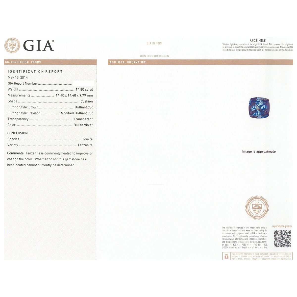One electronically tested 14KT white gold ladies cast tanzanite and diamond ring with a bright polish finish. Condition is new, good workmanship. The featured tanzanite is set within a diamond lattice gallery, completed by a three millimeter wide band. Identified with markings of "K14". Containing: One prong set square cushion modified brilliant cut natural tanzanite, measuring 14.40 x 14.40 x 9.79mm, exact weight 14.80ct., clarity is eye clean, type I, medium dark, very slightly grayish, bluish violet color, (GIA bV 6/3), cut is good. Transmitting light with no distortion, transparent. GIA Gemological Report attached. Graded loose prior to setting in the GIA Laboratory, Report # 2161097870.Tanzanite is a very rare gemstone that is only found in the country of Tanzania. Originally discovered in 1967. Tiffany & Company, named the stone Tanzanite. It is found in the Usumburu Mountains that border the Umba Valley of northern Tanzania. Tanzanite occurs in gray, brown, violet, blue, reddish-purple, & green. The gem is interesting because of its exceptional pleochroism. Rotated in different directions a tanzanite will exhibit multiple changes of color. Tanzanite has a low tolerance to ultrasonic cleaning, and should not be cleaned using this method. Fifty-Two prong set round brilliant cut diamonds, measuring 2.50 - 2.10 x 1.38mm (depth est.) approximate total weight of 52 Stones = 2.41ct. Graded in the setting. Clarity: SI-2 to I-2. Color: F - H. Total Weight of Colored Stones 14.80ct. Total Weight of Diamonds 2.41ct. Total Weight of Ring 13.20 grams. AIG Appraised at $45,900.00.