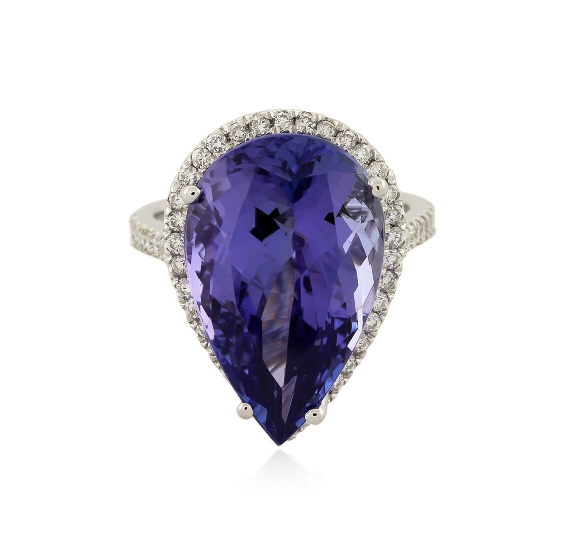 One electronically tested 14KT white gold ladies cast tanzanite & diamond ring with a bright finish. The featured tanzanite is set within a diamond bezel, supported by an elaborate white gold under gallery and diamond set shoulders, completed by a three millimeter wide band. Identified with markings of "14K". Condition is new, good workmanship. Containing: One prong set pear brilliant cut natural tanzanite, measuring 20.33 x 12.96 x 9.09mm, exact weight 14.81ct., clarity is eye clean, type I, medium dark, moderately strong, violet color, (GIA V 6/4), cut is good. Transmitting light with no distortion, transparent. Graded loose prior to setting in the GIA Laboratory, Report # 2175051909. The report is attached. Tanzanite is a very rare gemstone that is only found in the country of Tanzania. Originally discovered in 1967. Tiffany & Company, named the stone Tanzanite. It is found in the Usumburu Mountains that border the Umba Valley of northern Tanzania. Tanzanite occurs in gray, brown, violet, blue, reddish-purple, & green. The gem is interesting because of its exceptional pleochroism. Rotated in different directions a tanzanite will exhibit multiple changes of color. Tanzanite has a low tolerance to ultrasonic cleaning, and should not be cleaned using this method. Fifty-Two prong set round brilliant cut diamonds, measuring 1.55 - 1.40 x 0.89mm (depth est.) approximate total weight of 52 Stones = 0.62ct. Graded in the setting. Clarity: SI-2 to I-1. Color: H - I. Total Weight of Colored Stones 14.81ct. Total Weight of Diamonds 0.62ct. Total Weight of Ring 8.51 grams. AIG Appraised at $38,000.00.