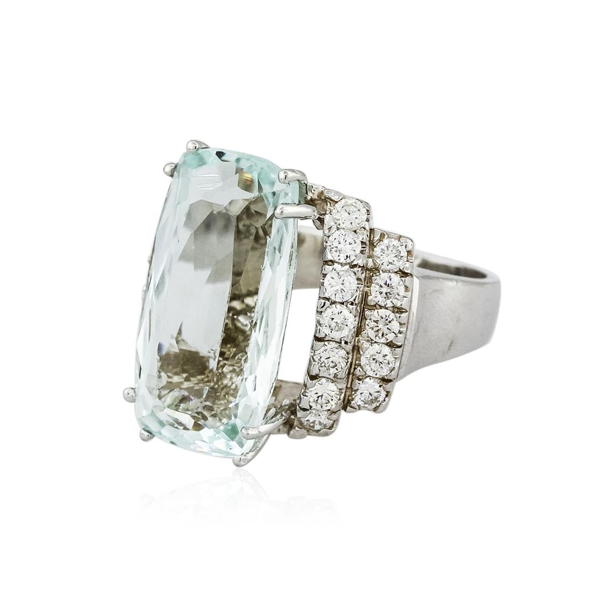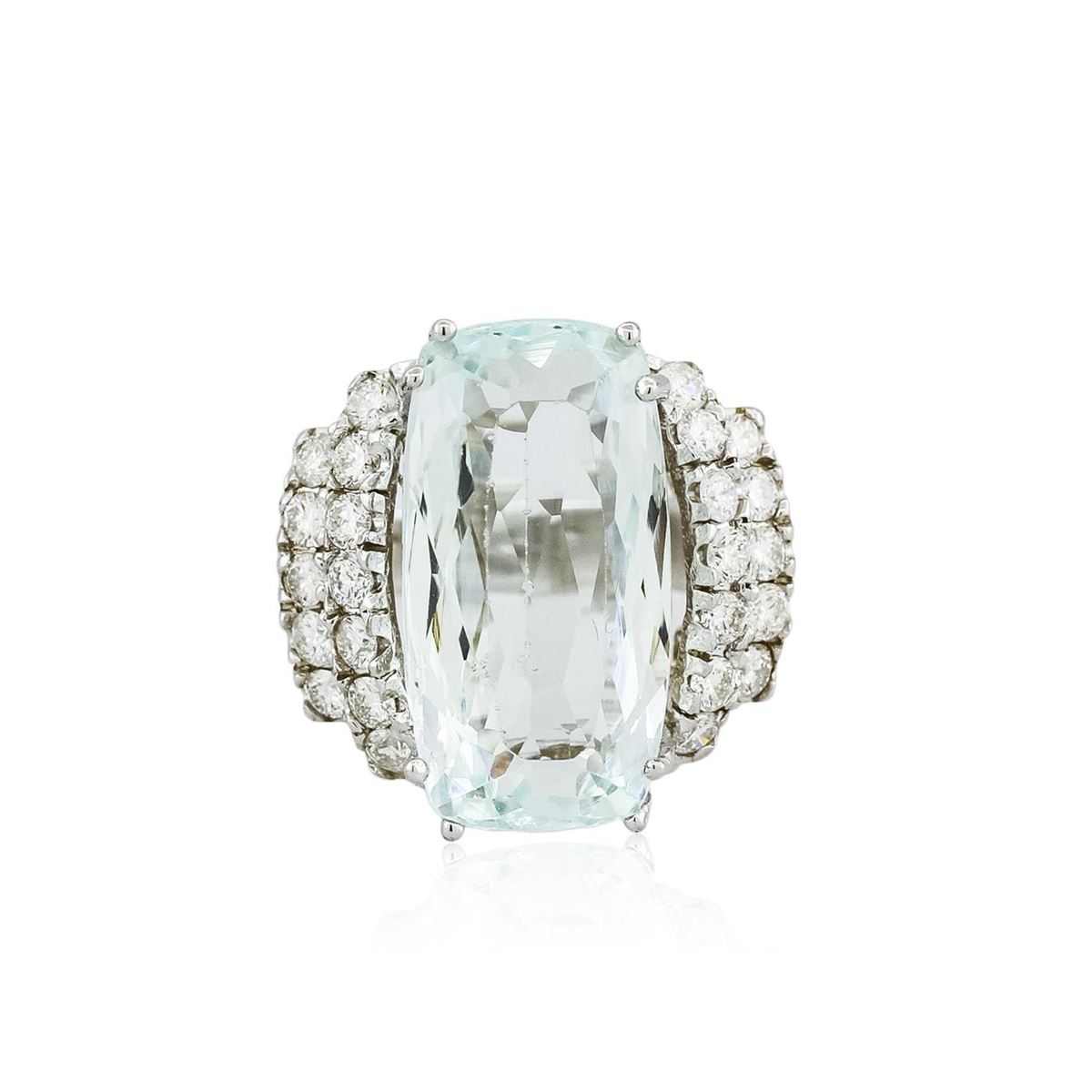 One electronically tested 14KT white gold ladies cast aquamarine and diamond ring with a bright polish finish. Condition is new, good workmanship. The featured aquamarine is supported by diamond set shoulders, completed by a three and one-half millimeter wide band. Identified with markings of "14K". Containing: One prong set cushion modified brilliant cut natural aquamarine, measuring 22.05 x 11.70 x 8.03mm, exact weight 15.62ct., type I Clarity is slightly included, light, very slightly grayish, green-blue color, (GIA GB 3/3), cut is good. Transmitting light with a minimum of distortion, transparent. Naturally occurring internal & external characteristics are present. GIA Gemological Report attached. Graded loose prior to setting in the GIA Laboratory, Report #1156953518.Twenty-Four prong set round brilliant cut diamonds, measuring 2.60 - 2.50 x 1.53mm (depth est.) approximate. Total Weight of 24 Stones = 1.55ct. Graded in the setting. Clarity: SI-1 to I-1. Color: G - I. Total Weight of Colored Stones 15.62ct. Total Weight of Diamonds 1.55ct. Total Weight of Ring 13.41gm. AIG Appraised at $12,655.00.