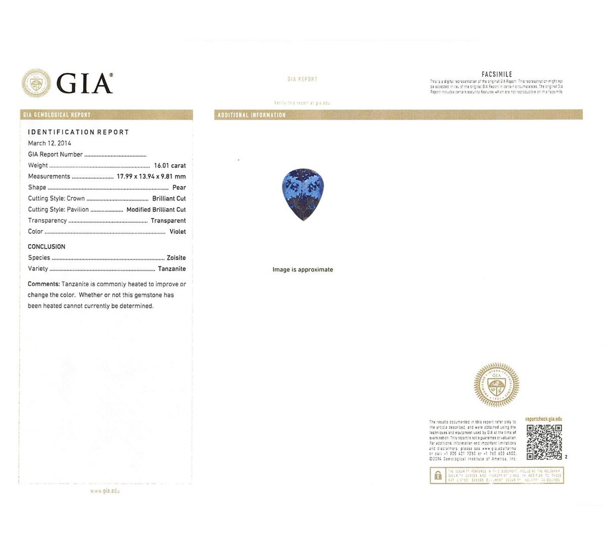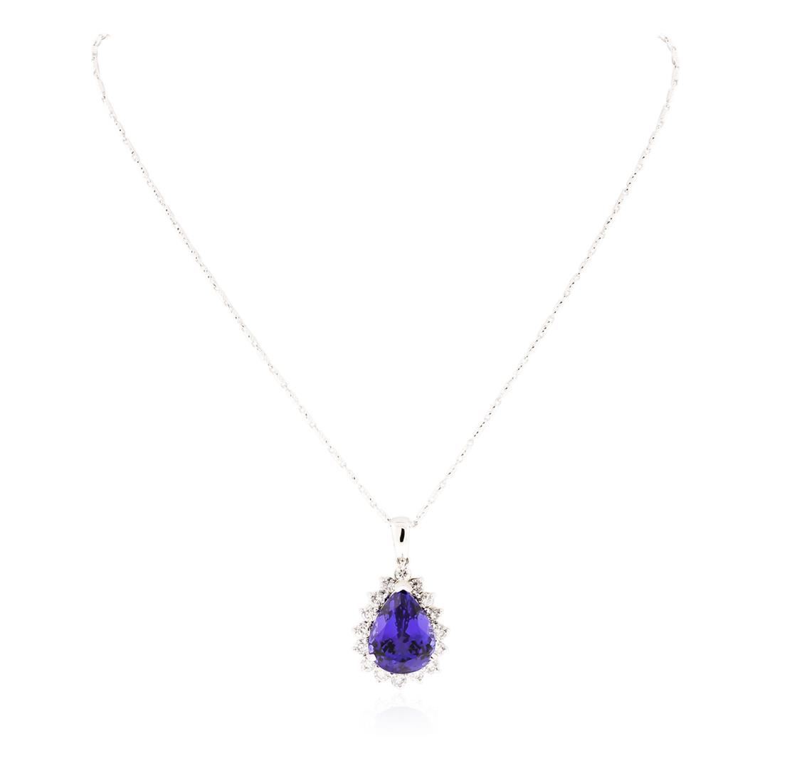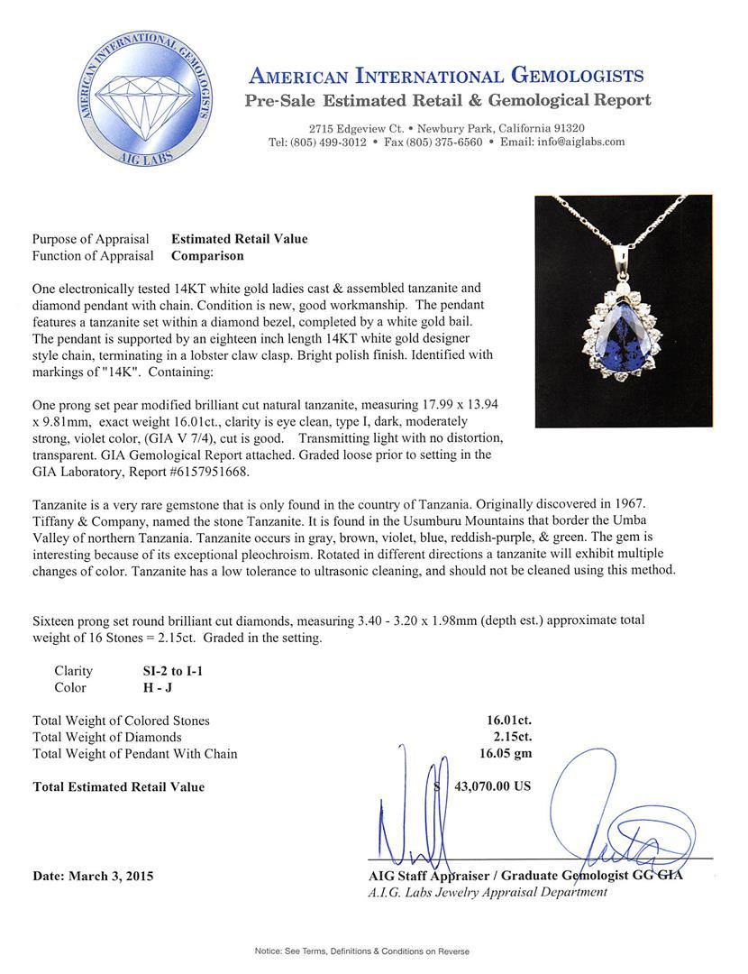 One electronically tested 14KT white gold ladies cast & assembled tanzanite and diamond pendant with chain. The pendant features a tanzanite set within a diamond bezel, completed by a white gold bail. The pendant is supported by an eighteen inch length 14KT white gold designer style chain, terminating in a lobster claw clasp. Bright polish finish. Identified with markings of "14K". Condition is new, good workmanship. Containing: One prong set pear modified brilliant cut natural tanzanite, measuring 17.99 x 13.94 x 9.81mm, exact weight 16.01ct., clarity is eye clean, type I, dark, moderately strong, violet color, (GIA V 7/4), cut is good. Transmitting light with no distortion, transparent. GIA Gemological Report attached. Graded loose prior to setting in the GIA Laboratory, Report #6157951668.Tanzanite is a very rare gemstone that is only found in the country of Tanzania. Originally discovered in 1967. Tiffany & Company, named the stone Tanzanite. It is found in the Usumburu Mountains that border the Umba Valley of northern Tanzania. Tanzanite occurs in gray, brown, violet, blue, reddish-purple, & green. The gem is interesting because of its exceptional pleochroism. Rotated in different directions a tanzanite will exhibit multiple changes of color. Tanzanite has a low tolerance to ultrasonic cleaning, and should not be cleaned using this method. Sixteen prong set round brilliant cut diamonds, measuring 3.40 - 3.20 x 1.98mm (depth est.) approximate total weight of 16 Stones = 2.15ct. Graded in the setting. Clarity: SI-2 to I-1. Color: H - J. Total Weight of Colored Stones 16.01ct. Total Weight of Diamonds 2.15ct. Total Weight of Pendant With Chain 16.05 grams. AIG Appraised at $43,070.00.