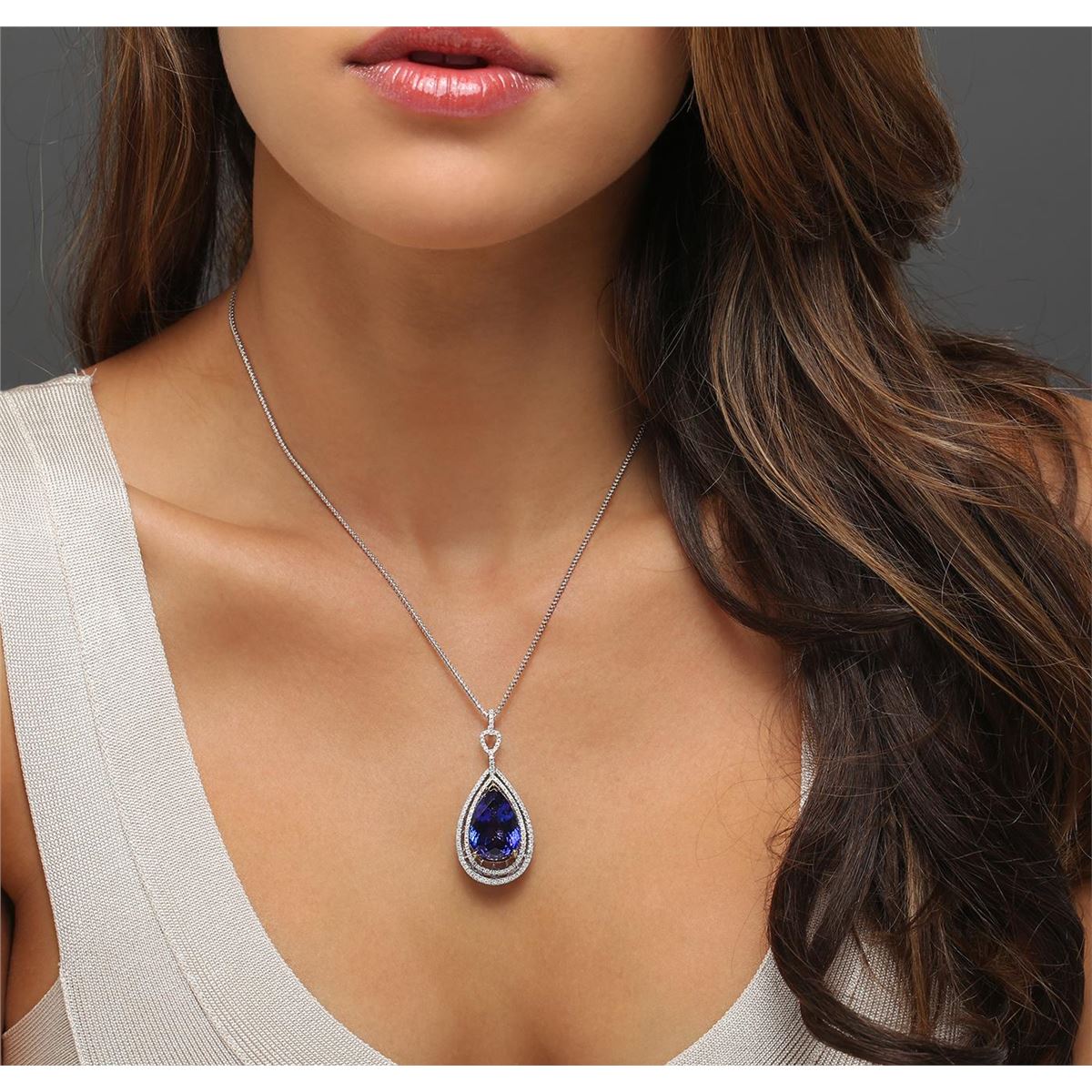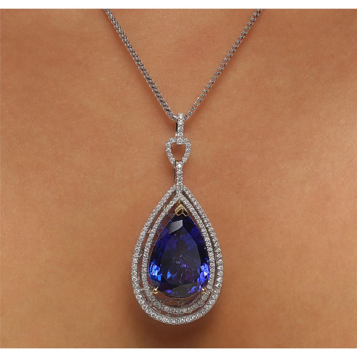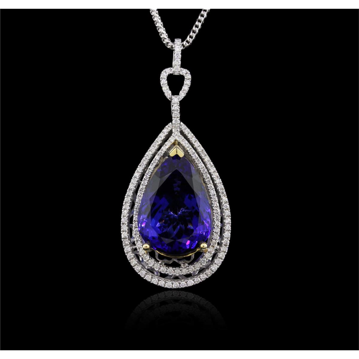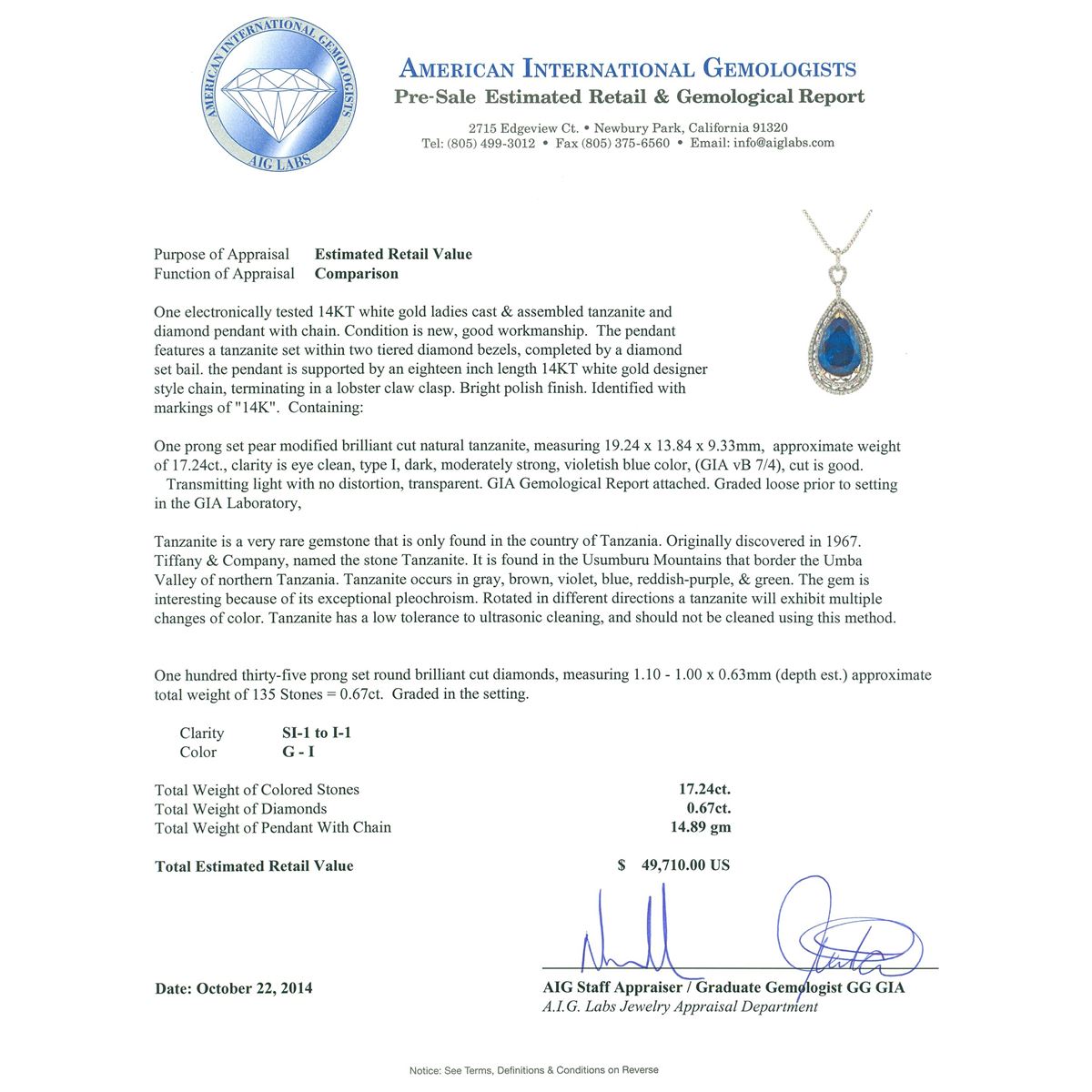 One electronically tested 14KT white gold ladies cast & assembled tanzanite and diamond pendant with chain. The pendant features a tanzanite set within two tiered diamond bezels, completed by a diamond set bail. the pendant is supported by an eighteen inch length 14KT white gold designer style chain, terminating in a lobster claw clasp. Bright polish finish. Identified with markings of 14K. Condition is new, good workmanship. Containing: One prong set pear modified brilliant cut natural tanzanite, measuring 19.24 x 13.84 x 9.33mm, approximate weight of 17.24ct., clarity is eye clean, type I, dark, moderately strong, violetish blue color, (GIA vB 7/4), cut is good. Transmitting light with no distortion, transparent. GIA Gemological Report attached. Graded loose prior to setting in the GIA Laboratory, Report #2161542457.Tanzanite is a very rare gemstone that is only found in the country of Tanzania. Originally discovered in 1967. Tiffany & Company, named the stone Tanzanite. It is found in the Usumburu Mountains that border the Umba Valley of northern Tanzania. Tanzanite occurs in gray, brown, violet, blue, reddish-purple, & green. The gem is interesting because of its exceptional pleochroism. Rotated in different directions a tanzanite will exhibit multiple changes of color. Tanzanite has a low tolerance to ultrasonic cleaning, and should not be cleaned using this method. One Hundred Thirty-Five prong set round brilliant cut diamonds, measuring 1.10 - 1.00 x 0.63mm (depth est.) approximate total weight of 135 Stones = 0.67ct. Graded in the setting. Clarity: SI-1 to I-1. Color: G - I. Total Weight of Colored Stones 17.24ct. Total Weight of Diamonds 0.67ct. Total Weight of Pendant With Chain 14.89 grams. AIG Appraised at $49,710.00.