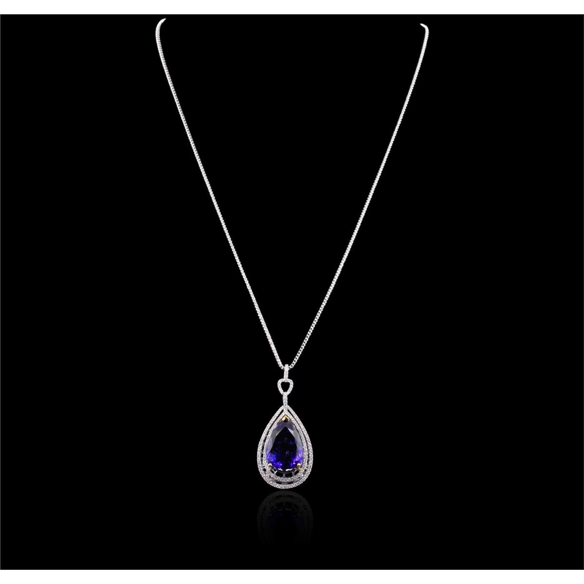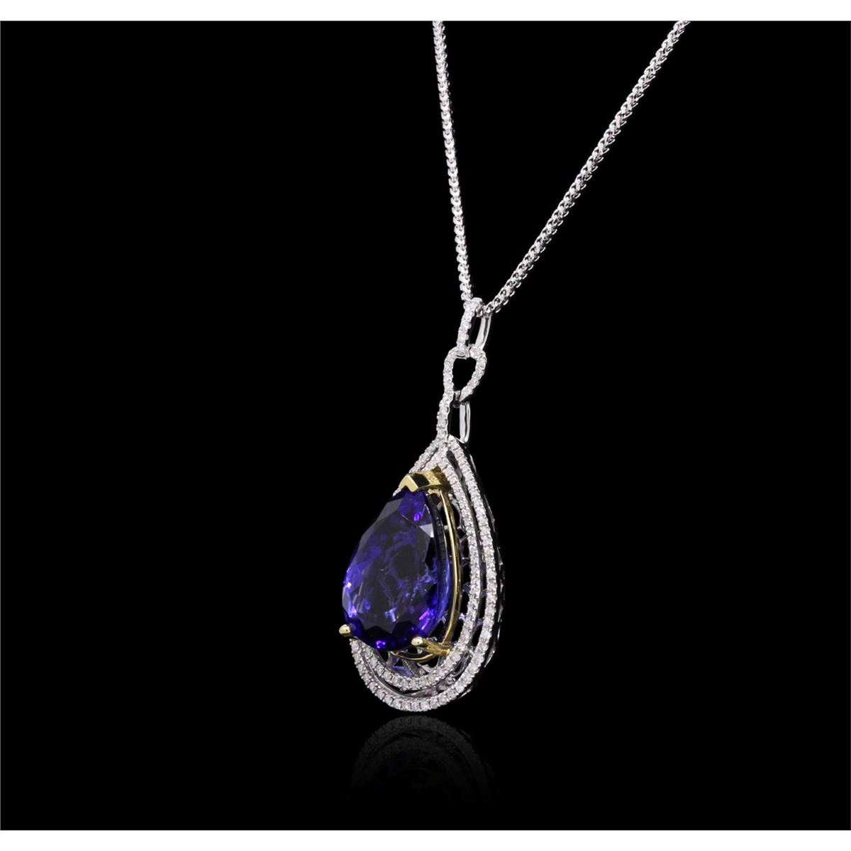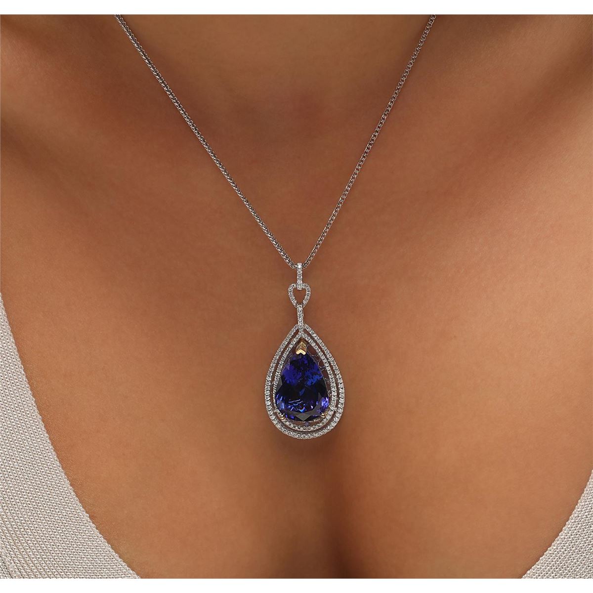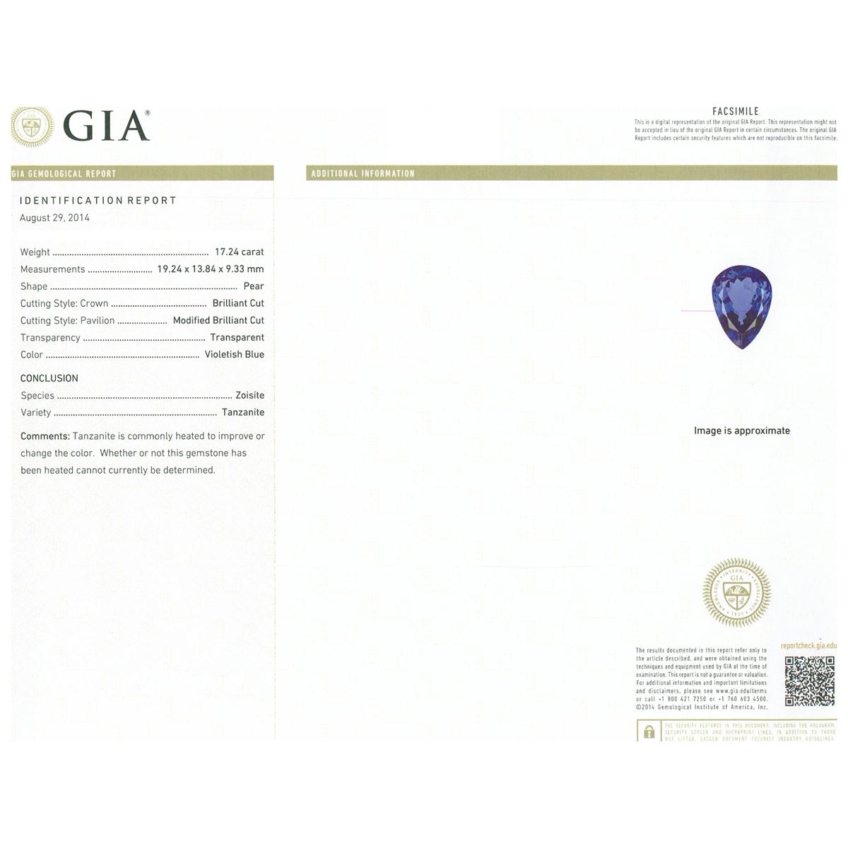 One electronically tested 14KT white gold ladies cast & assembled tanzanite and diamond pendant with chain. The pendant features a tanzanite set within two tiered diamond bezels, completed by a diamond set bail. the pendant is supported by an eighteen inch length 14KT white gold designer style chain, terminating in a lobster claw clasp. Bright polish finish. Identified with markings of 14K. Condition is new, good workmanship. Containing: One prong set pear modified brilliant cut natural tanzanite, measuring 19.24 x 13.84 x 9.33mm, approximate weight of 17.24ct., clarity is eye clean, type I, dark, moderately strong, violetish blue color, (GIA vB 7/4), cut is good. Transmitting light with no distortion, transparent. GIA Gemological Report attached. Graded loose prior to setting in the GIA Laboratory, Report #2161542457.Tanzanite is a very rare gemstone that is only found in the country of Tanzania. Originally discovered in 1967. Tiffany & Company, named the stone Tanzanite. It is found in the Usumburu Mountains that border the Umba Valley of northern Tanzania. Tanzanite occurs in gray, brown, violet, blue, reddish-purple, & green. The gem is interesting because of its exceptional pleochroism. Rotated in different directions a tanzanite will exhibit multiple changes of color. Tanzanite has a low tolerance to ultrasonic cleaning, and should not be cleaned using this method. One Hundred Thirty-Five prong set round brilliant cut diamonds, measuring 1.10 - 1.00 x 0.63mm (depth est.) approximate total weight of 135 Stones = 0.67ct. Graded in the setting. Clarity: SI-1 to I-1. Color: G - I. Total Weight of Colored Stones 17.24ct. Total Weight of Diamonds 0.67ct. Total Weight of Pendant With Chain 14.89 grams. AIG Appraised at $49,710.00.