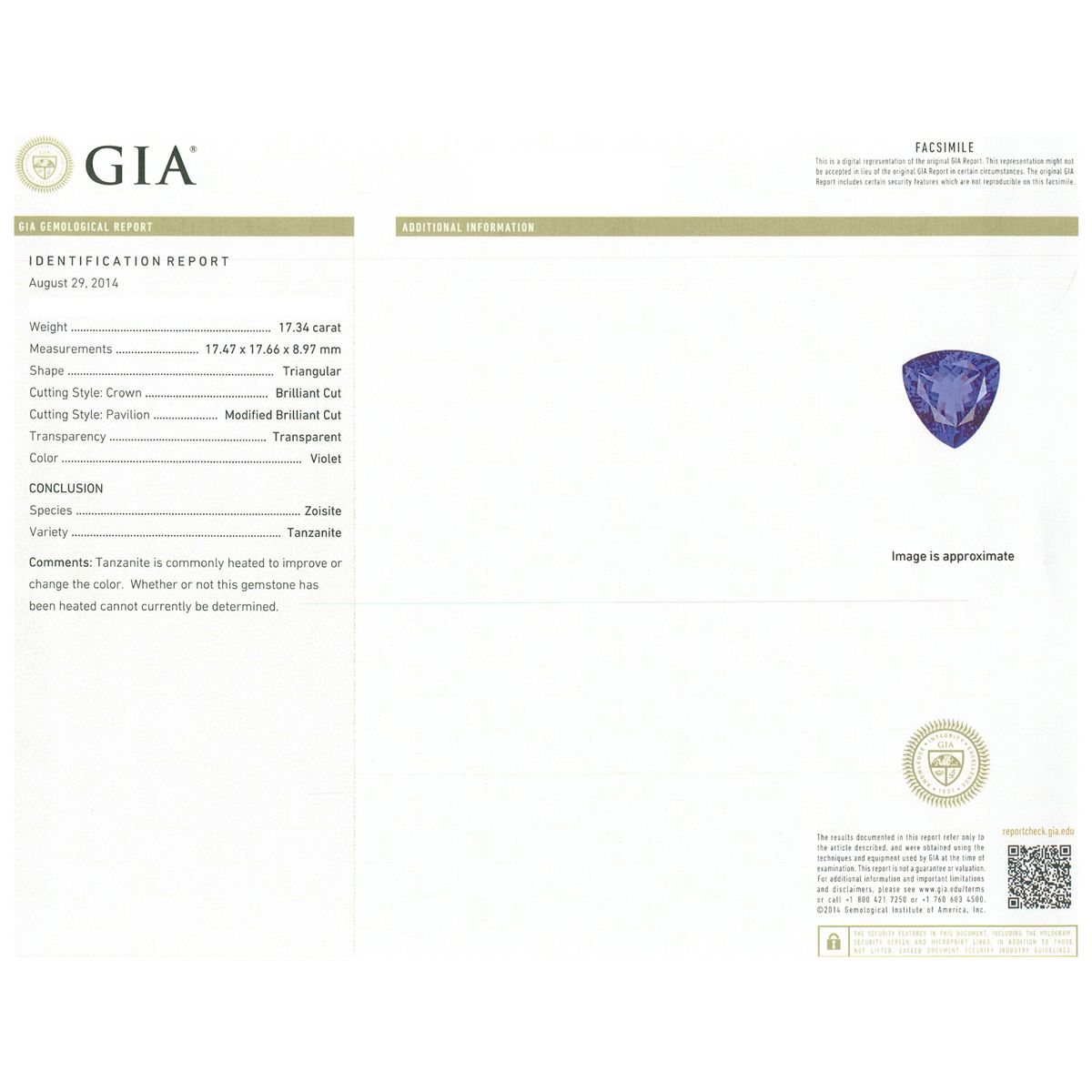 One electronically tested 14KT white gold ladies cast tanzanite and diamond ring with a bright polish finish. The featured tanzanite is set within a tiered diamond bezel, completed by a three and one-half millimeter wide band. Identified with markings of "K14". Condition is new, good workmanship. Containing: One prong set triangular modified brilliant cut natural tanzanite, measuring 17.47 x 17.66 x 8.97mm, exact weight 17.35ct., clarity is eye clean, type I, dark, moderately strong, violet color, (GIA V 7/4), cut is good. Transmitting light with no distortion, transparent. GIA Gemological Report attached. Graded loose prior to setting in the GIA Laboratory, Report #6167542733.Tanzanite is a very rare gemstone that is only found in the country of Tanzania. Originally discovered in 1967. Tiffany & Company, named the stone Tanzanite. It is found in the Usumburu Mountains that border the Umba Valley of northern Tanzania. Tanzanite occurs in gray, brown, violet, blue, reddish-purple, & green. The gem is interesting because of its exceptional pleochroism. Rotated in different directions a tanzanite will exhibit multiple changes of color. Tanzanite has a low tolerance to ultrasonic cleaning, and should not be cleaned using this method. Thirty prong set round brilliant cut diamonds, measuring 2.20 - 2.20 x 1.32mm (depth est.) approximate total weight of 30 Stones = 1.26ct. Graded in the setting. Clarity: SI-1 to I-1. Color: G - I Twenty-Seven prong set round brilliant cut diamonds, measuring 2.00 - 1.90 x 1.17mm (depth est.) approximate total weight of 27 Stones = 0.83ct. Graded in the setting. Clarity: SI-1 to I-1. Color: G - I. Total Weight of Colored Stones 17.35ct. Total Weight of Diamonds 2.09ct. Total Weight of Ring 13.59 grams. AIG Appraised at $48,100.00.