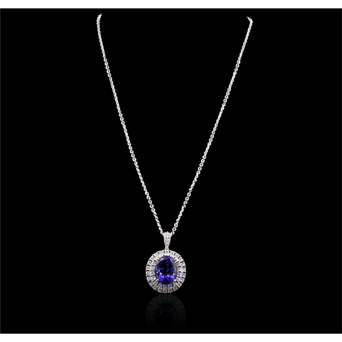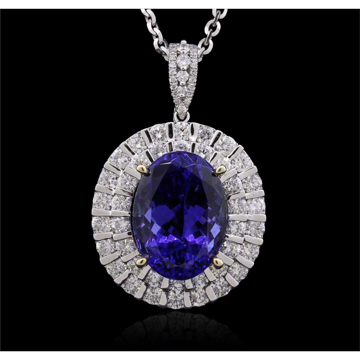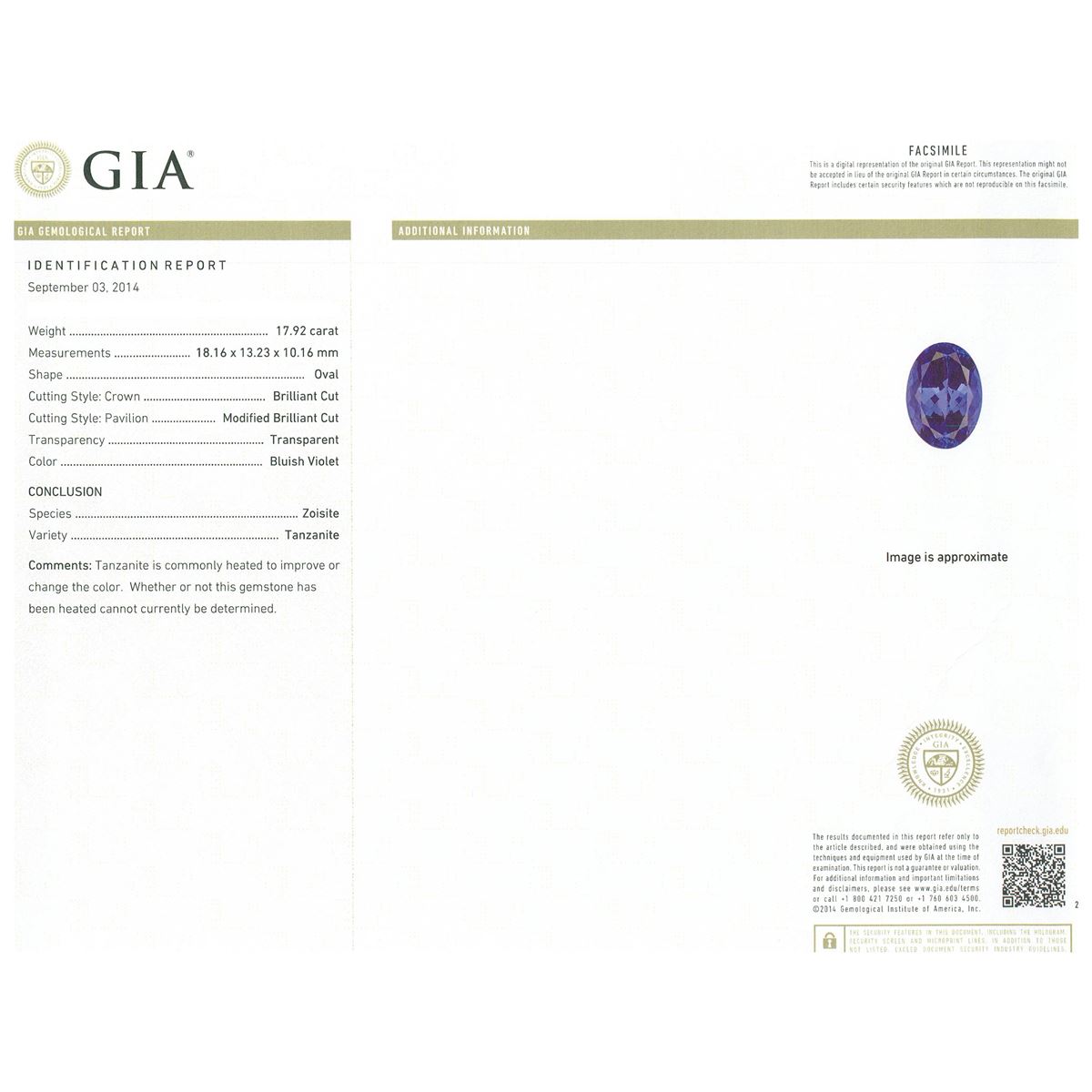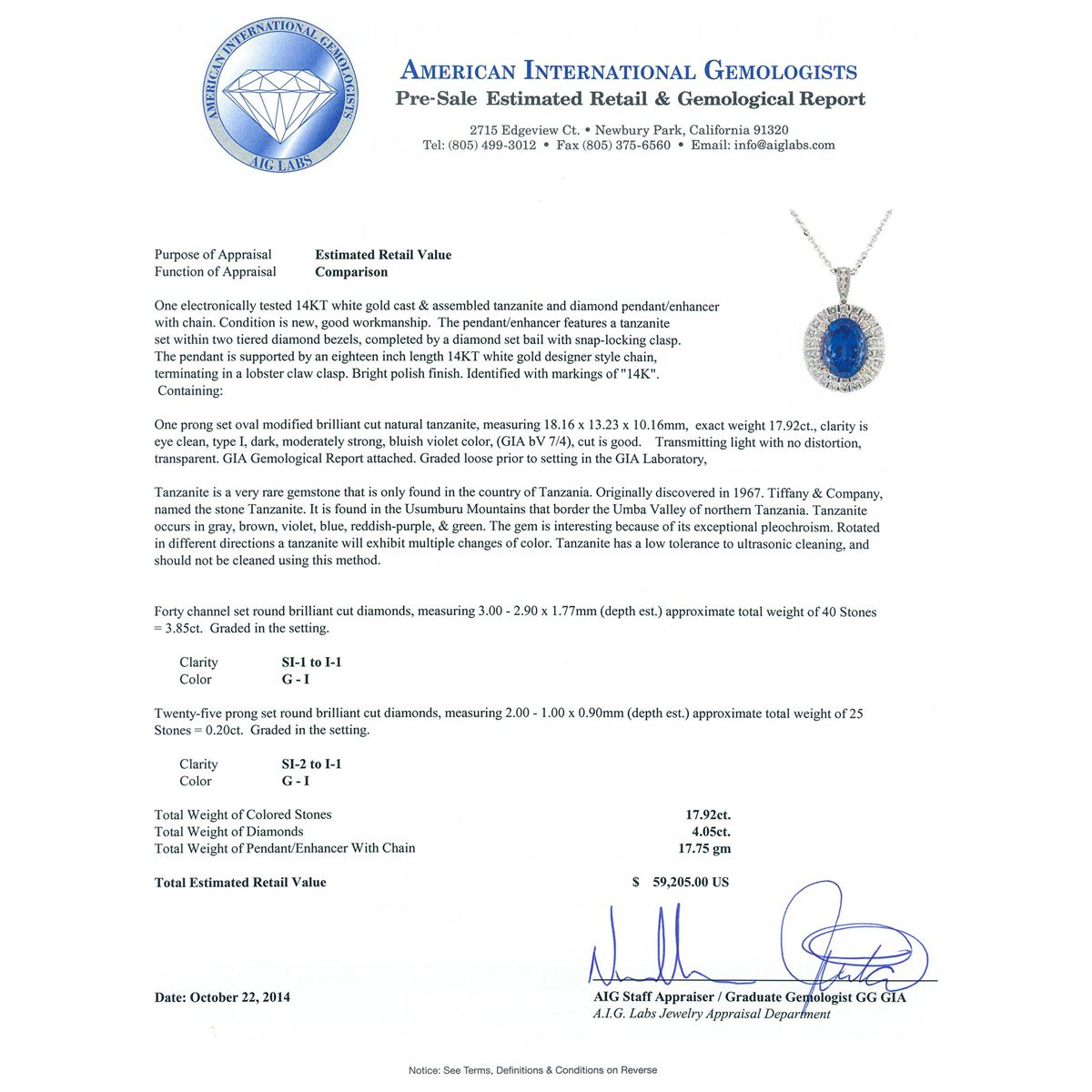 One electronically tested 14KT white gold cast & assembled tanzanite and diamond pendant/enhancer with chain. The pendant/enhancer features a tanzanite set within two tiered diamond bezels, completed by a diamond set bail with snap-locking clasp. The pendant is supported by an eighteen inch length 14KT white gold designer style chain, terminating in a lobster claw clasp. Bright polish finish. Identified with markings of 14K. Condition is new, good workmanship. Containing: One prong set oval modified brilliant cut natural tanzanite, measuring 18.16 x 13.23 x 10.16mm, exact weight 17.92ct., clarity is eye clean, type I, dark, moderately strong, bluish violet color, (GIA bV 7/4), cut is good. Transmitting light with no distortion, transparent. GIA Gemological Report attached. Graded loose prior to setting in the GIA Laboratory, Report #1166542784.Tanzanite is a very rare gemstone that is only found in the country of Tanzania. Originally discovered in 1967. Tiffany & Company, named the stone Tanzanite. It is found in the Usumburu Mountains that border the Umba Valley of northern Tanzania. Tanzanite occurs in gray, brown, violet, blue, reddish-purple, & green. The gem is interesting because of its exceptional pleochroism. Rotated in different directions a tanzanite will exhibit multiple changes of color. Tanzanite has a low tolerance to ultrasonic cleaning, and should not be cleaned using this method. Forty channel set round brilliant cut diamonds, measuring 3.00 - 2.90 x 1.77mm (depth est.) approximate total weight of 40 Stones = 3.85ct. Graded in the setting. Clarity: SI-1 to I-1. Color: G - I Twenty-Five prong set round brilliant cut diamonds, measuring 2.00 - 1.00 x 0.90mm (depth est.) approximate total weight of 25 Stones = 0.20ct. Graded in the setting. Clarity: SI-2 to I-1. Color: G - I. Total Weight of Colored Stones 17.92ct. Total Weight of Diamonds 4.05ct. Total Weight of Pendant/Enhancer With Chain 17.75 grams. AIG Appraised at $59,205.00.