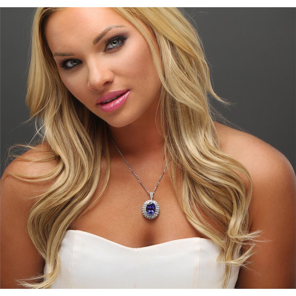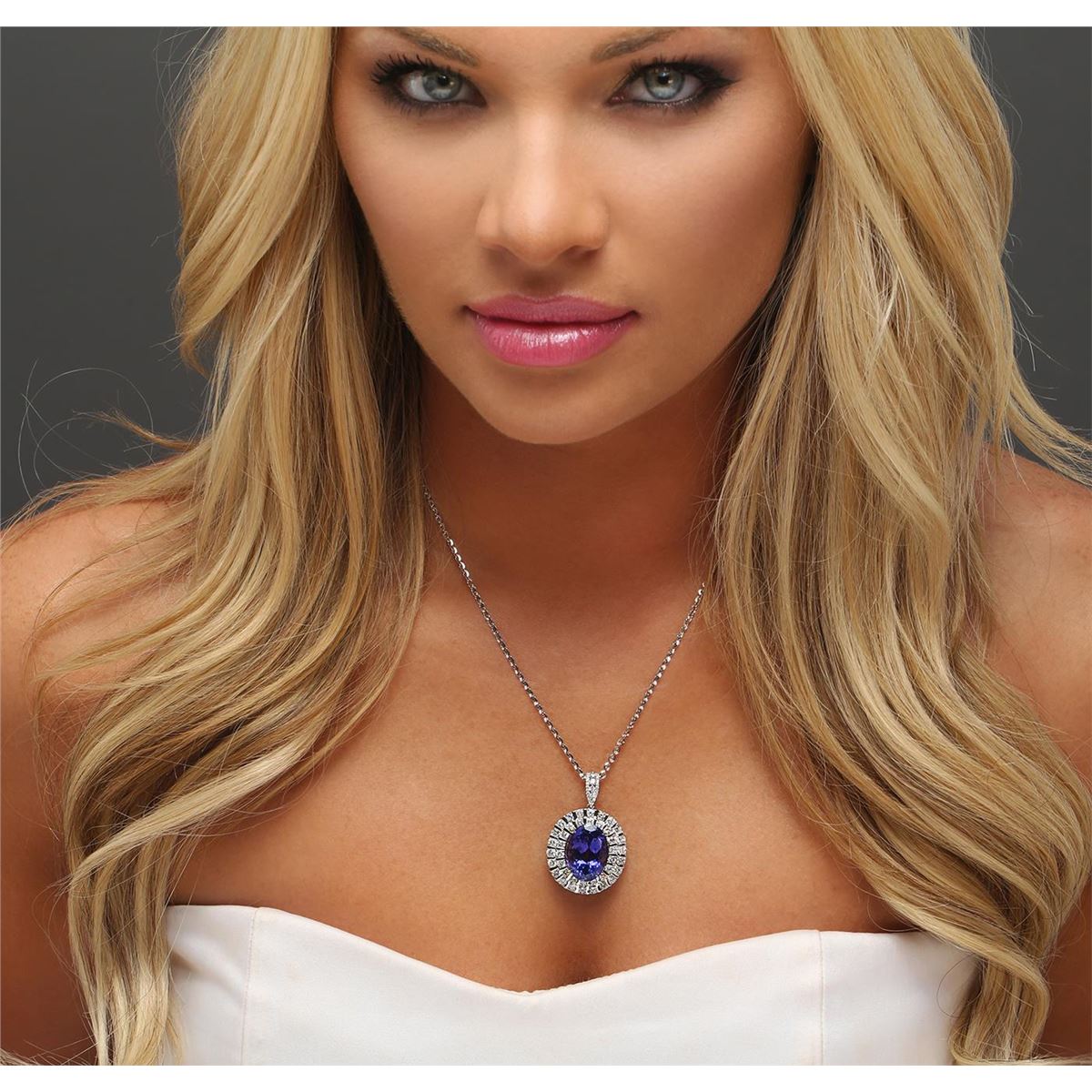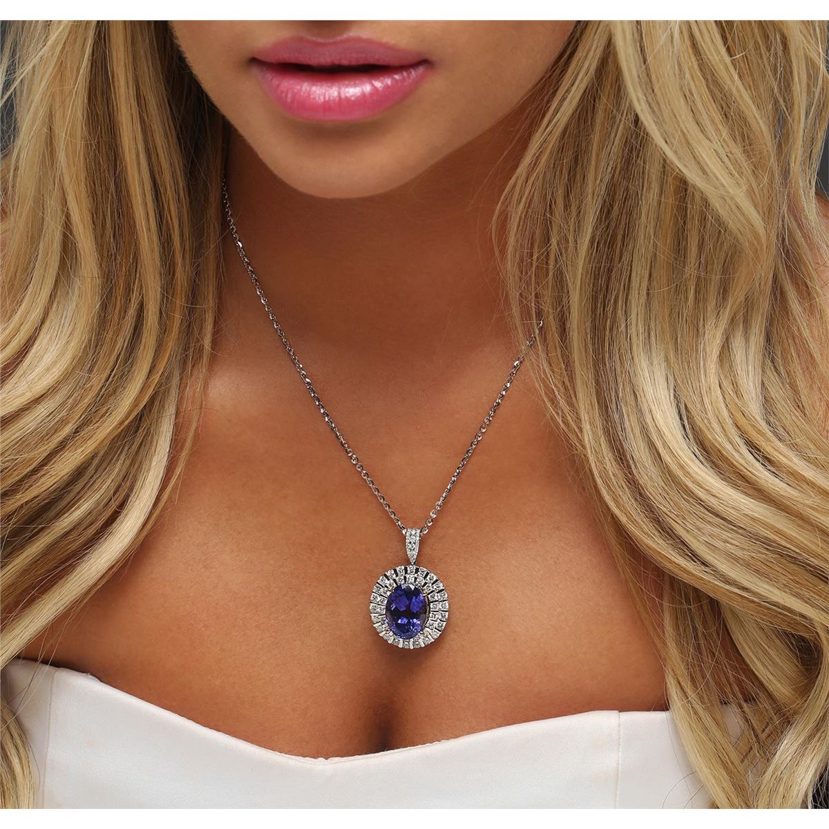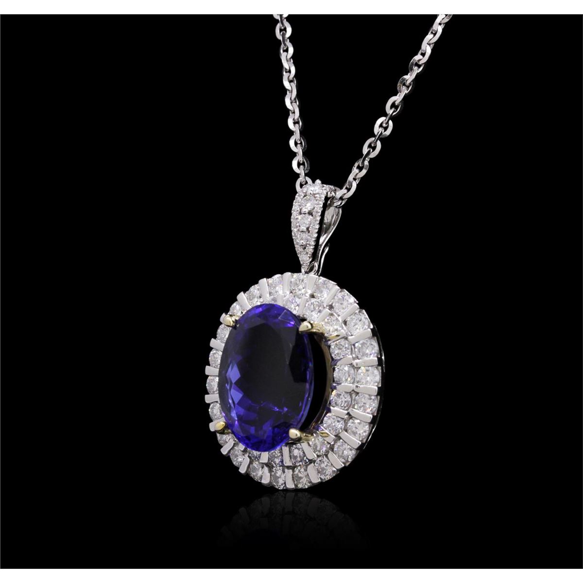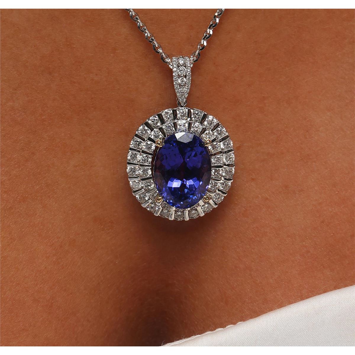One electronically tested 14KT white gold cast & assembled tanzanite and diamond pendant/enhancer with chain. The pendant/enhancer features a tanzanite set within two tiered diamond bezels, completed by a diamond set bail with snap-locking clasp. The pendant is supported by an eighteen inch length 14KT white gold designer style chain, terminating in a lobster claw clasp. Bright polish finish. Identified with markings of 14K. Condition is new, good workmanship. Containing: One prong set oval modified brilliant cut natural tanzanite, measuring 18.16 x 13.23 x 10.16mm, exact weight 17.92ct., clarity is eye clean, type I, dark, moderately strong, bluish violet color, (GIA bV 7/4), cut is good. Transmitting light with no distortion, transparent. GIA Gemological Report attached. Graded loose prior to setting in the GIA Laboratory, Report #1166542784.Tanzanite is a very rare gemstone that is only found in the country of Tanzania. Originally discovered in 1967. Tiffany & Company, named the stone Tanzanite. It is found in the Usumburu Mountains that border the Umba Valley of northern Tanzania. Tanzanite occurs in gray, brown, violet, blue, reddish-purple, & green. The gem is interesting because of its exceptional pleochroism. Rotated in different directions a tanzanite will exhibit multiple changes of color. Tanzanite has a low tolerance to ultrasonic cleaning, and should not be cleaned using this method. Forty channel set round brilliant cut diamonds, measuring 3.00 - 2.90 x 1.77mm (depth est.) approximate total weight of 40 Stones = 3.85ct. Graded in the setting. Clarity: SI-1 to I-1. Color: G - I Twenty-Five prong set round brilliant cut diamonds, measuring 2.00 - 1.00 x 0.90mm (depth est.) approximate total weight of 25 Stones = 0.20ct. Graded in the setting. Clarity: SI-2 to I-1. Color: G - I. Total Weight of Colored Stones 17.92ct. Total Weight of Diamonds 4.05ct. Total Weight of Pendant/Enhancer With Chain 17.75 grams. AIG Appraised at $59,205.00.