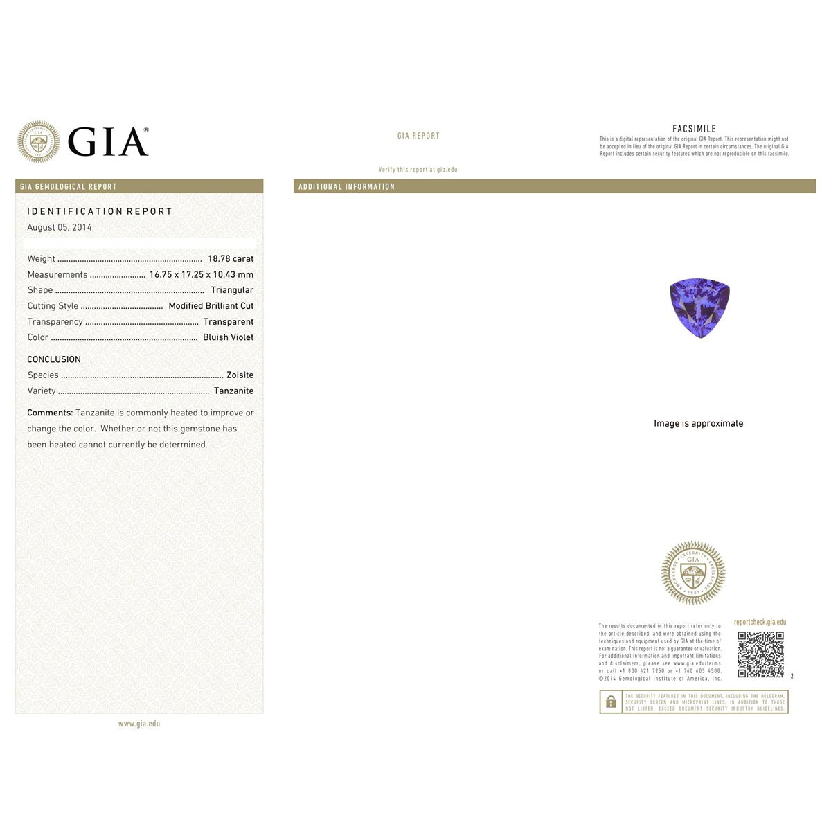 One electronically tested 14KT white gold ladies combination cast & assembled prong set ring with a flat shank with a bright polish finish. Identified with markings of "K14". Condition is new. Containing: One prong set triangle modified brilliant cut natural tanzanite, measuring 16.75 x 17.25 x 10.43mm, approximate weight of 18.78ct., clarity is eye clean, type I, medium, moderately strong, bluish violet color, (GIA bV 5/4), cut is excellent. Graded loose prior to setting by GIA Gemological Laboratory. GIA Report # 6167453339. Sixty-Two prong set round brilliant cut diamonds, measuring 2.00 - 1.70 x 1.11mm (depth est.) approximate total weight of 62 Stones = 1.66ct. Clarity: I-1 to I-2. Color: H - I, Cut is Good. Colored gemstones are presumed to have been subjected to commonly used enhancement processes. All diamonds and colored gemstones are graded in the mounting, unless otherwise stated. Total Weight of Colored Stones 18.78ct. Total Weight of Diamonds 1.66ct. Total Weight of Ring 13.50 grams. GGL Appraised at $50,145.00.