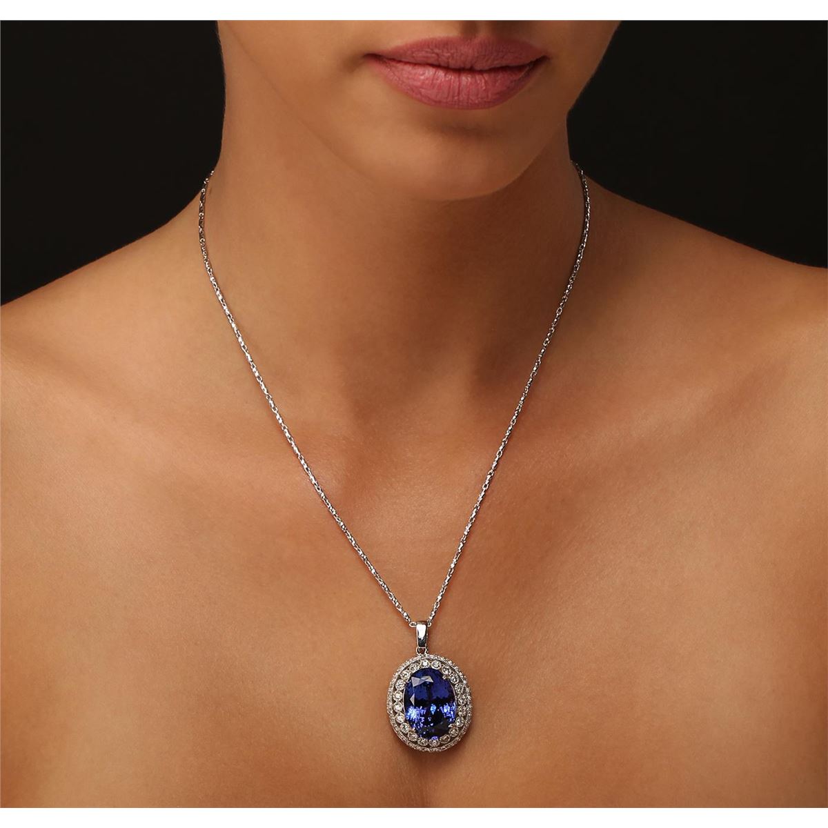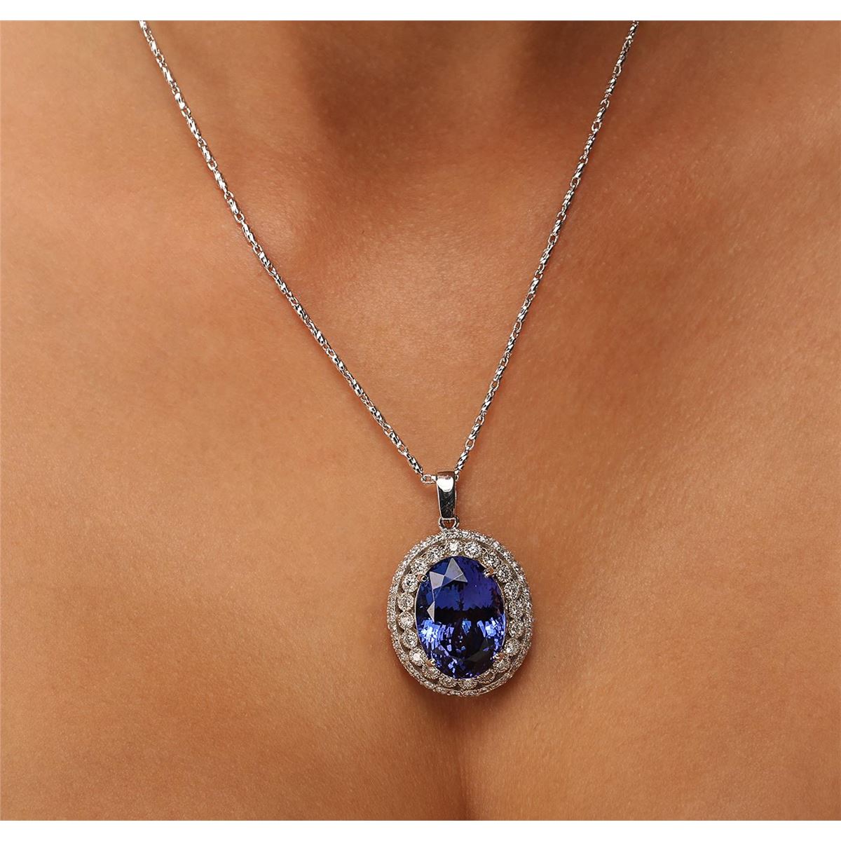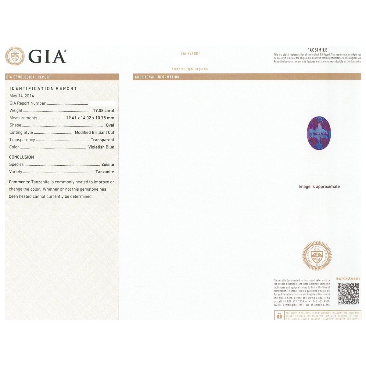 One electronically tested 14KT white gold ladies cast & assembled tanzanite and diamond pendant with chain. Condition is new, good workmanship. The pendant features a tanzanite set within two stylized diamond bezels, completed by a white gold bail. The pendant is supported by an eighteen inch length 14KT white gold designer style chain, terminating in a lobster claw clasp. Bright polish finish with milgrain detailing. Identified with markings of "K14". Containing: One prong set oval modified brilliant cut natural tanzanite, measuring 19.41 x 14.02 x 10.75mm, exact weight 19.08ct., clarity is eye clean, type I, dark, moderately strong, violetish blue color, (GIA vB 7/4), cut is good. Transmitting light with no distortion, transparent. GIA Gemological Report attached. Graded loose prior to setting in the GIA Laboratory, Report #6167081398.Tanzanite is a very rare gemstone that is only found in the country of Tanzania. Originally discovered in 1967. Tiffany & Company, named the stone Tanzanite. It is found in the Usumburu Mountains that border the Umba Valley of northern Tanzania. Tanzanite occurs in gray, brown, violet, blue, reddish-purple, & green. The gem is interesting because of its exceptional pleochroism. Rotated in different directions a tanzanite will exhibit multiple changes of color. Tanzanite has a low tolerance to ultrasonic cleaning, and should not be cleaned using this method. Fifty-Four prong and bezel set round brilliant cut diamonds, measuring 2.30 - 2.00 x 1.29mm (depth est.) approximate total weight of 54 Stones = 2.06ct. Graded in the setting. Clarity: SI-1 to I-1 . Color: G - I. Total Weight of Colored Stones 19.08ct. Total Weight of Diamonds 2.06ct. Total Weight of Pendant With Chain 19.07 grams. AIG Appraised at $56,490.00.