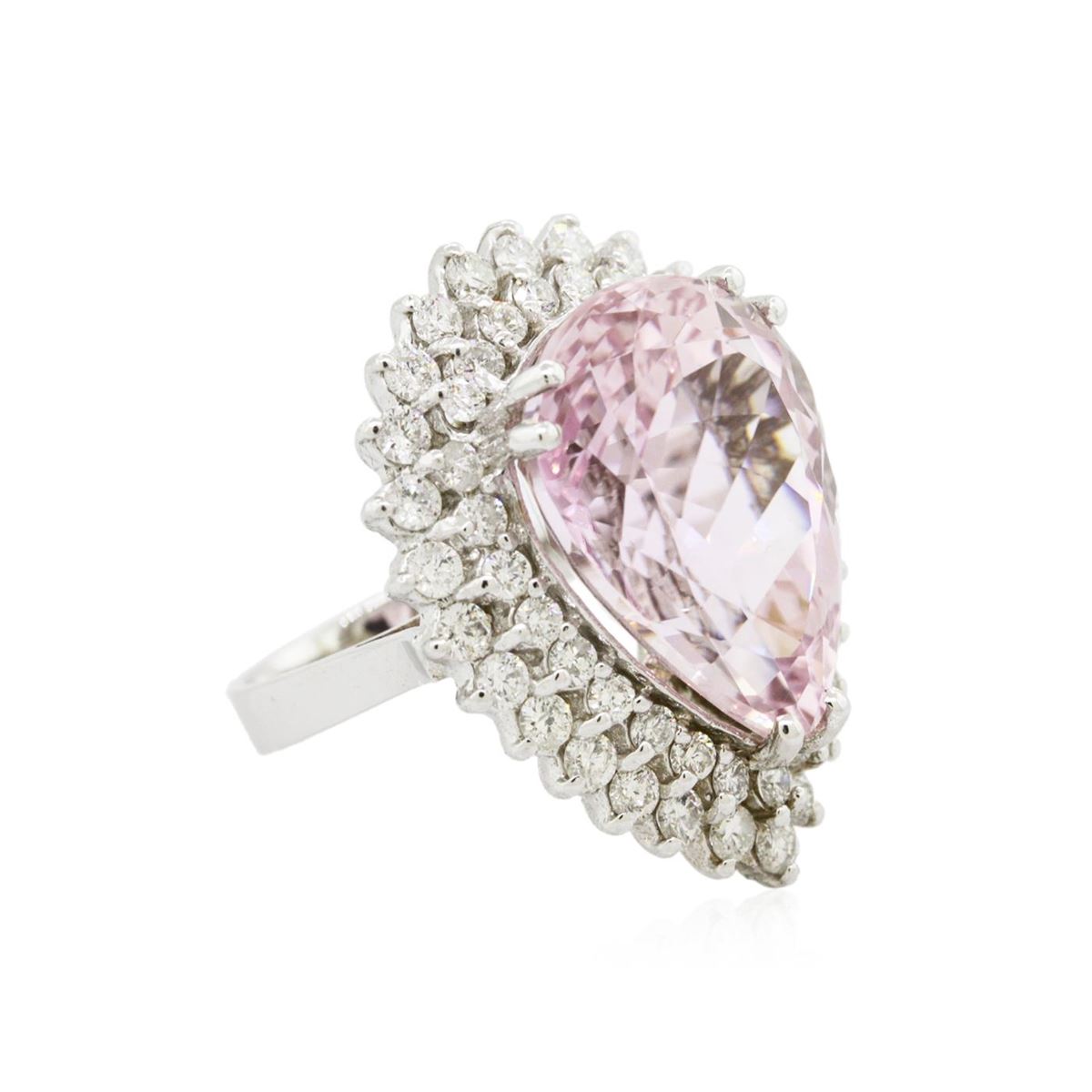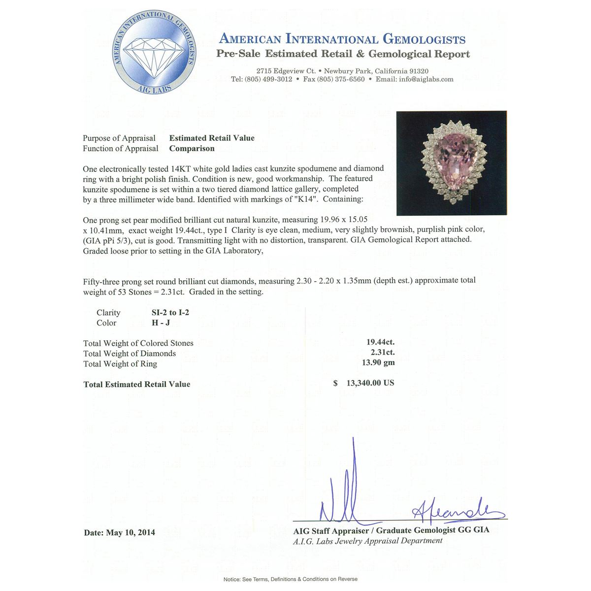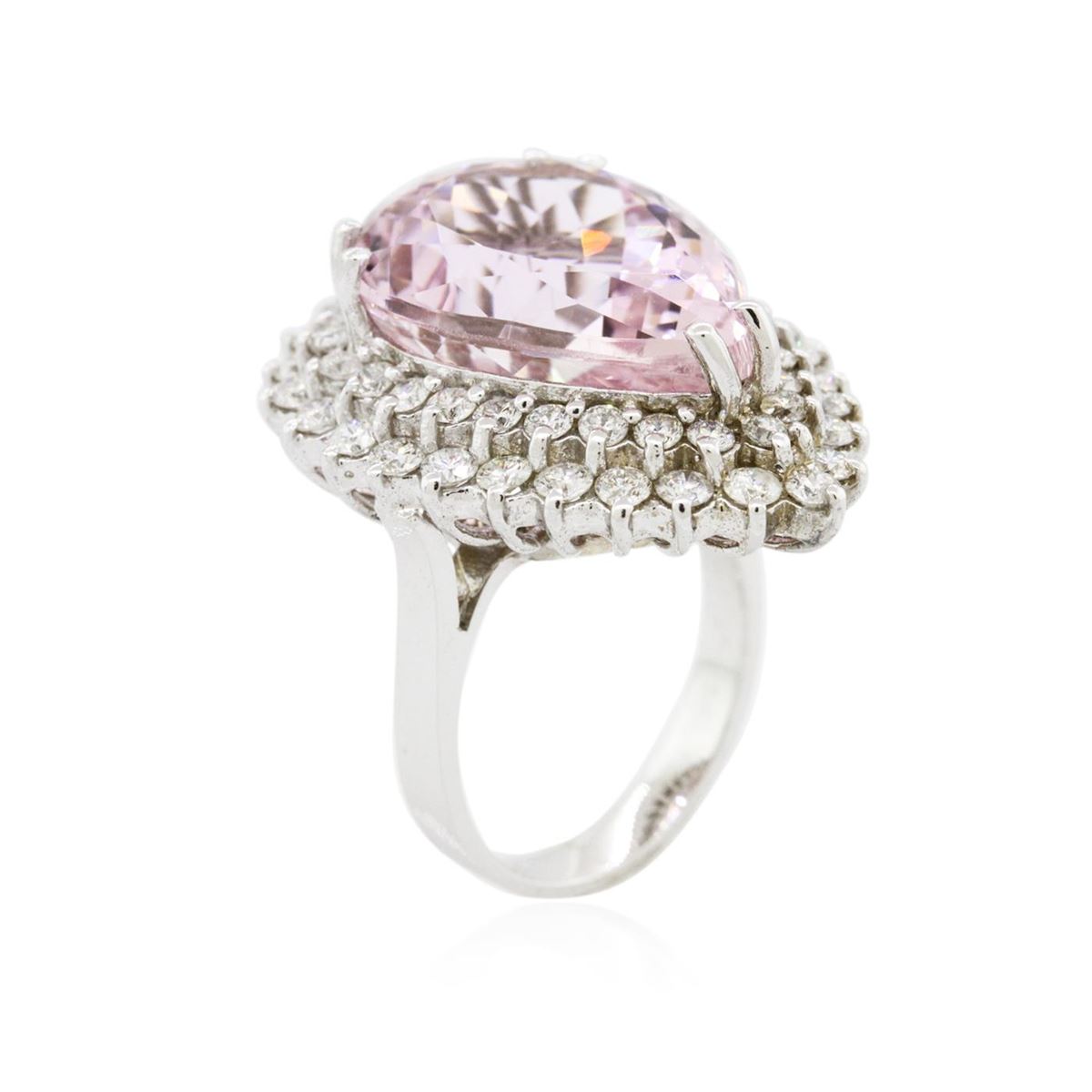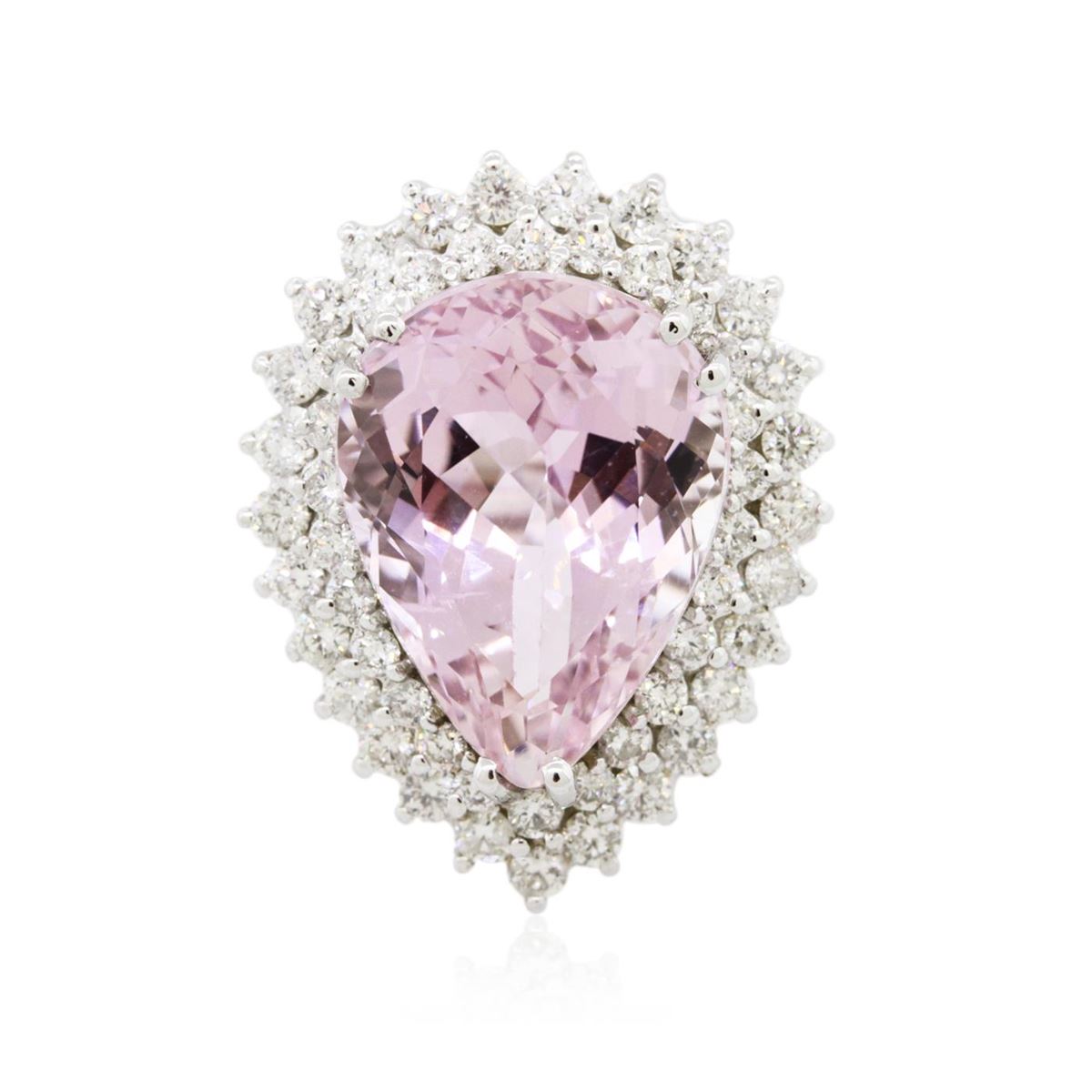 One electronically tested 14KT white gold ladies cast kunzite spodumene and diamond ring with a bright polish finish. Condition is new, good workmanship. The featured kunzite spodumene is set within a two tiered diamond lattice gallery, completed by a three millimeter wide band. Identified with markings of "K14". Containing: One prong set pear modified brilliant cut natural kunzite, measuring 19.96 x 15.05 x 10.41mm, exact weight 19.44ct., type I Clarity is eye clean, medium, very slightly brownish, purplish pink color, (GIA pPi 5/3), cut is good. Transmitting light with no distortion, transparent. GIA Gemological Report attached. Graded loose prior to setting in the GIA Laboratory, Report #2151952742.Fifty-Three prong set round brilliant cut diamonds, measuring 2.30 - 2.20 x 1.35mm (depth est.) approximate. Total Weight of 53 Stones = 2.31ct. Graded in the setting. Clarity: SI-2 to I-2. Color: H - J. Total Weight of Colored Stones 19.44ct. Total Weight of Diamonds 2.31ct. Total Weight of Ring 13.90grams. AIG Appraised at $13,340.00.