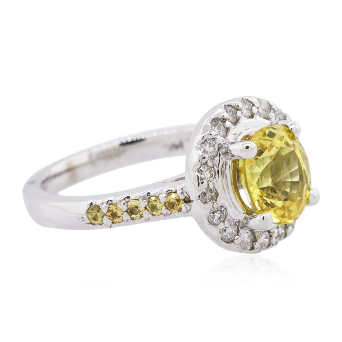 One electronically tested 14KT white gold ladies combination cast & assembled sapphire and diamond ring with a cathedral shank with a bright polish finish. Identified with markings of "14K". Condition is new. Containing: One prong set oval modified step cut natural yellow sapphire, measuring 7.92 x 7.09 x 4.61mm, approximate weight of 2.17ct., clarity is eye clean, type II, medium light, moderately strong, yellow color, (GIA Y 4/4), cut is good. Graded in the Mounting by GIA, Report #1166689588 Dated October 24,2014.Ten prong set round modified brilliant cut natural yellow sapphires, measuring 1.80 - 1.80 x 1.17 mm, approximate total weight of 0.30ct., clarity is moderately included, type II, medium light, slightly brownish, yellow color, (GIA Y 4/2), cut is good. Eighteen prong set round brilliant cut diamonds, measuring 1.50 - 1.50 x 0.90mm (depth est.) approximate total weight of 18 Stones = 0.22ct. Clarity: SI-1 to SI-2. Color: H - I, Cut is Good. Colored gemstones are presumed to have been subjected to commonly used enhancement processes. All diamonds and colored gemstones are graded in the mounting, unless otherwise stated. Total Weight of Colored Stones 2.47ct. Total Weight of Diamonds 0.22ct. Total Weight of Ring 6.50 grams. GGL Appraised at $5,195.00.