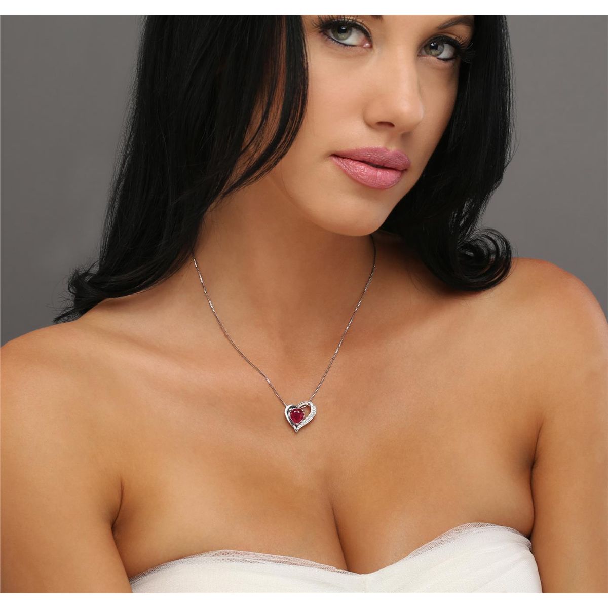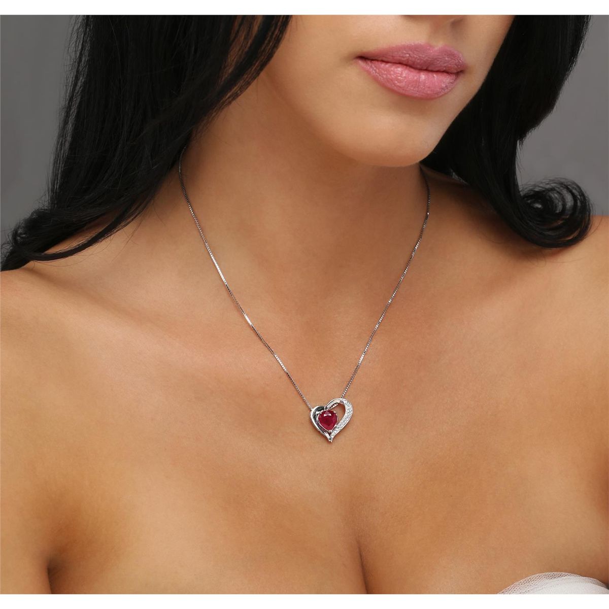 One electronically tested 14KT white gold ladies cast & assembled ruby and diamond pendant with chain. The pendant features a ruby set within a stylized diamond accented heart design, completed by a hidden bail. The pendant is supported by a sixteen inch length 14KT white gold designer style chain, terminating in a spring ring clasp. Bright polish finish. Condition is new, good workmanship. Containing: One prong set pear mixed cut natural ruby, measuring 8.90 x 7.89 x 4.75mm, 6% bulge factor, approximate weight of 2.83ct., clarity is heavily included, type II, dark, very slightly brownish, red color, (GIA R 7/3), cut is good. Transmitting light somewhat diffusely, transparent to translucent. Naturally occurring internal& external characteristics are present. Indications of heating with significant residues in fissures. GIA Ruby Report attached. Graded in the GIA Laboratory, Report #2161650533.Twenty-Five bead set round brilliant cut diamonds, measuring 1.30 - 1.20 x 0.75mm (depth est.) approximate total weight of 25 Stones = 0.27ct. Graded in the setting. Clarity: VVS-2 to VS-1. Color: G - I. Total Weight of Colored Stones 2.83ct. Total Weight of Diamonds 0.27ct. Total Weight of Pendant With Chain 5.32 grams. AIG Appraised at $2,800.00.