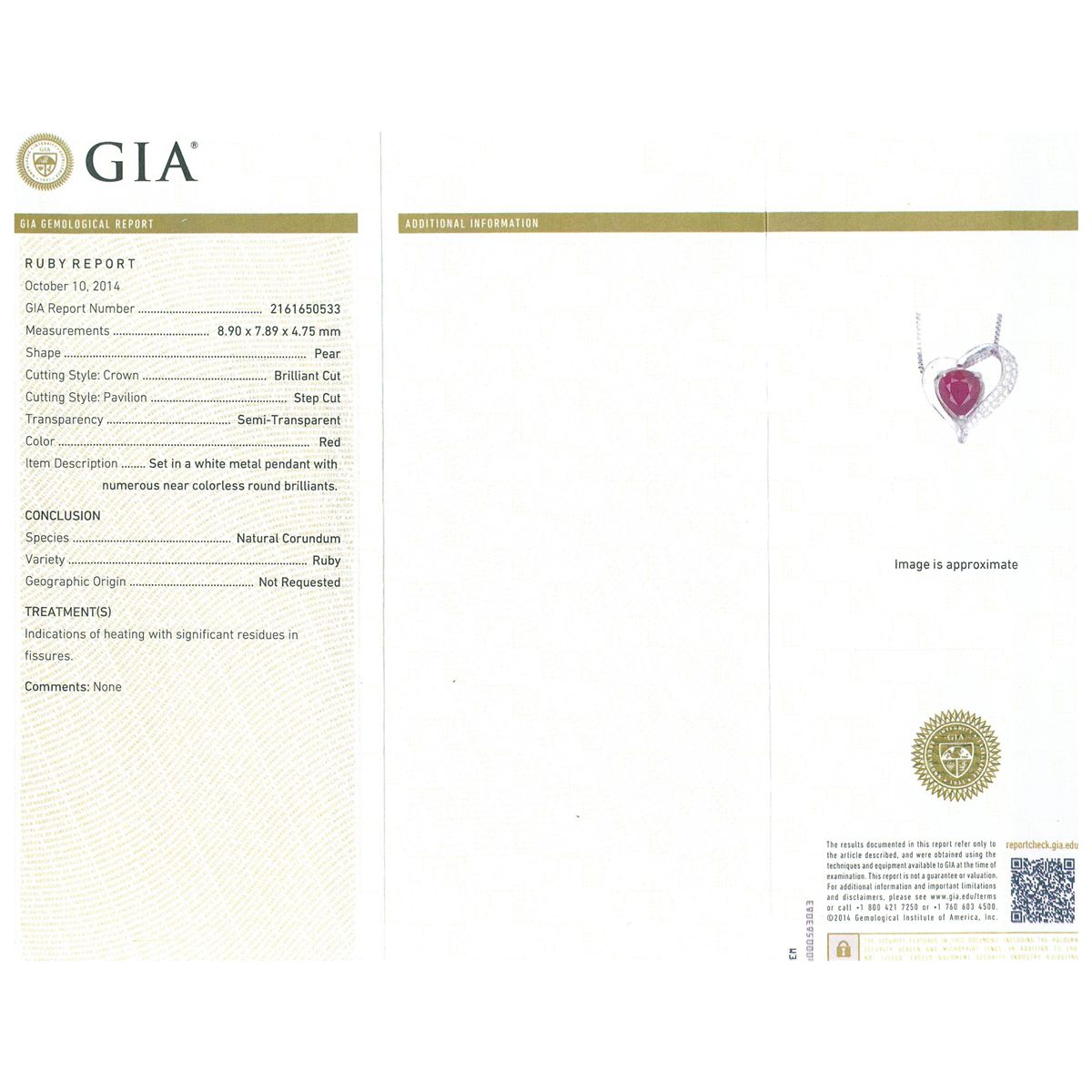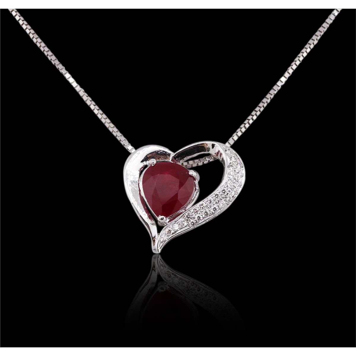 One electronically tested 14KT white gold ladies cast & assembled ruby and diamond pendant with chain. The pendant features a ruby set within a stylized diamond accented heart design, completed by a hidden bail. The pendant is supported by a sixteen inch length 14KT white gold designer style chain, terminating in a spring ring clasp. Bright polish finish. Condition is new, good workmanship. Containing: One prong set pear mixed cut natural ruby, measuring 8.90 x 7.89 x 4.75mm, 6% bulge factor, approximate weight of 2.83ct., clarity is heavily included, type II, dark, very slightly brownish, red color, (GIA R 7/3), cut is good. Transmitting light somewhat diffusely, transparent to translucent. Naturally occurring internal& external characteristics are present. Indications of heating with significant residues in fissures. GIA Ruby Report attached. Graded in the GIA Laboratory, Report #2161650533.Twenty-Five bead set round brilliant cut diamonds, measuring 1.30 - 1.20 x 0.75mm (depth est.) approximate total weight of 25 Stones = 0.27ct. Graded in the setting. Clarity: VVS-2 to VS-1. Color: G - I. Total Weight of Colored Stones 2.83ct. Total Weight of Diamonds 0.27ct. Total Weight of Pendant With Chain 5.32 grams. AIG Appraised at $2,800.00.