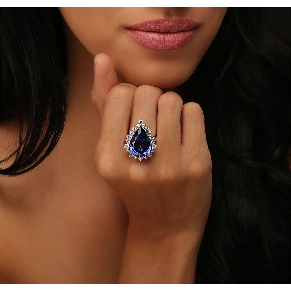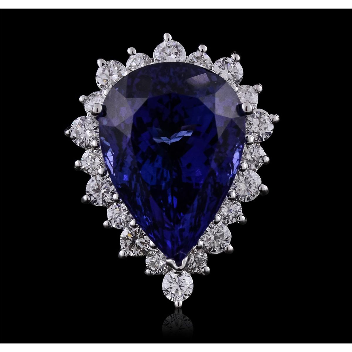 One electronically tested 14KT white gold ladies cast tanzanite and diamond ring with a bright polish finish. Condition is new, good workmanship. The featured tanzanite is set within a diamond bezel, completed by a two and one-half millimeter wide band. Identified with markings of "K14". Containing: One prong set pear modified brilliant cut natural tanzanite, measuring 19.57 x 14.21 x 11.83mm, exact weight 20.06ct., clarity is eye clean, type I, dark, moderately strong, violetish blue color, (GIA vB 7/4), cut is good. Transmitting light with no distortion, transparent. GIA Gemological Report attached. Graded loose prior to setting in the GIA Laboratory, Report #1166081703.Tanzanite is a very rare gemstone that is only found in the country of Tanzania. Originally discovered in 1967. Tiffany & Company, named the stone Tanzanite. It is found in the Usumburu Mountains that border the Umba Valley of northern Tanzania. Tanzanite occurs in gray, brown, violet, blue, reddish-purple, & green. The gem is interesting because of its exceptional pleochroism. Rotated in different directions a tanzanite will exhibit multiple changes of color. Tanzanite has a low tolerance to ultrasonic cleaning, and should not be cleaned using this method. Twenty prong set round brilliant cut diamonds, measuring 3.00 - 2.80 x 1.74mm (depth est.) approximate total weight of 20 Stones = 1.88ct. Graded in the setting. Clarity: SI-1 to I-1 . Color: G - I. Total Weight of Colored Stones 20.06ct. Total Weight of Diamonds 1.88ct. Total Weight of Ring 11.38 grams. AIGAppraised at $57,280.00.