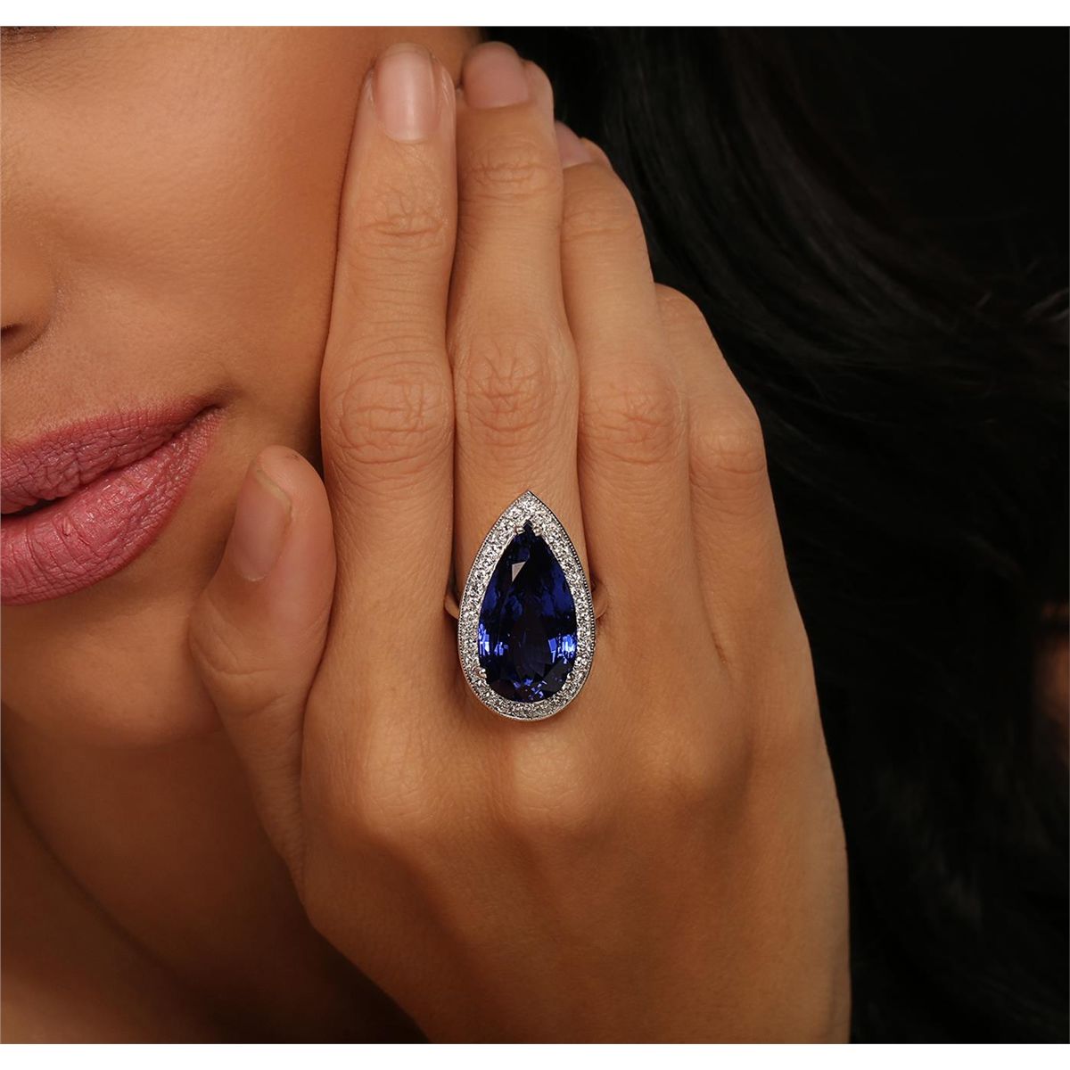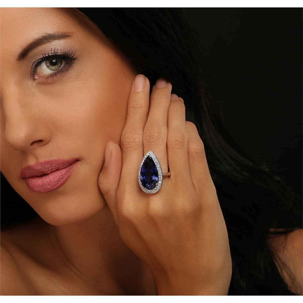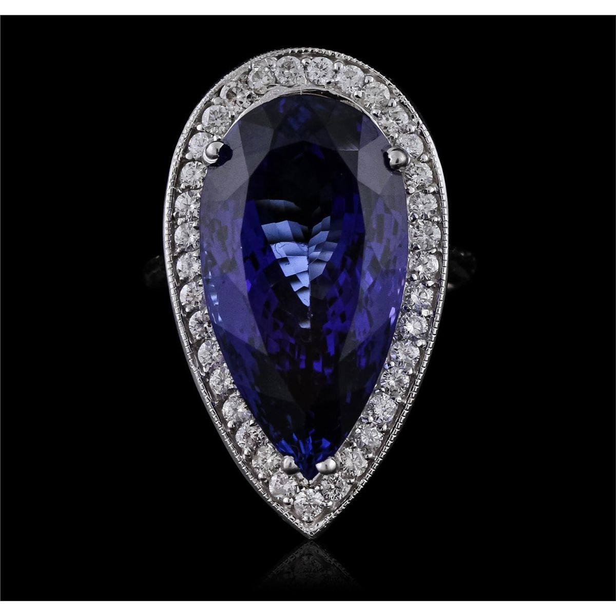 One electronically tested 14KT white gold ladies cast tanzanite and diamond ring with a bright polish finish. Condition is new, good workmanship. The featured tanzanite is set within a diamond bezel, completed by a three millimeter wide band. Bright polish finish with milgrain detailing. Identified with markings of "K14". Containing: One prong set pear modified brilliant cut natural tanzanite, measuring 22.82 x 12.41 x 10.01mm, exact weight 20.19ct., clarity is eye clean, type I, dark, moderately strong, violetish blue color, (GIA vB 7/4), cut is good. Transmitting light with no distortion, transparent. GIA Gemological Report attached. Graded loose prior to setting in the GIA Laboratory, Report #6167077758.Tanzanite is a very rare gemstone that is only found in the country of Tanzania. Originally discovered in 1967. Tiffany & Company, named the stone Tanzanite. It is found in the Usumburu Mountains that border the Umba Valley of northern Tanzania. Tanzanite occurs in gray, brown, violet, blue, reddish-purple, & green. The gem is interesting because of its exceptional pleochroism. Rotated in different directions a tanzanite will exhibit multiple changes of color. Tanzanite has a low tolerance to ultrasonic cleaning, and should not be cleaned using this method. Thirty-Five prong set round brilliant cut diamonds, measuring 1.80 - 1.70 x 1.05mm (depth est.) approximate total weight of 35 Stones = 0.78ct. Graded in the setting. Clarity: SI-1 to I-1 . Color: G - I. Total Weight of Colored Stones 20.19ct. Total Weight of Diamonds 0.78ct. Total Weight of Ring 12.63 grams. AIGAppraised at $54,725.00.