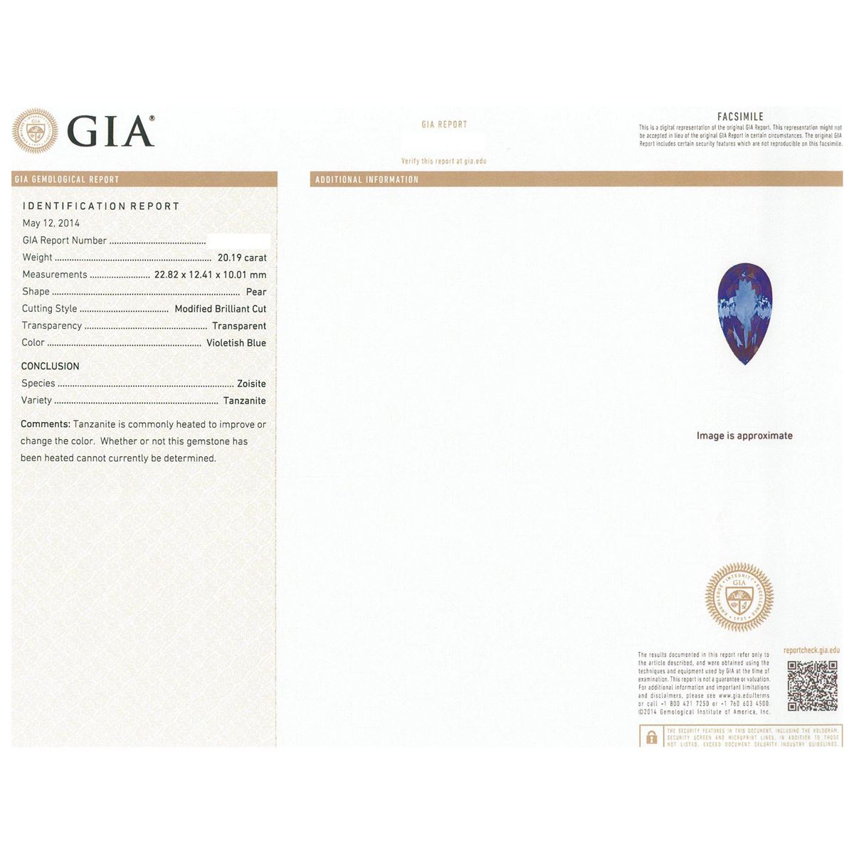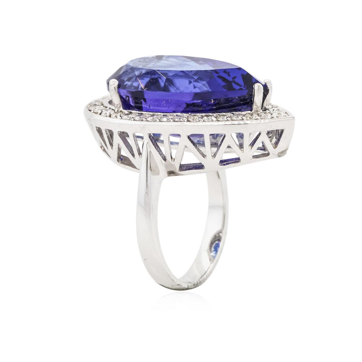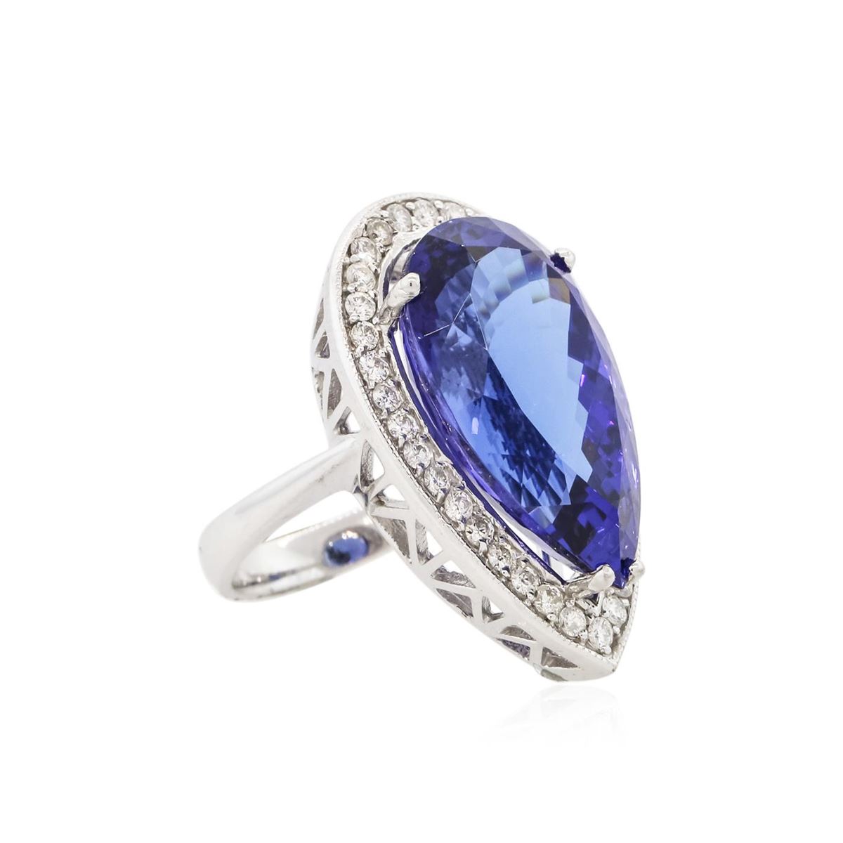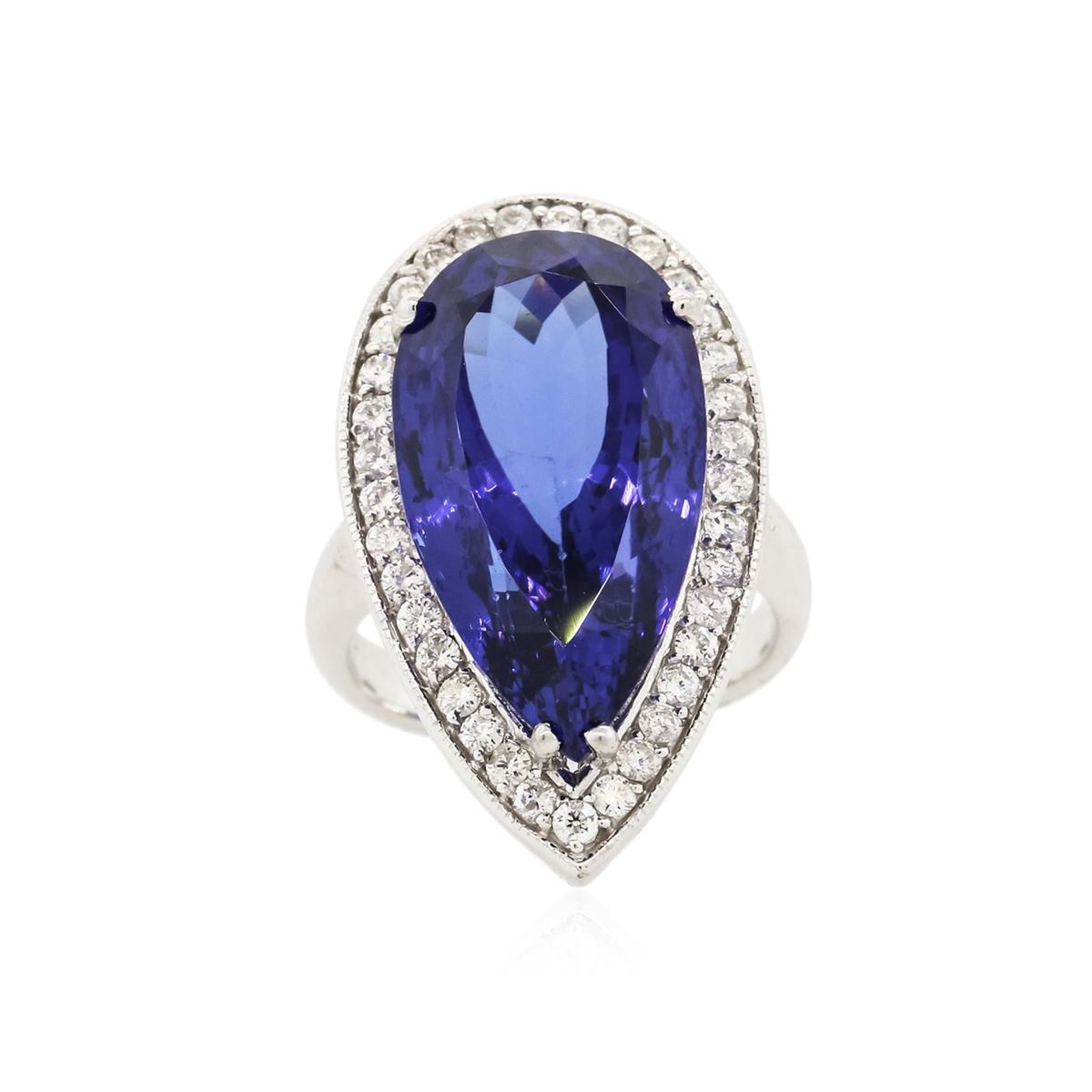 One electronically tested 14KT white gold ladies cast tanzanite and diamond ring with a bright polish finish. Condition is new, good workmanship. The featured tanzanite is set within a diamond bezel, completed by a three millimeter wide band. Bright polish finish with milgrain detailing. Identified with markings of "K14". Containing: One prong set pear modified brilliant cut natural tanzanite, measuring 22.82 x 12.41 x 10.01mm, exact weight 20.19ct., clarity is eye clean, type I, dark, moderately strong, violetish blue color, (GIA vB 7/4), cut is good. Transmitting light with no distortion, transparent. GIA Gemological Report attached. Graded loose prior to setting in the GIA Laboratory, Report #6167077758.Tanzanite is a very rare gemstone that is only found in the country of Tanzania. Originally discovered in 1967. Tiffany & Company, named the stone Tanzanite. It is found in the Usumburu Mountains that border the Umba Valley of northern Tanzania. Tanzanite occurs in gray, brown, violet, blue, reddish-purple, & green. The gem is interesting because of its exceptional pleochroism. Rotated in different directions a tanzanite will exhibit multiple changes of color. Tanzanite has a low tolerance to ultrasonic cleaning, and should not be cleaned using this method. Thirty-Five prong set round brilliant cut diamonds, measuring 1.80 - 1.70 x 1.05mm (depth est.) approximate total weight of 35 Stones = 0.78ct. Graded in the setting. Clarity: SI-1 to I-1 . Color: G - I. Total Weight of Colored Stones 20.19ct. Total Weight of Diamonds 0.78ct. Total Weight of Ring 12.63 grams. AIG Appraised at $54,725.00.