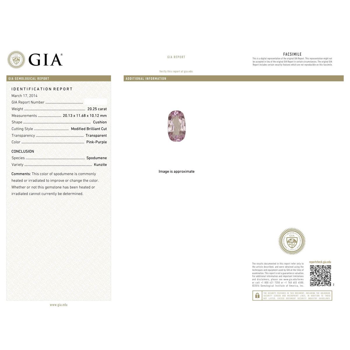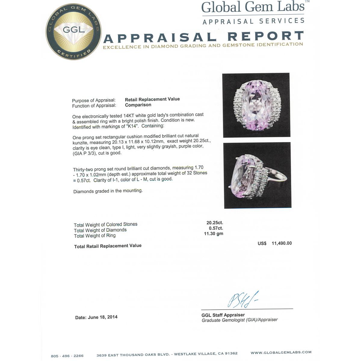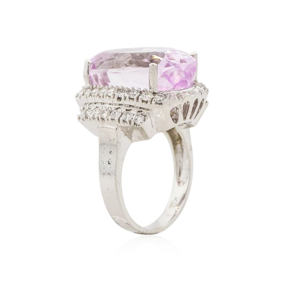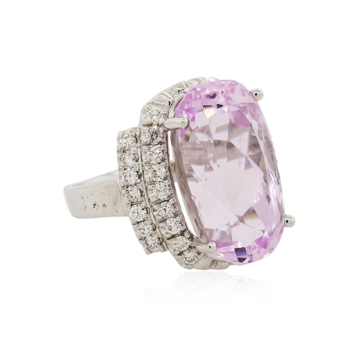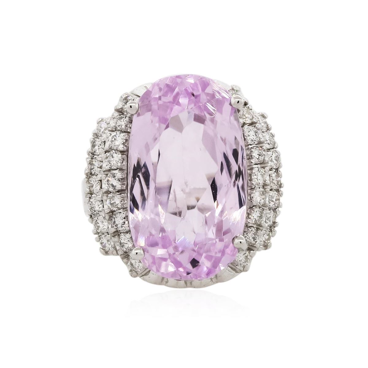 One electronically tested 14KT white gold Ladies combination cast & assembled ring with a bright polish finish. Condition is new. Identified with markings of "K14". Containing: One prong set rectangular cushion modified brilliant cut natural kunzite, measuring 20.13 x 11.68 x 10.12mm, exact weight 20.25ct., clarity is eye clean, type I, light, very slightly grayish, purple color, (GIA P 3/3), cut is good. GIA Report: 1156953488.Thirty-Two prong set round brilliant cut diamonds, measuring 1.70 - 1.70 x 1.02mm (depth est.) approximate. Total Weight of 32 Stones = 0.57ct. Clarity: I-1. Color: L - M, Cut is Good. Diamonds graded in the mounting. Total Weight of Colored Stones 20.25ct. Total Weight of Diamonds 0.57ct. Total Weight of Ring 11.30 grams. GGL Appraised at $11,490.00.