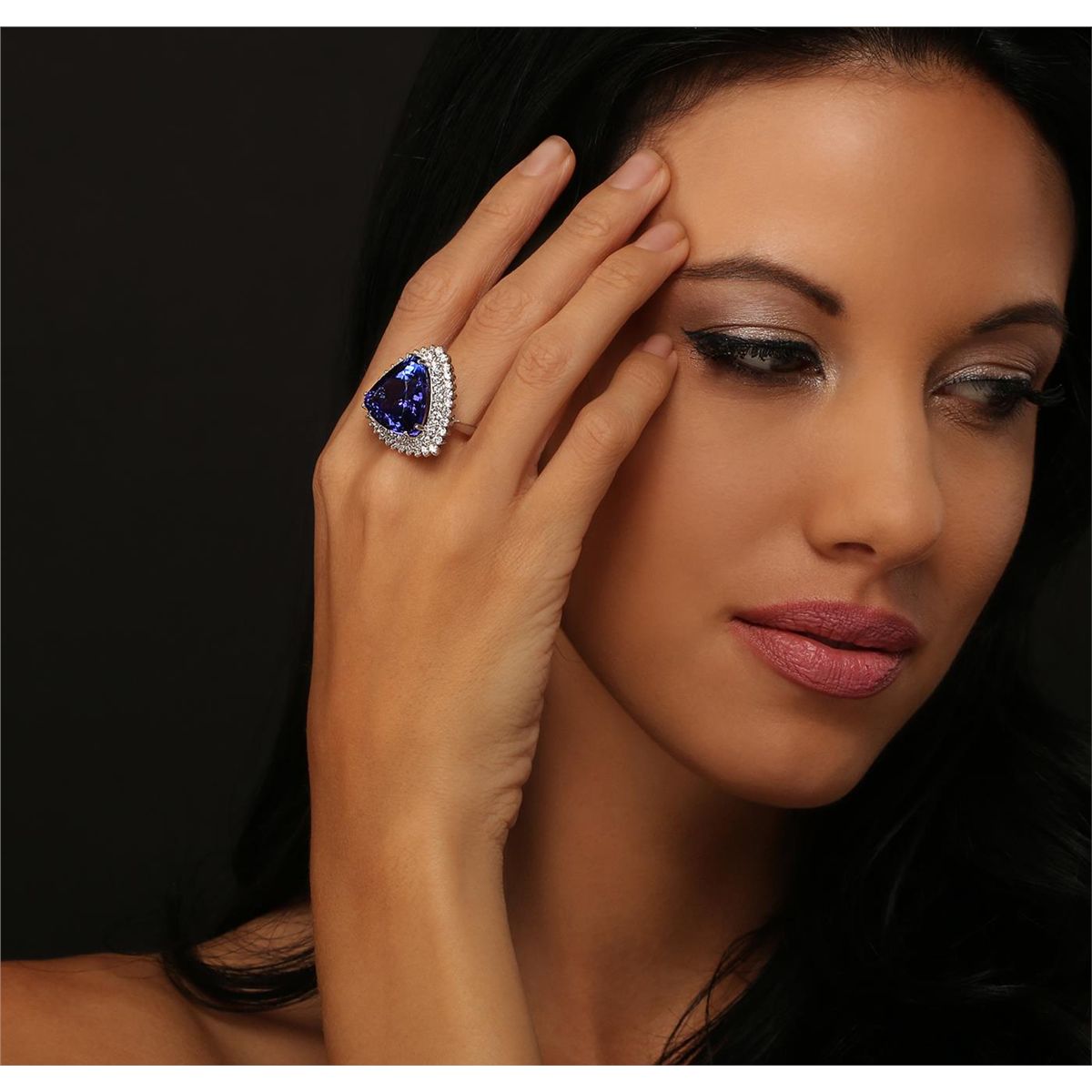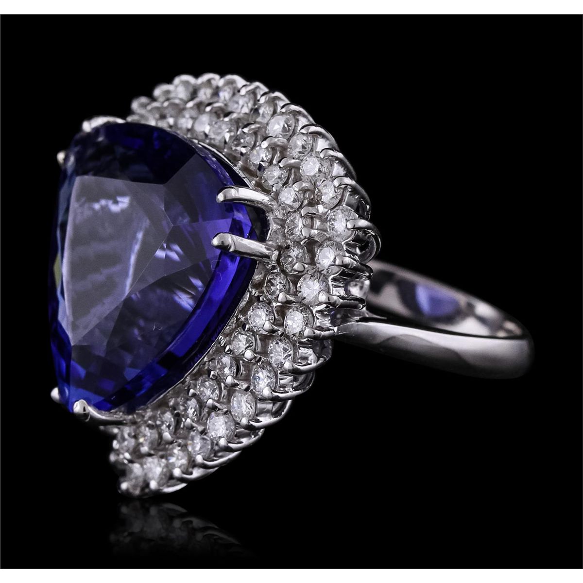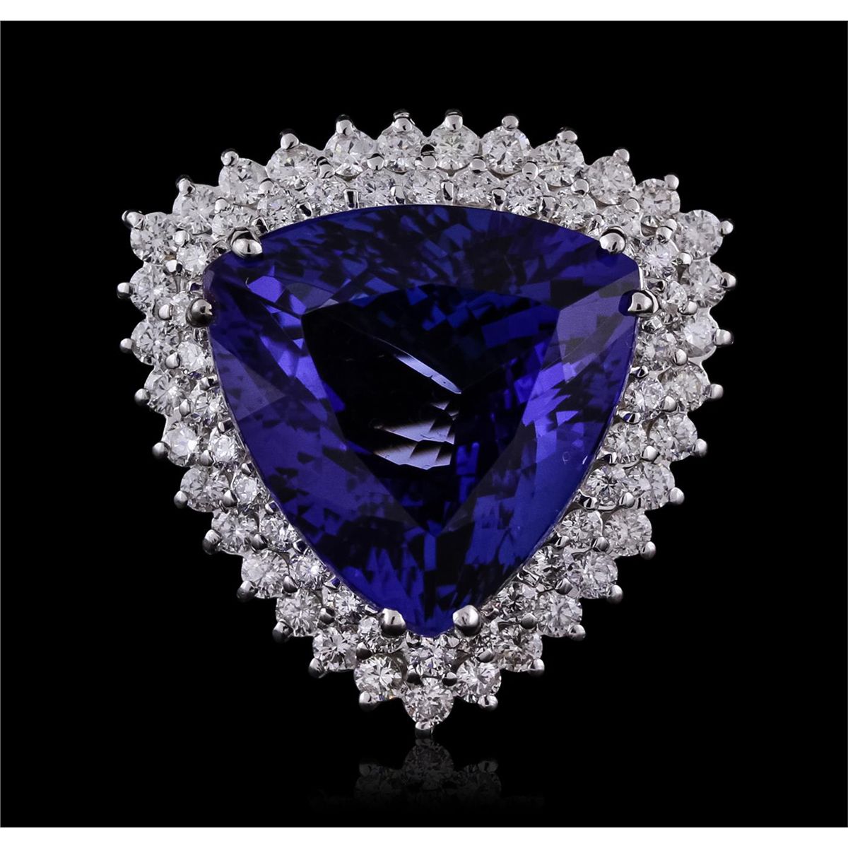 One electronically tested 14KT white gold ladies cast tanzanite and diamond ring with a bright polish finish. Condition is new, good workmanship. The featured tanzanite is set within a diamond lattice gallery, completed by a three millimeter wide band. Identified with markings of "K14". Containing: One prong set triangle modified brilliant cut natural tanzanite, measuring 18.31 x 18.16 x 10.05mm, exact weight 21.77ct., clarity is eye clean, type I, medium dark, moderately strong, violetish blue color, (GIA vB 6/4), cut is good. Transmitting light with no distortion, transparent. GIA Gemological Report attached. Graded loose prior to setting in the GIA Laboratory, Report # 2161097919.Tanzanite is a very rare gemstone that is only found in the country of Tanzania. Originally discovered in 1967. Tiffany & Company, named the stone Tanzanite. It is found in the Usumburu Mountains that border the Umba Valley of northern Tanzania. Tanzanite occurs in gray, brown, violet, blue, reddish-purple, & green. The gem is interesting because of its exceptional pleochroism. Rotated in different directions a tanzanite will exhibit multiple changes of color. Tanzanite has a low tolerance to ultrasonic cleaning, and should not be cleaned using this method. Sixty-Three prong set round brilliant cut diamonds, measuring 2.10 - 2.00 x 1.23mm (depth est.) approximate total weight of 63 Stones = 2.08ct. Graded in the setting. Clarity: SI-2 to I-2 . Color: F - H. Total Weight of Colored Stones 21.77ct. Total Weight of Diamonds 2.08ct. Total Weight of Ring 14.30 grams. AIGAppraised at $66,525.00.