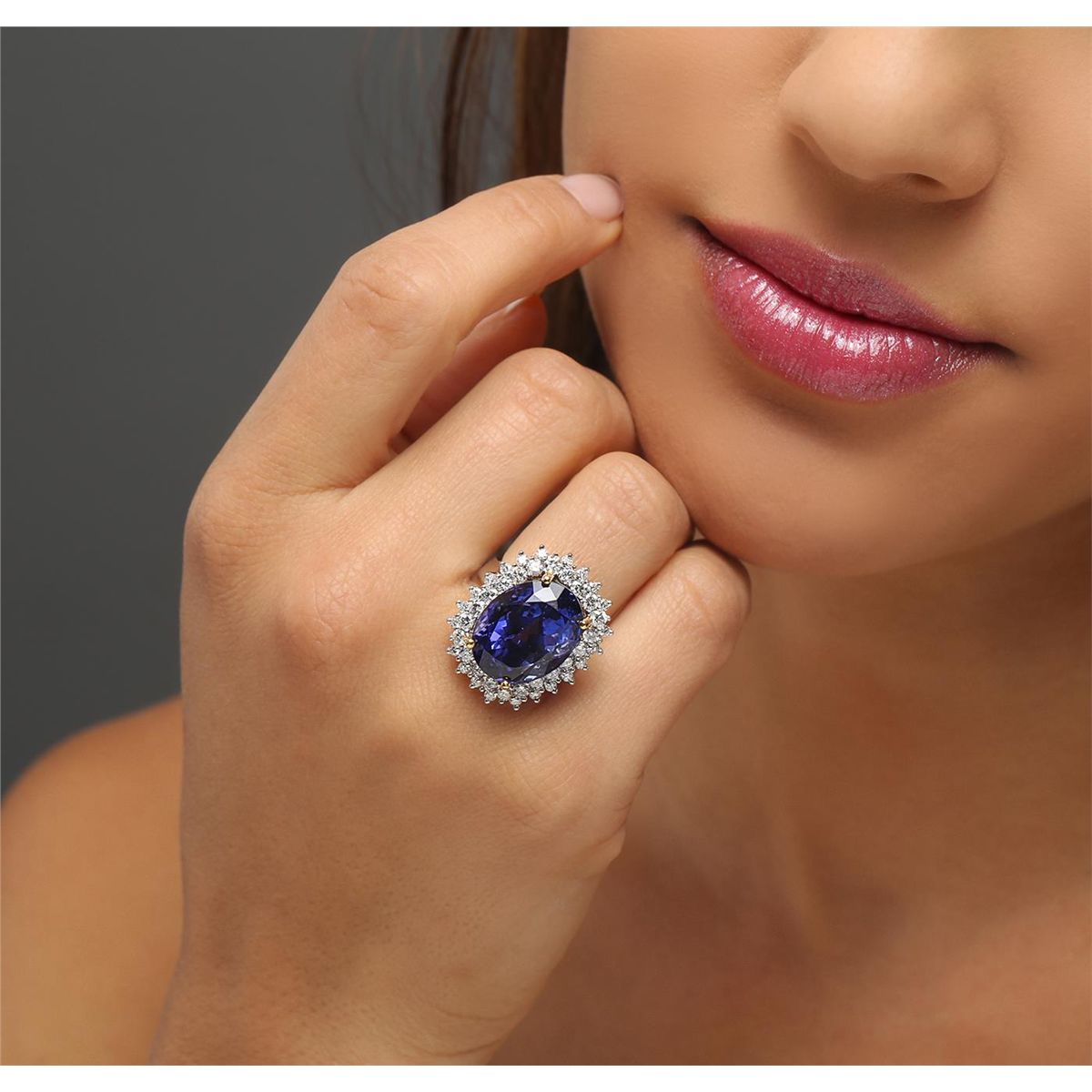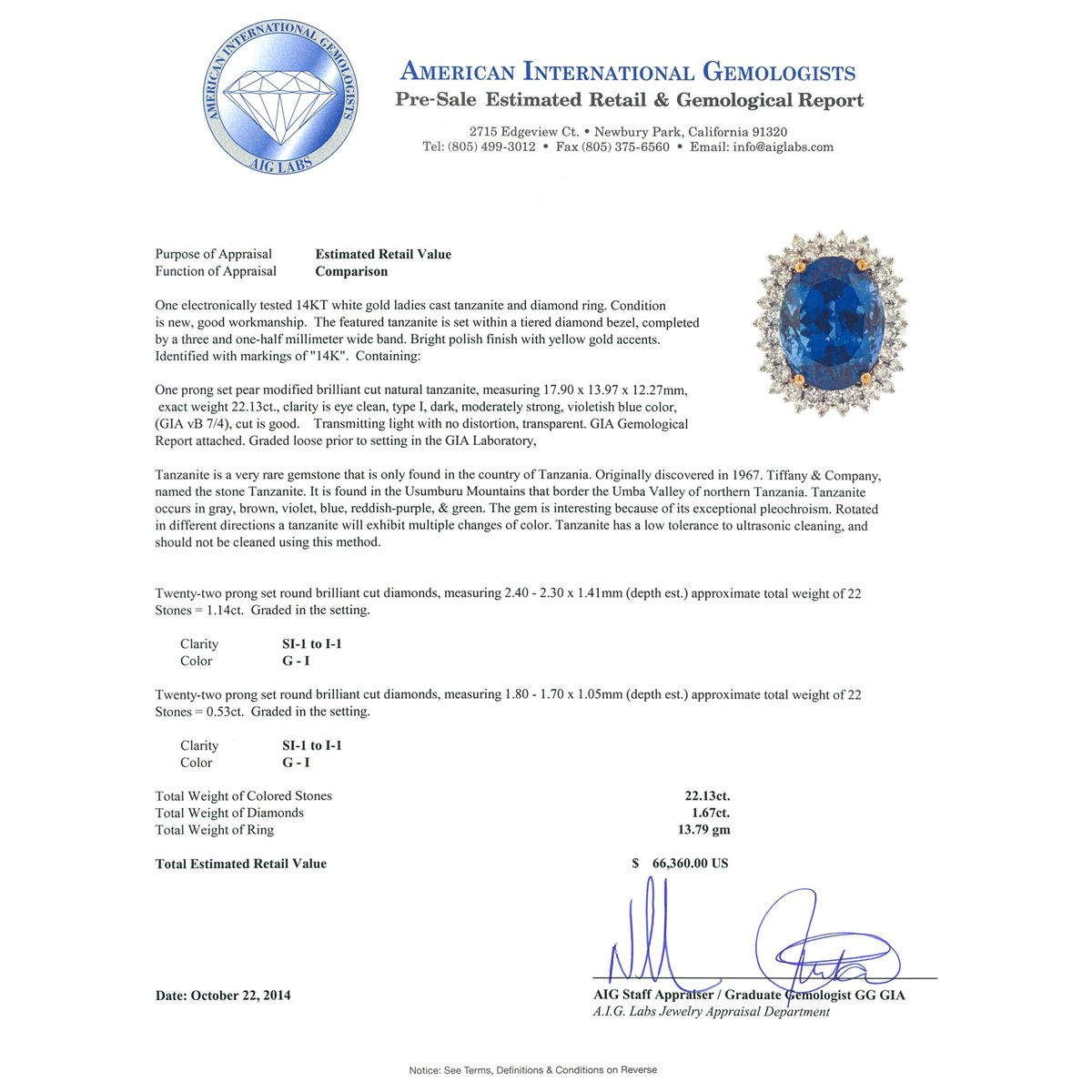 One electronically tested 14KT white gold ladies cast tanzanite and diamond ring. The featured tanzanite is set within a tiered diamond bezel, completed by a three and one-half millimeter wide band. Bright polish finish with yellow gold accents. Identified with markings of 14K. Condition is new, good workmanship. Containing: One prong set pear modified brilliant cut natural tanzanite, measuring 17.90 x 13.97 x 12.27mm, exact weight 22.13ct., clarity is eye clean, type I, dark, moderately strong, violetish blue color, (GIA vB 7/4), cut is good. Transmitting light with no distortion, transparent. GIA Gemological Report attached. Graded loose prior to setting in the GIA Laboratory, Report #1166542805.Tanzanite is a very rare gemstone that is only found in the country of Tanzania. Originally discovered in 1967. Tiffany & Company, named the stone Tanzanite. It is found in the Usumburu Mountains that border the Umba Valley of northern Tanzania. Tanzanite occurs in gray, brown, violet, blue, reddish-purple, & green. The gem is interesting because of its exceptional pleochroism. Rotated in different directions a tanzanite will exhibit multiple changes of color. Tanzanite has a low tolerance to ultrasonic cleaning, and should not be cleaned using this method. Twenty-Two prong set round brilliant cut diamonds, measuring 2.40 - 2.30 x 1.41mm (depth est.) approximate total weight of 22 Stones = 1.14ct. Graded in the setting. Clarity: SI-1 to I-1. Color: G - I Twenty-Two prong set round brilliant cut diamonds, measuring 1.80 - 1.70 x 1.05mm (depth est.) approximate total weight of 22 Stones = 0.53ct. Graded in the setting. Clarity: SI-1 to I-1. Color: G - I. Total Weight of Colored Stones 22.13ct. Total Weight of Diamonds 1.67ct. Total Weight of Ring 13.79 grams. AIG Appraised at $66,360.00.