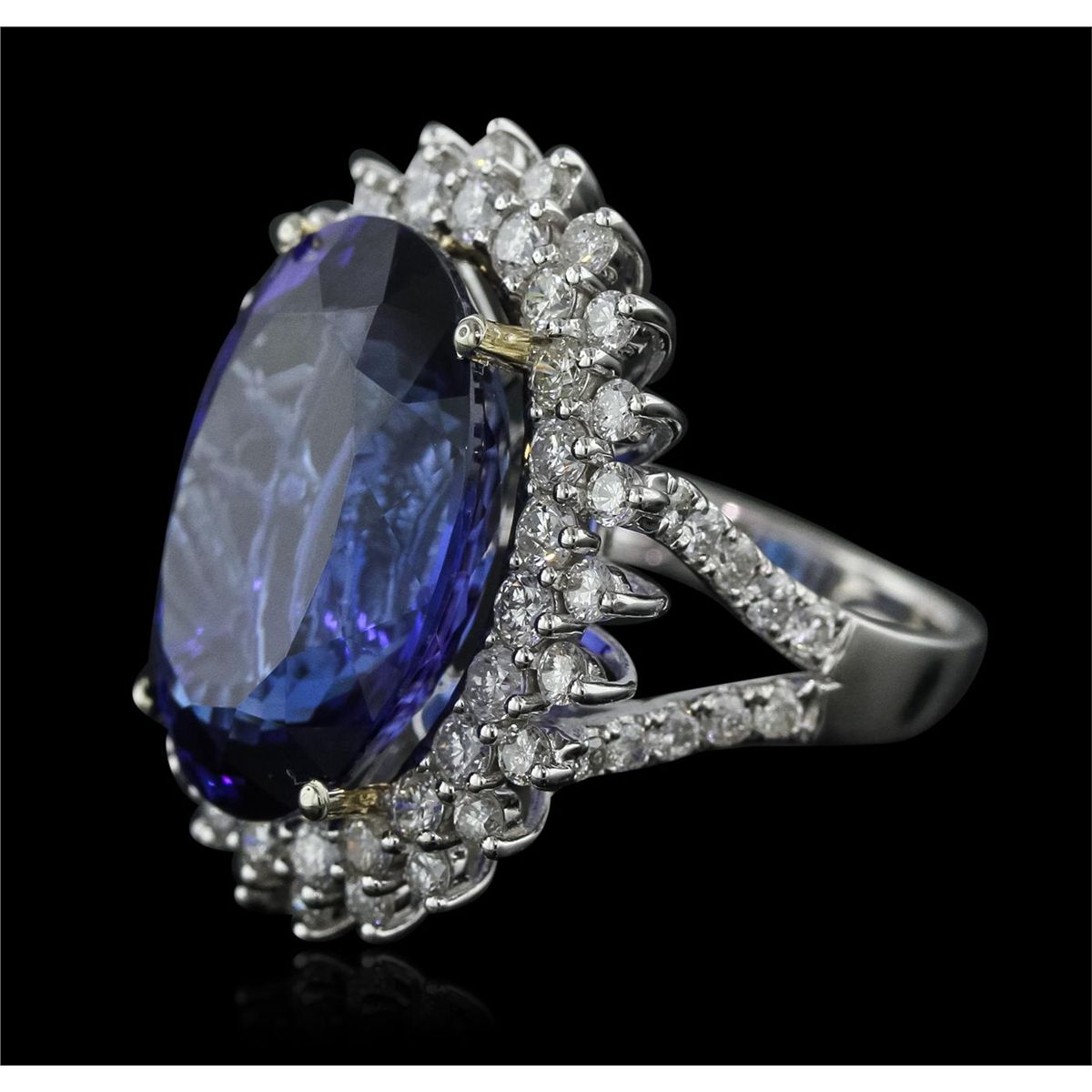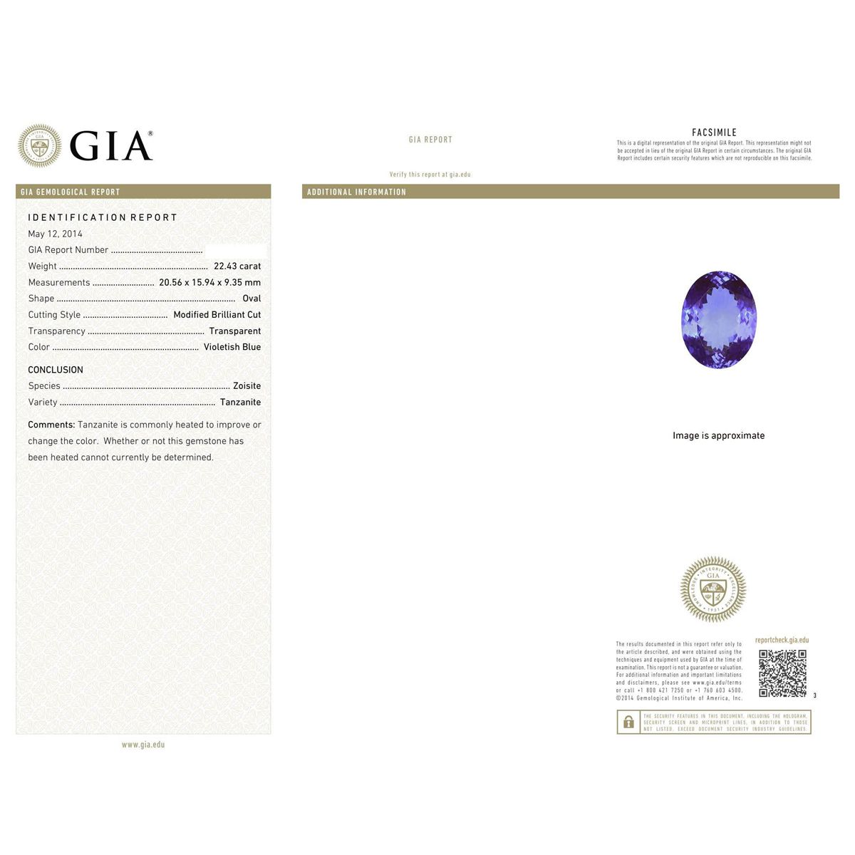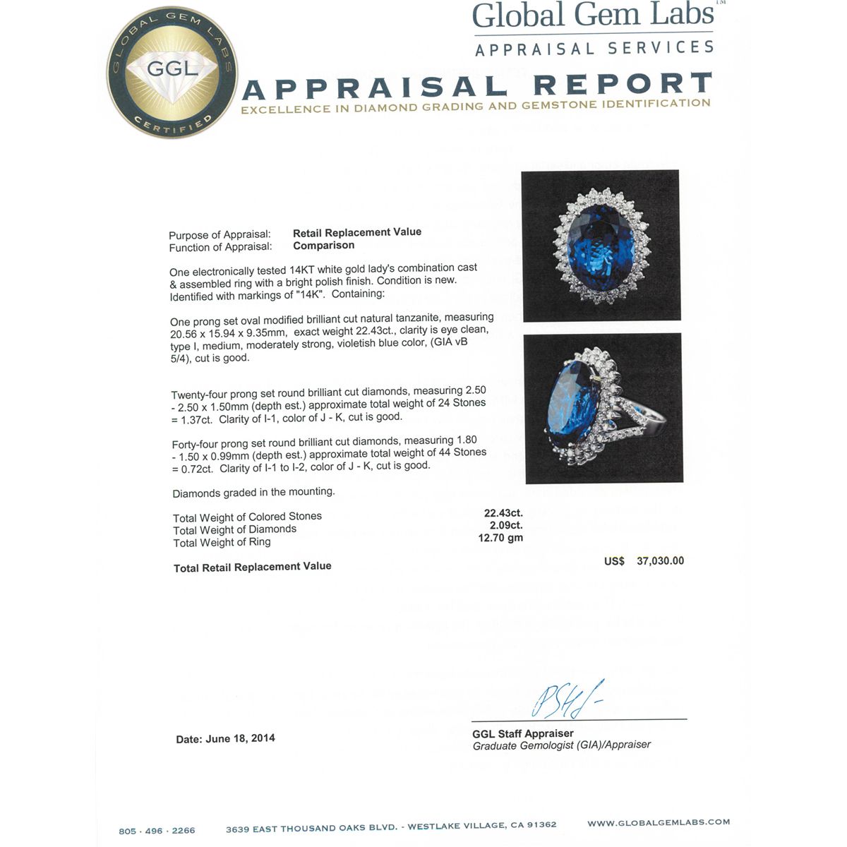 One electronically tested 14KT white gold Ladies combination cast & assembled ring with a bright polish finish. Condition is new. Identified with markings of "14K". Containing: One prong set oval modified brilliant cut natural tanzanite, measuring 20.56 x 15.94 x 9.35mm, exact weight 22.43ct., clarity is eye clean, type I, medium, moderately strong, violetish blue color, (GIA vB 5/4), cut is good. GIA Report: 216077781.Twenty-Four prong set round brilliant cut diamonds, measuring 2.50 - 2.50 x 1.50mm (depth est.) approximate. Total Weight of 24 Stones = 1.37ct. Clarity: I-1. Color: J - K, Cut is Good. Forty-Four prong set round brilliant cut diamonds, measuring 1.80 - 1.50 x 0.99mm (depth est.) approximate. Total Weight of 44 Stones = 0.72ct. Clarity: I-1 to I-2. Color: J - K, Cut is Good. Diamonds graded in the mounting. Total Weight of Colored Stones 22.43ct. Total Weight of Diamonds 2.09ct. Total Weight of Ring 12.70 grams. GGLAppraised at $37,030.00.