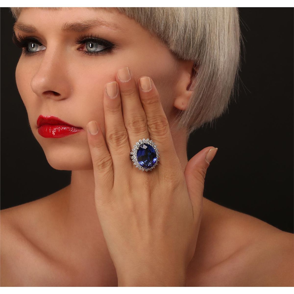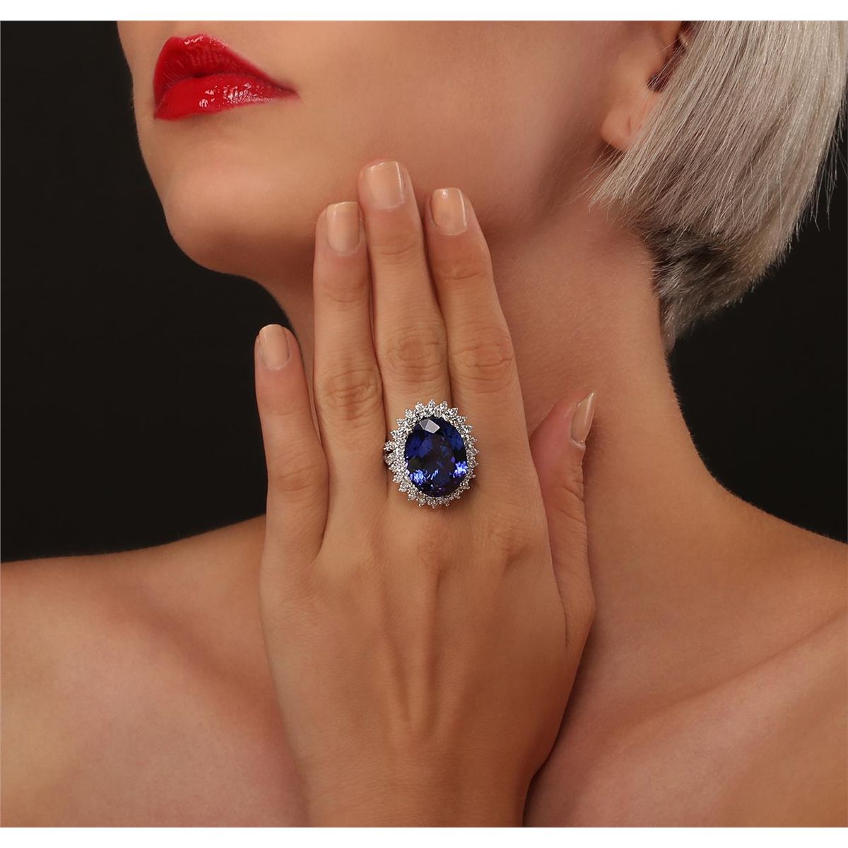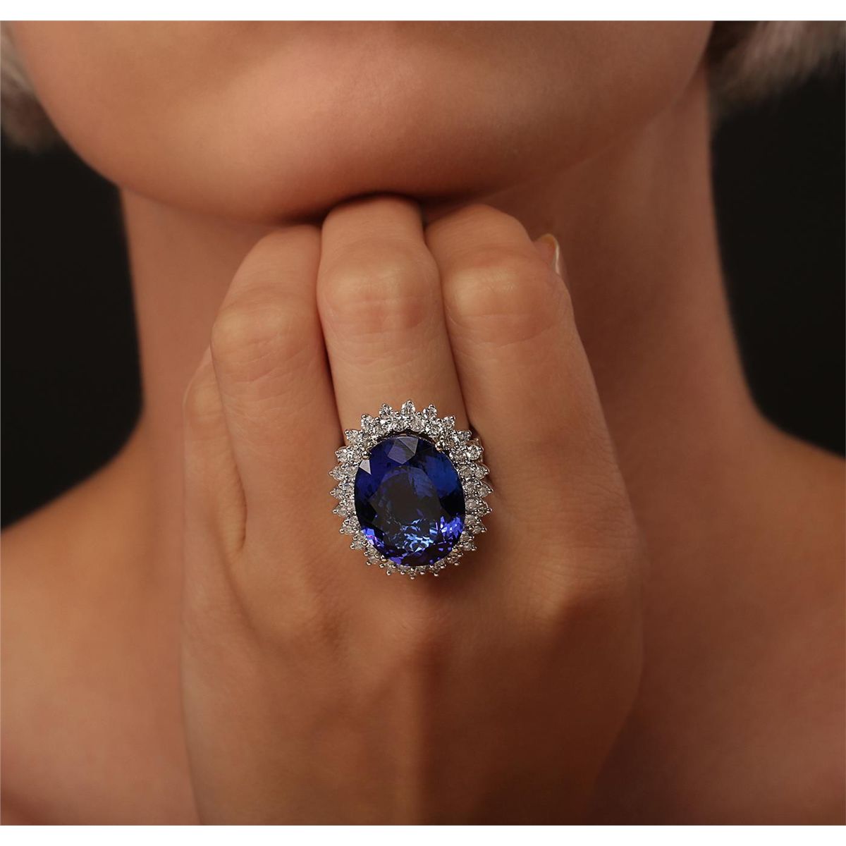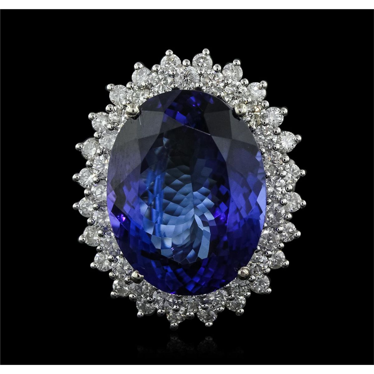 One electronically tested 14KT white gold Ladies combination cast & assembled ring with a bright polish finish. Condition is new. Identified with markings of "14K". Containing: One prong set oval modified brilliant cut natural tanzanite, measuring 20.56 x 15.94 x 9.35mm, exact weight 22.43ct., clarity is eye clean, type I, medium, moderately strong, violetish blue color, (GIA vB 5/4), cut is good. GIA Report: 216077781.Twenty-Four prong set round brilliant cut diamonds, measuring 2.50 - 2.50 x 1.50mm (depth est.) approximate. Total Weight of 24 Stones = 1.37ct. Clarity: I-1. Color: J - K, Cut is Good. Forty-Four prong set round brilliant cut diamonds, measuring 1.80 - 1.50 x 0.99mm (depth est.) approximate. Total Weight of 44 Stones = 0.72ct. Clarity: I-1 to I-2. Color: J - K, Cut is Good. Diamonds graded in the mounting. Total Weight of Colored Stones 22.43ct. Total Weight of Diamonds 2.09ct. Total Weight of Ring 12.70 grams. GGLAppraised at $37,030.00.