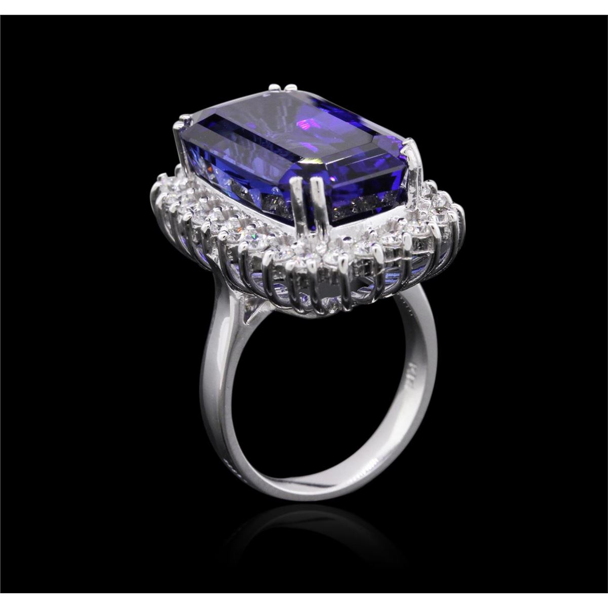 One electronically tested 14KT white gold ladies cast tanzanite and diamond ring with a bright polish finish. The featured tanzanite is set within a diamond bezel, completed by a three and one-half millimeter wide band. Identified with markings of "K14". Condition is new, good workmanship. Containing: One prong set octagonal modified step cut natural tanzanite, measuring 19.62 x 12.55 x 9.81mm, exact weight 22.54ct., clarity is eye clean, type I, dark, moderately strong, violetish blue color, (GIA vB 7/4), cut is good. Transmitting light with no distortion, transparent. GIA Gemological Report attached. Graded loose prior to setting in the GIA Laboratory, Report #6167542862.Tanzanite is a very rare gemstone that is only found in the country of Tanzania. Originally discovered in 1967. Tiffany & Company, named the stone Tanzanite. It is found in the Usumburu Mountains that border the Umba Valley of northern Tanzania. Tanzanite occurs in gray, brown, violet, blue, reddish-purple, & green. The gem is interesting because of its exceptional pleochroism. Rotated in different directions a tanzanite will exhibit multiple changes of color. Tanzanite has a low tolerance to ultrasonic cleaning, and should not be cleaned using this method. Twenty-Six prong set round brilliant cut diamonds, measuring 2.40 - 2.30 x 1.41mm (depth est.) approximate total weight of 26 Stones = 1.33ct. Graded in the setting. Clarity: SI-1 to I-1. Color: G - I. Total Weight of Colored Stones 22.54ct. Total Weight of Diamonds 1.33ct. Total Weight of Ring 13.63 grams. AIG Appraised at $66,470.00.