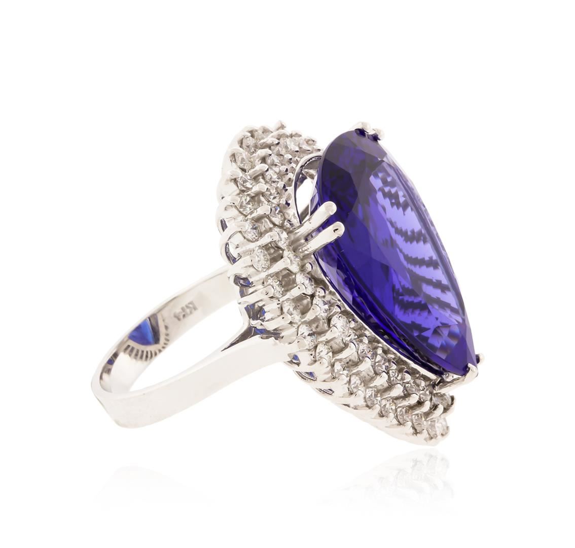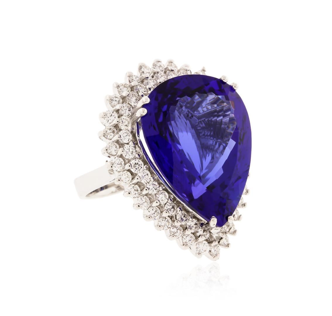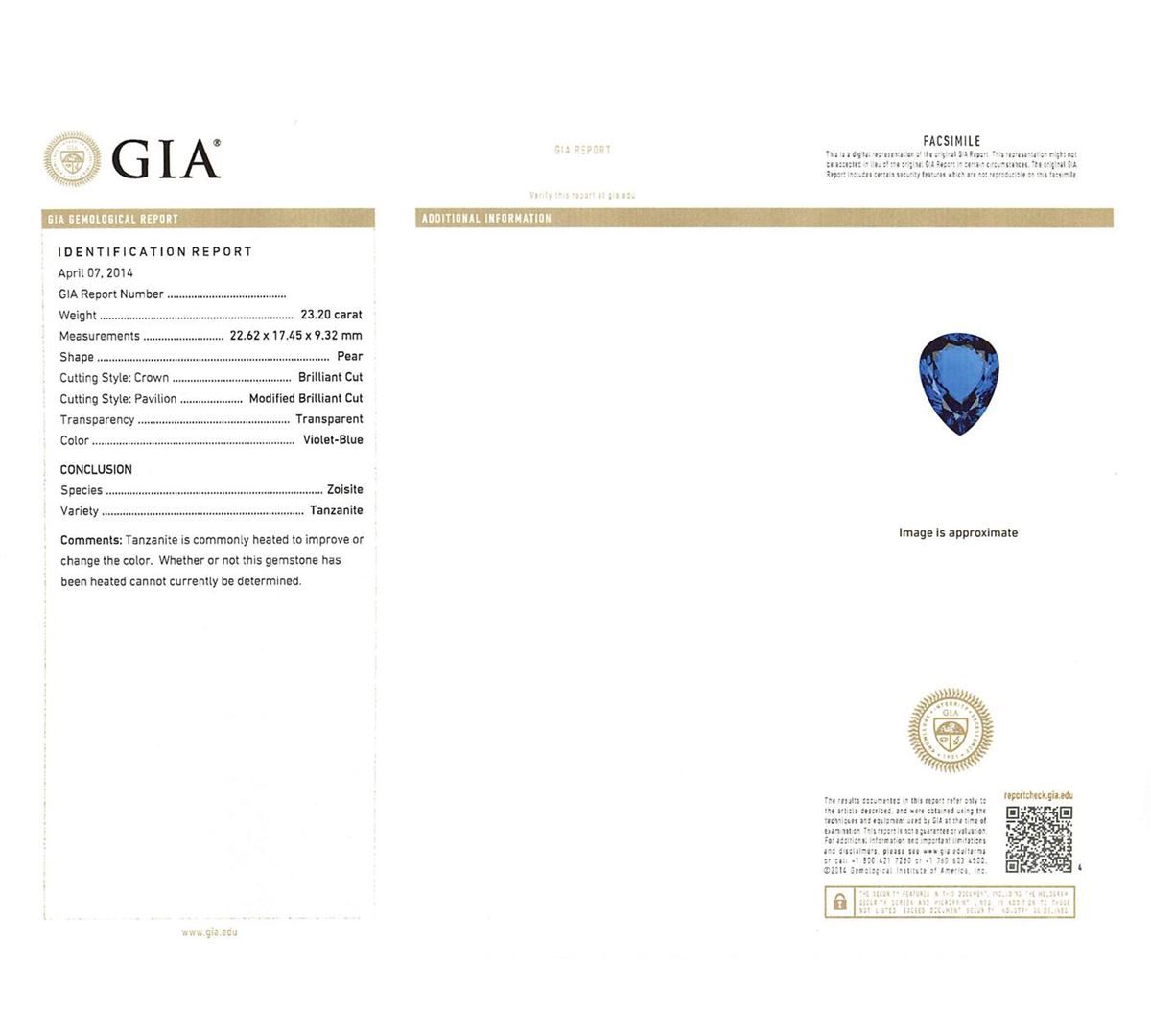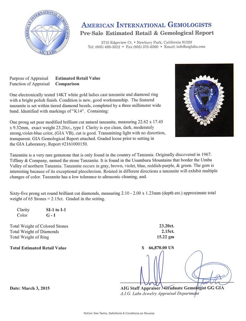 One electronically tested 14KT white gold ladies cast tanzanite and diamond ring with a bright polish finish. The featured tanzanite is set within tiered diamond bezels, completed by a three millimeter wide band. Identified with markings of "K14". Condition is new, good workmanship. Containing: One prong set pear modified brilliant cut natural tanzanite, measuring 22.62 x 17.45 x 9.32mm, exact weight 23.20ct., type I Clarity is eye clean, dark, moderately strong, violet-blue color, (GIA VB), cut is good. Transmitting light with no distortion, transparent. GIA Gemological Report attached. Graded loose prior to setting in the GIA Laboratory, Report #2161000150.Tanzanite is a very rare gemstone that is only found in the country of Tanzania. Originally discovered in 1967. Tiffany & Company, named the stone Tanzanite. It is found in the Usumburu Mountains that border the Umba Valley of northern Tanzania. Tanzanite occurs in gray, brown, violet, blue, reddish-purple, & green. The gem is interesting because of its exceptional pleochroism. Rotated in different directions a tanzanite will exhibit multiple changes of color. Tanzanite has a low tolerance to ultrasonic cleaning. Sixty-Five prong set round brilliant cut diamonds, measuring 2.10 - 2.00 x 1.23mm (depth est.) approximate total weight of 65 Stones = 2.15ct. Graded in the setting. Clarity: SI-1 to I-1. Color: G - I. Total Weight of Colored Stones 23.20ct. Total Weight of Diamonds 2.15ct. Total Weight of Ring 15.22 grams. AIG Appraised at $66,870.00.